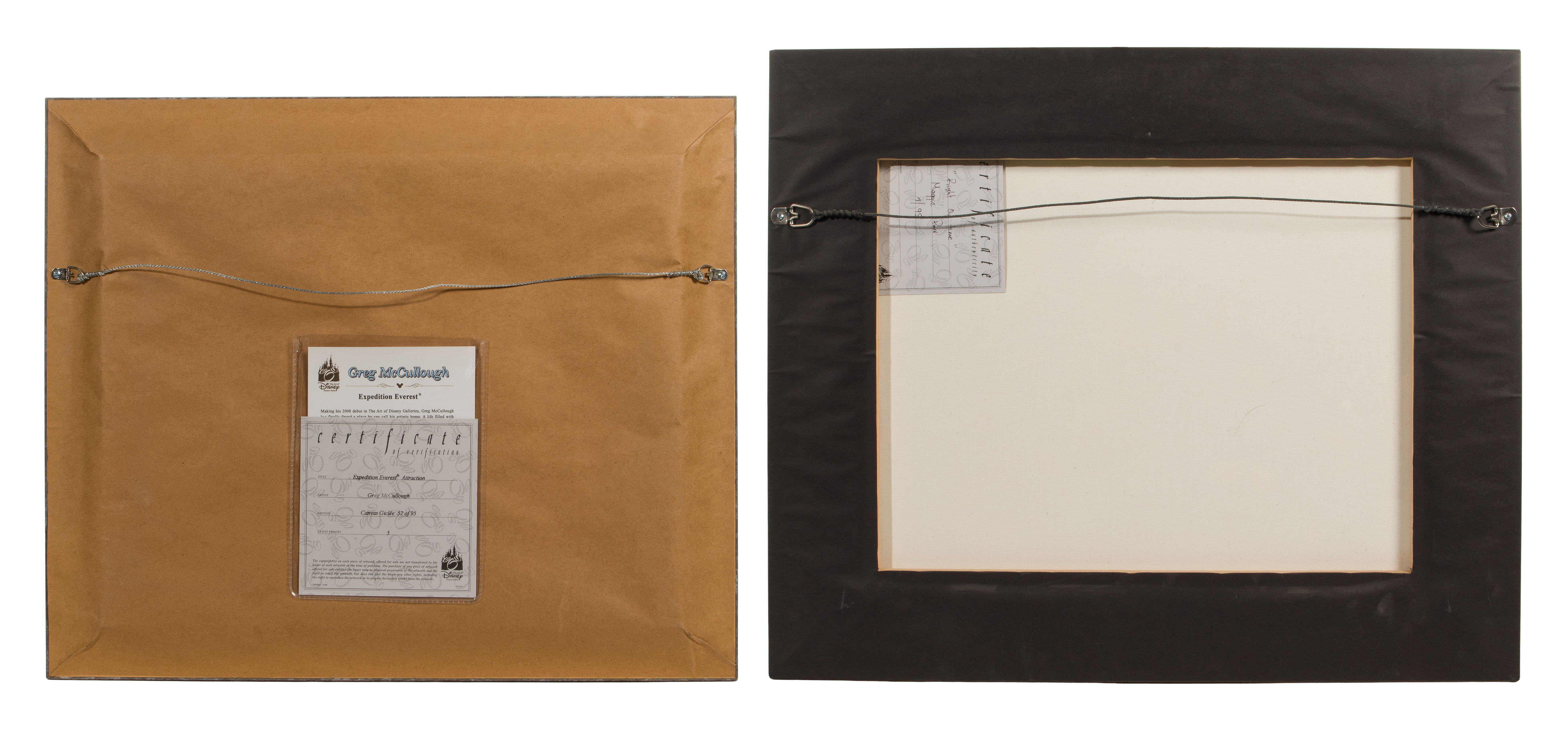 (2) items including ‘Right on Time’, #4/95, signed ‘Maggie Parr’, depicting Disney characters in the Train Station and a 2010 ‘Expedition Express’, #52/95, signed ‘Greg McCullough’ depicting Mickey and Minnie riding in a cart pulled by Donald Duck, both having title plaques, in wood frames