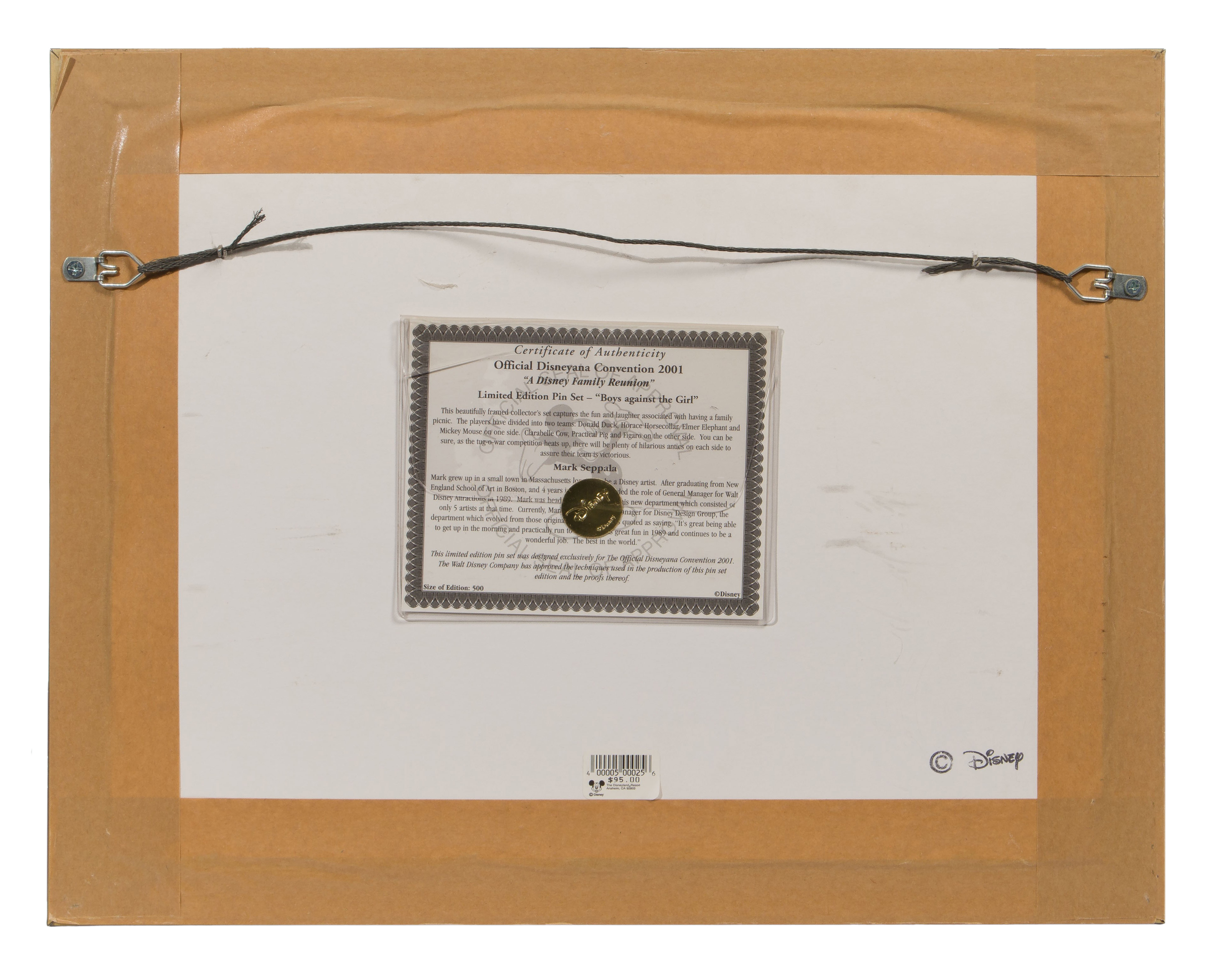 (5) items including a 2001 framed Disneyana Convention ‘Boys Against Girls’ signed ‘Mark Seppala’ having pins, a round boxed set of ‘GenEARation’ pins, a ‘Florida Project’ jumbo pin in box, a 2007 Mickey Mouse on his train jumbo pin in box and a boxed set of Mickey Mouse Club ‘Days of the Week’