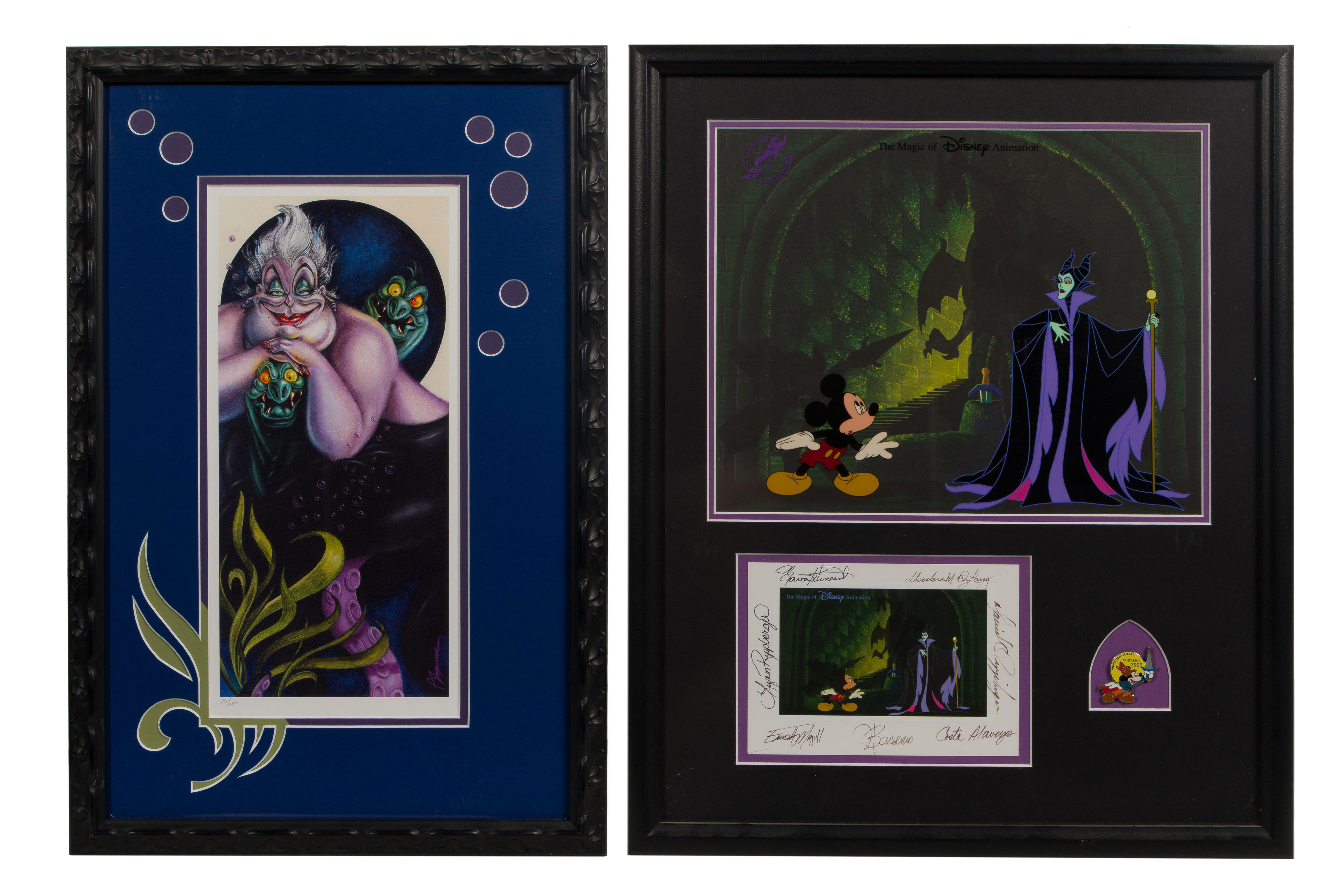 (2) total items including the 2001 Emmerich giclee, signed lower right, #131/300, having COA verso; together with a Mickey Mouse and Maleficent serigraph, signed card and pin, both matted under acrylic in wood frames