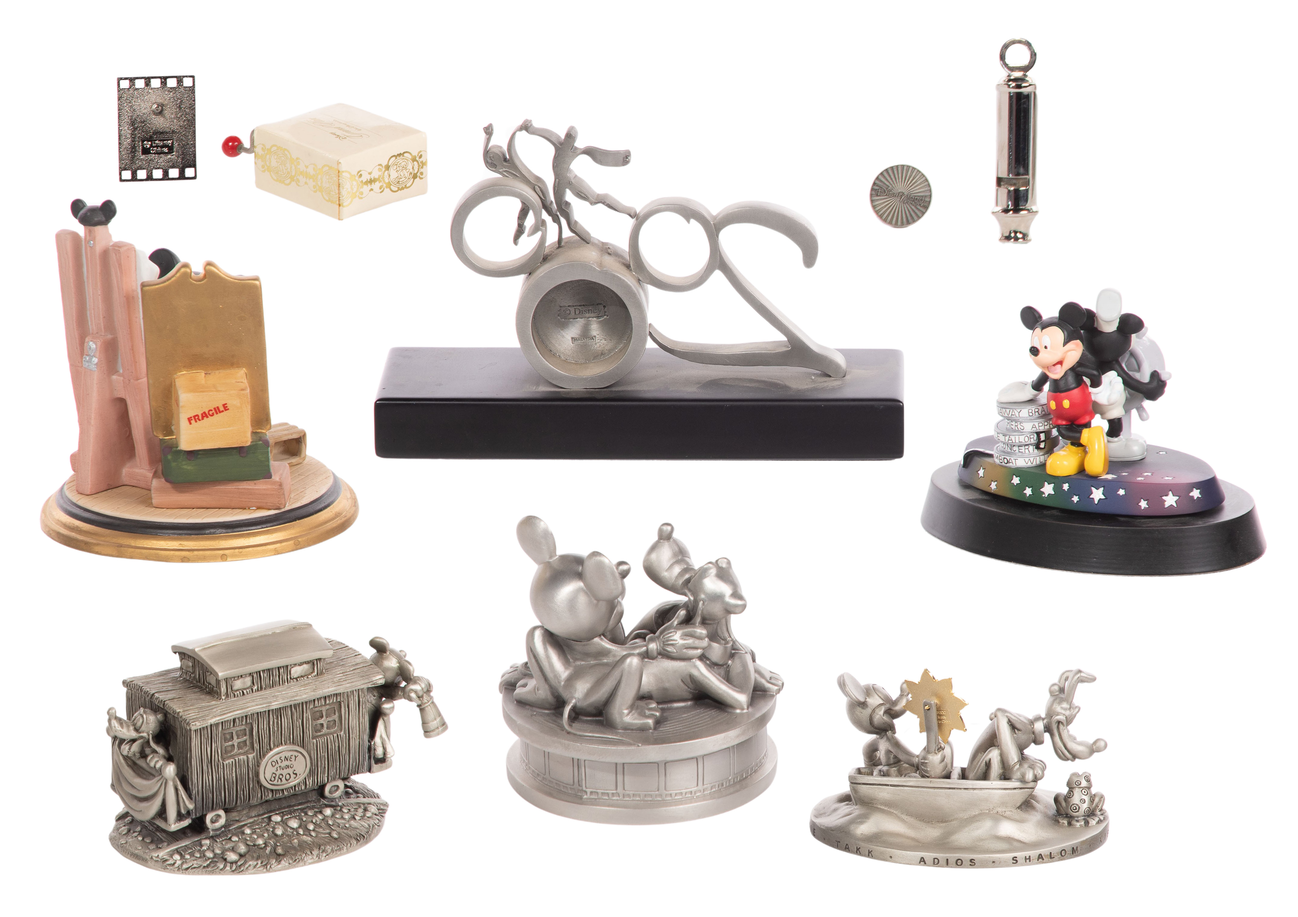 Including a 2001 Family Reunion metal freight car trinket having a whistle, coin and base, a 2000 ‘Au Revoir’ metal sculpture, a 1998 convention Mickey and Pluto metal lidded trinket box having Walt Disney pin inside, a 2000 ‘Grand Plan’ desk clock, a Steamboat Willie clock, a Mickey painting, Walt Disney figurine and ‘Grand Plan’ music box