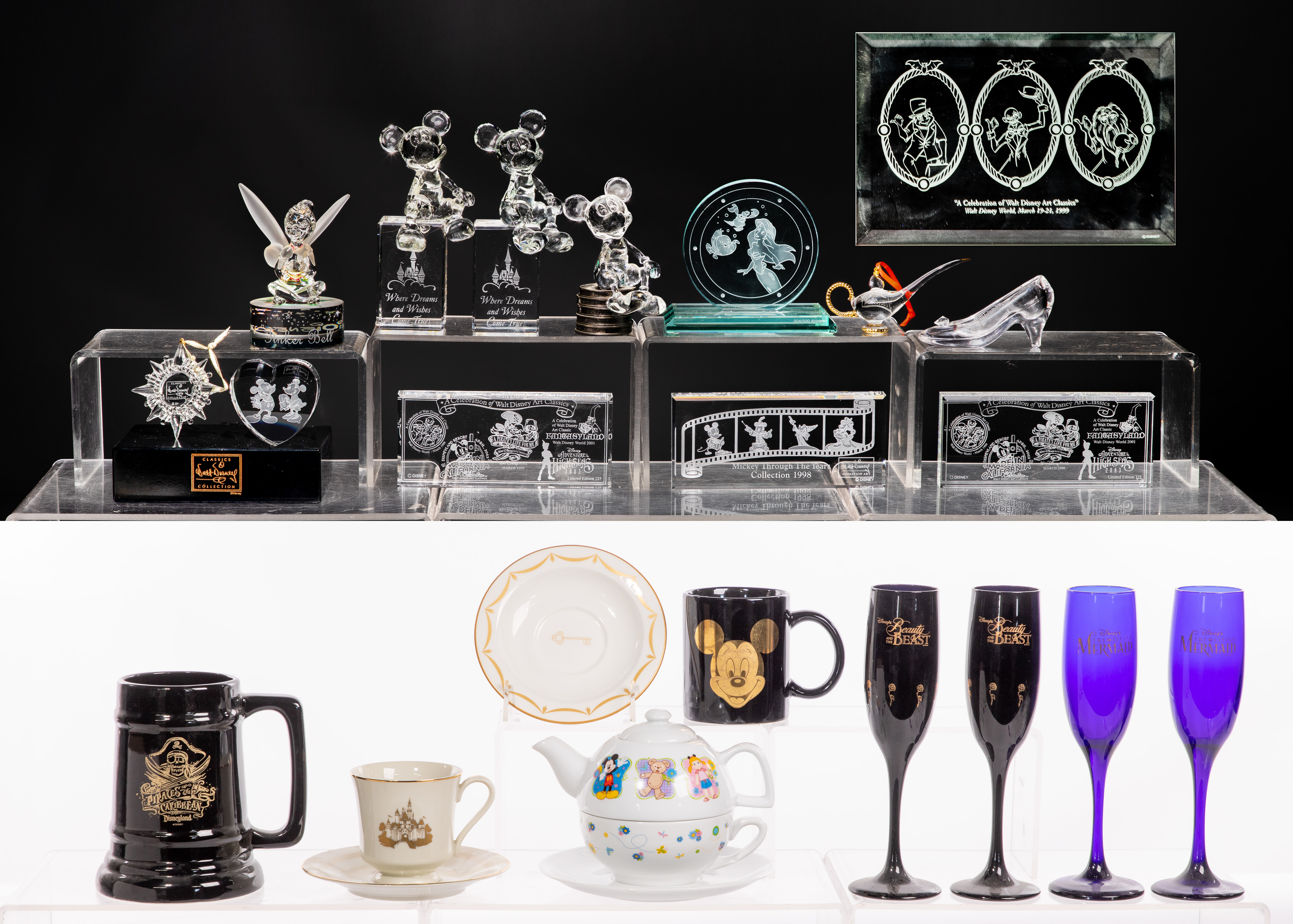(25) items of various materials including a three-piece teapot, (3) mugs, (3) plates, a Classics Collection black finish base, a ‘Haunted Mansion’ themed mirror, a 1996 glass slipper, a ‘The Little Mermaid’ themed plaque, (4) champagne flutes and crystal including (2) seated Mickeys, a seated Tinker Bell, a heart form paperweight, (3) plaques, a Mickey seated on reels and (2) holiday ornaments