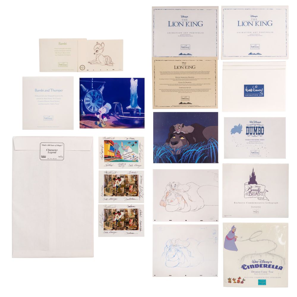 (15) items including lithographs, printed model sheets, animation art portfolios, maquettes and an unopened character legend, from films including ‘The Lion King’, ‘Dumbo’, ‘Bambi’, ‘Cinderella’ and ‘The Jungle Book’, some having COAs, all in envelopes