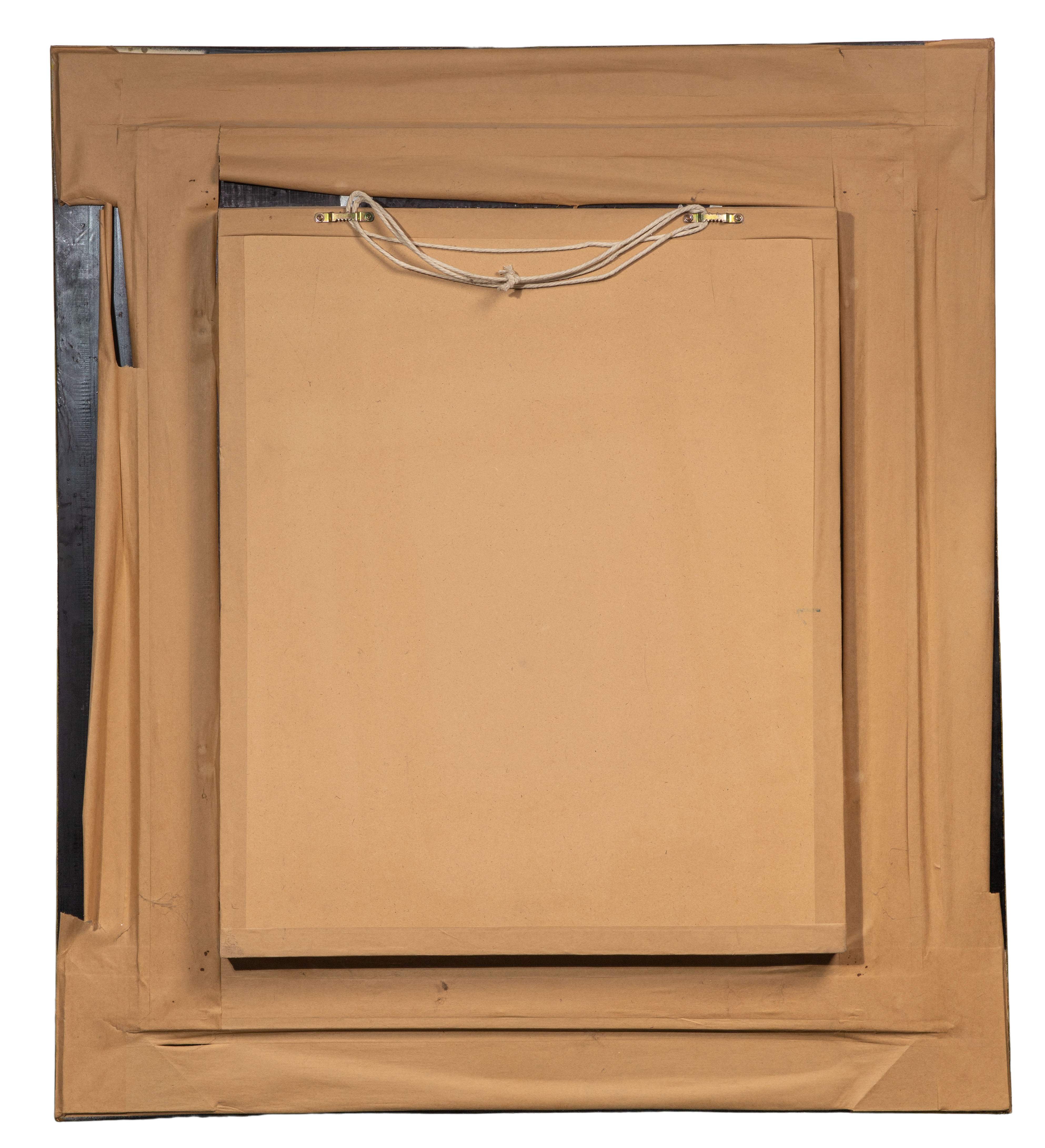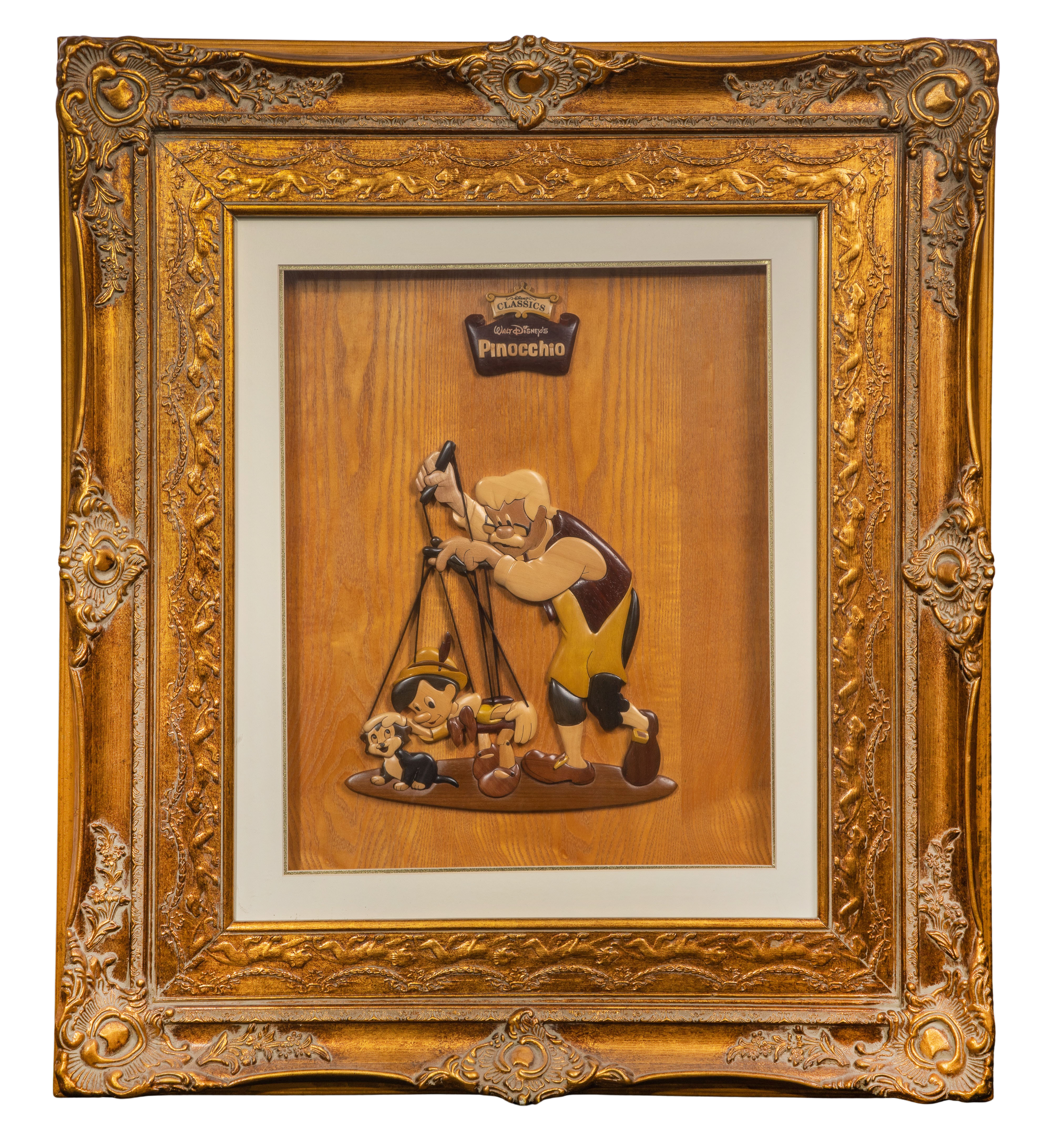 An undated and unsigned 3-dimentional depiction of Geppetto pulling Pinocchio’s strings, assembled from carved pieces of walnut, cottonwood, aspen, maple, black willow and mahogany, mounted to an oak board having title plaque, matted behind acrylic in a gold-tone gesso on carved wood shadow box frame
