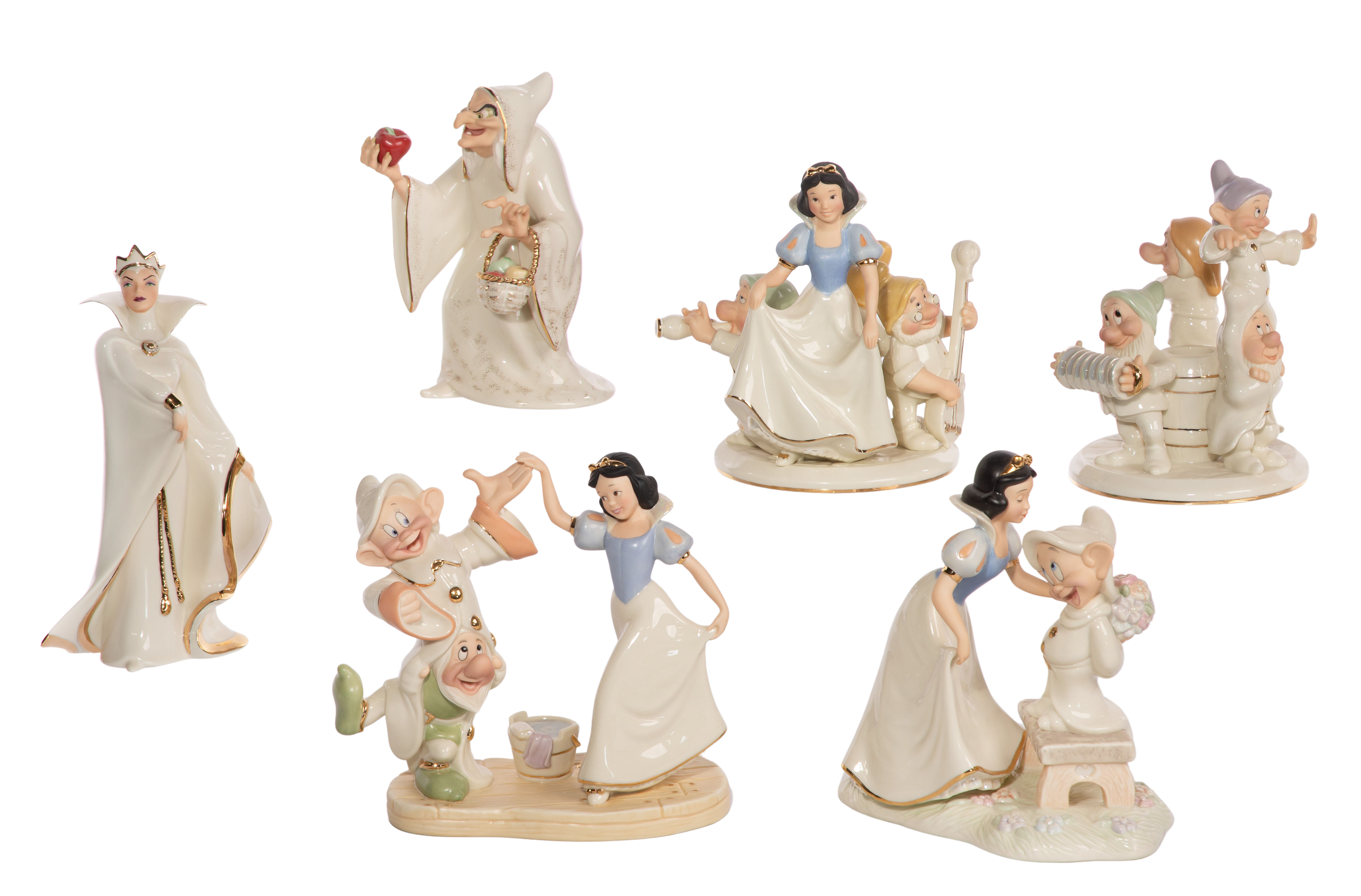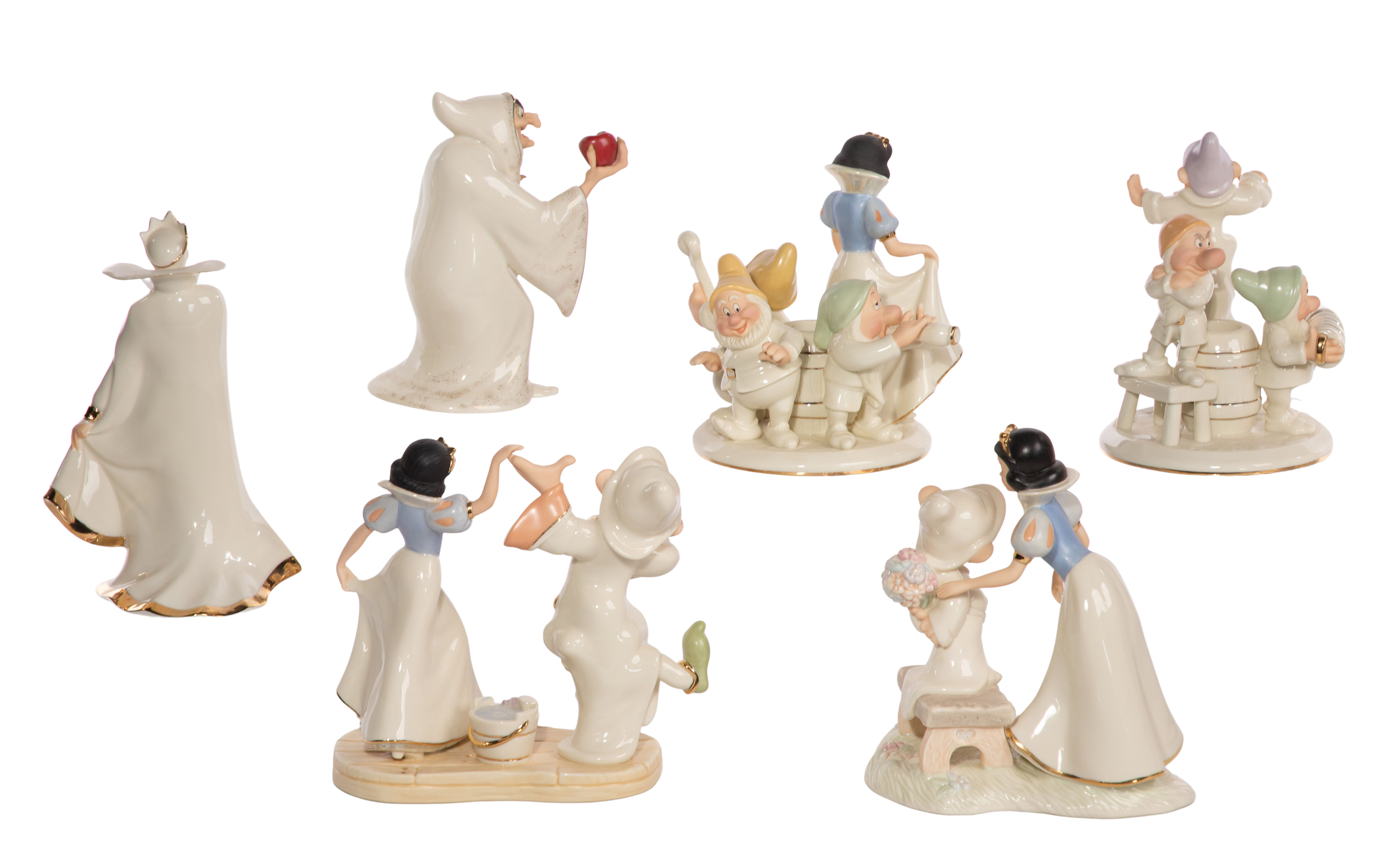 (6) porcelain items comprising (4) from the Lenox Disney Showcase Collection including ‘Dancing With Snow White’, #445/3500, a #3147 ‘Have an Apple, Dearie’, a #3656 ‘Dopey’s Sweet Reward’, a #5967 ‘Empress of Evil’ as well as (2) Lenox ‘Snow White and the Seven Dwarfs’ candlesticks, all having marks on undersides