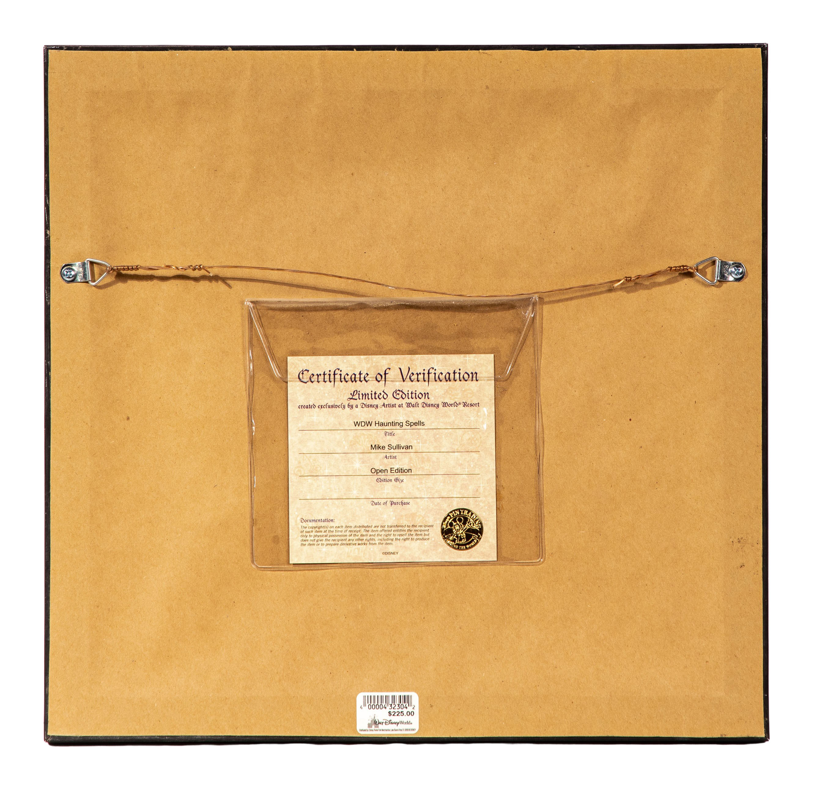 Having (14) ‘The Haunted Mansion’ pins and title plaque attached to backing, matted behind acrylic in a black wood frame having Disney COA attached verso