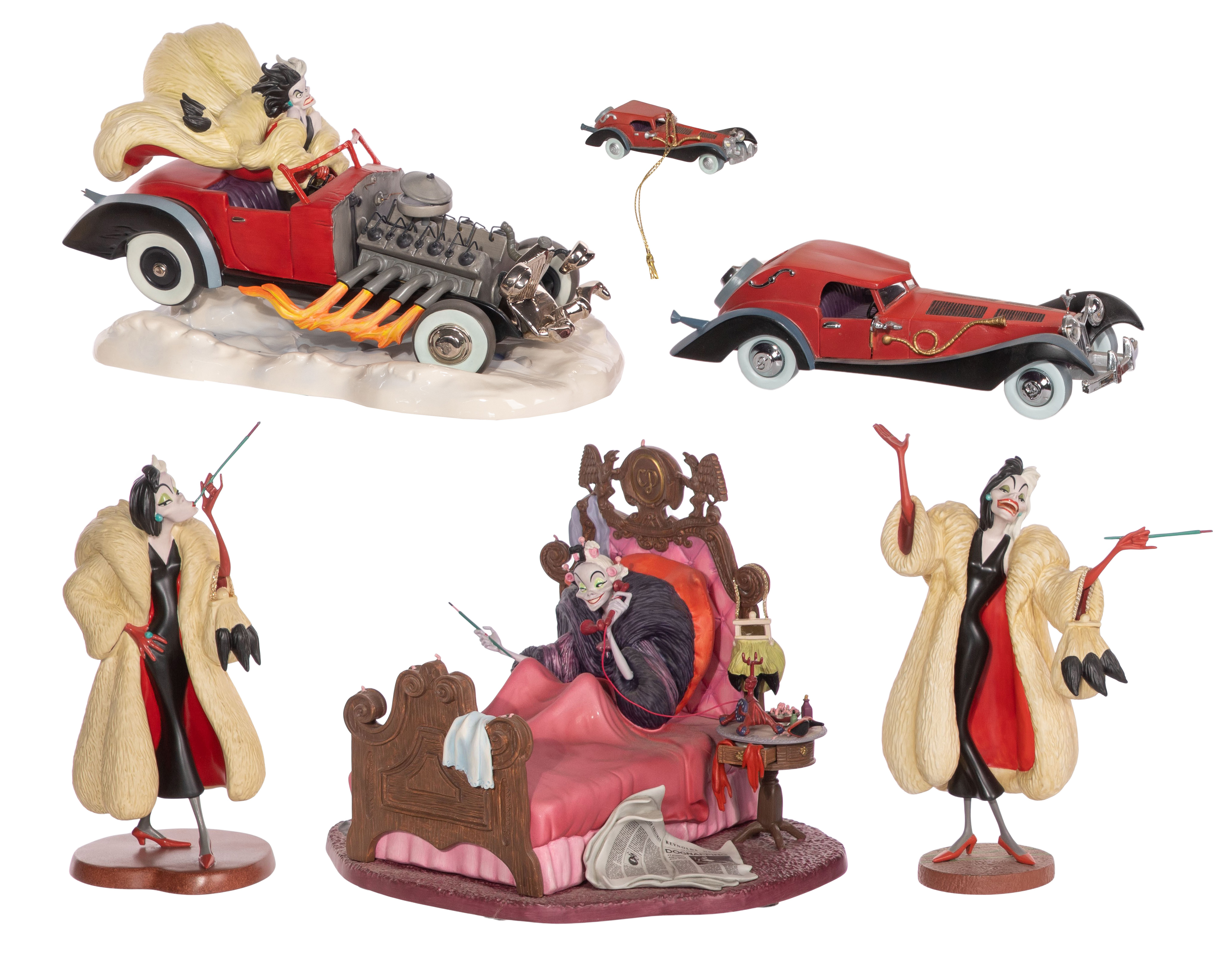 (6) items from ‘101 Dalmatians’, including in porcelain #1232409 ‘Cruella on Wheels’ having box, ‘It’s That DeVil Woman’, ‘Anita Darling’, ‘Perfectly Wretched’ and (2) cast resin Cruella cars