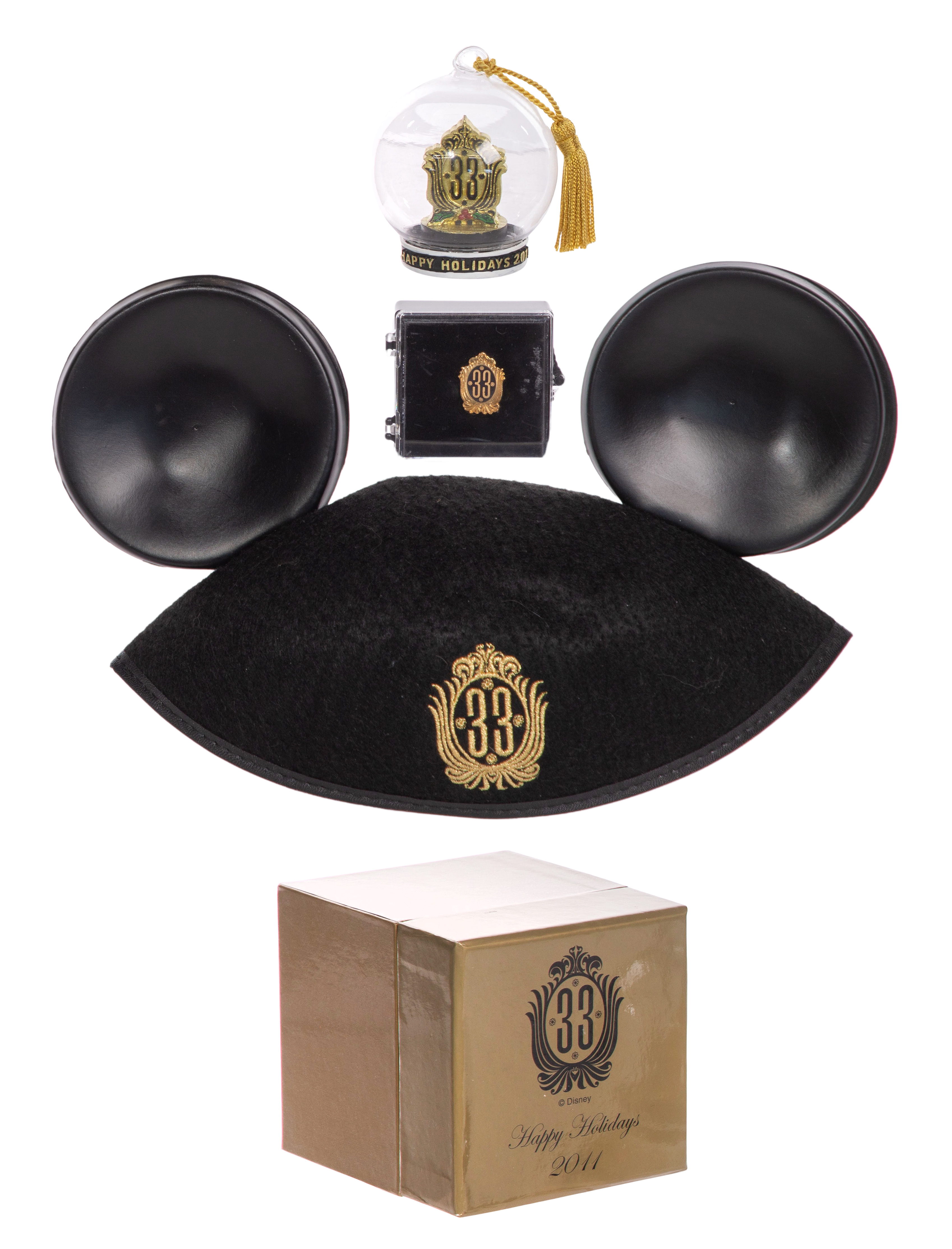 (3) items including a clasp back pin, a Mickey ears hat and 2011 Christmas ornament