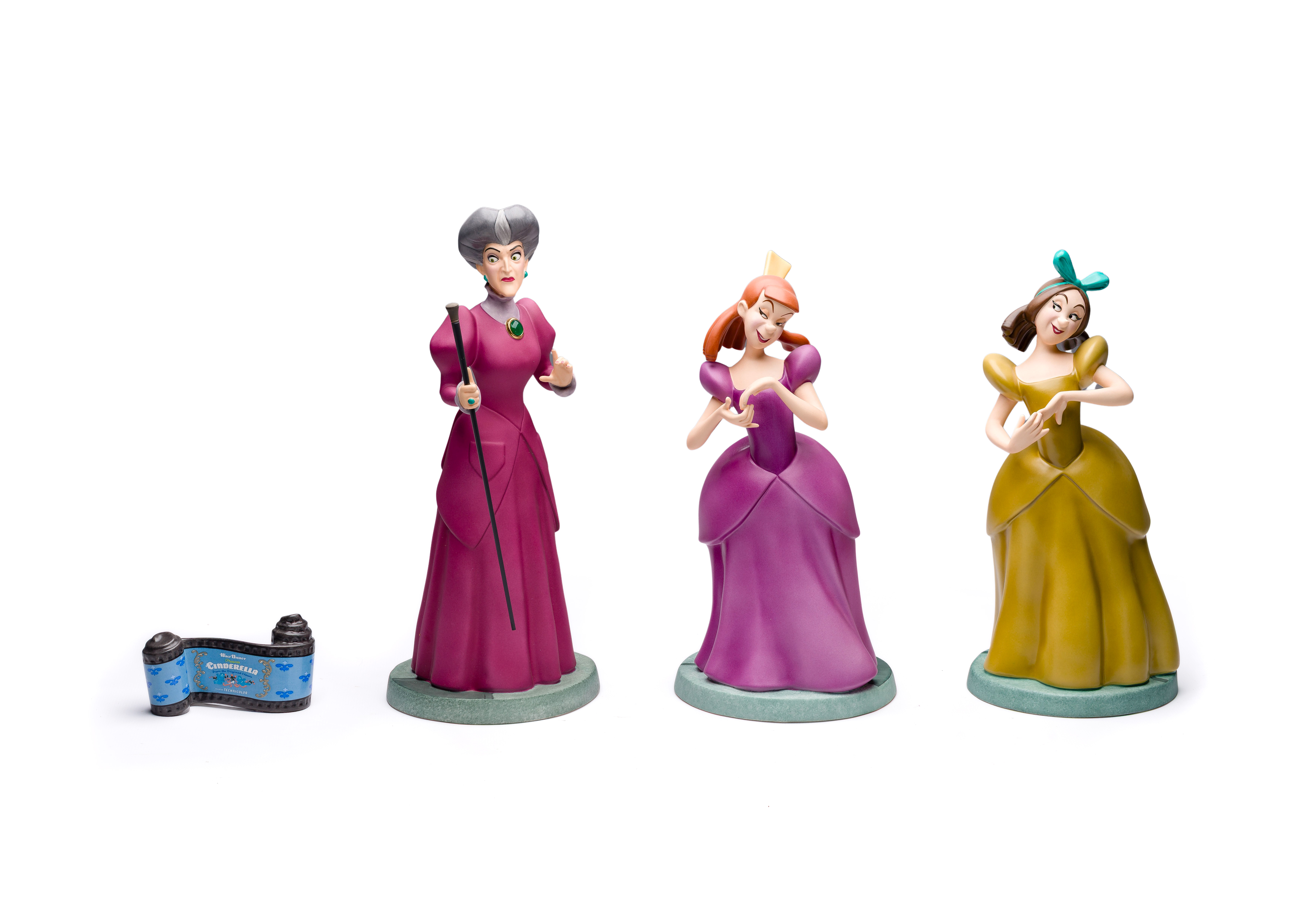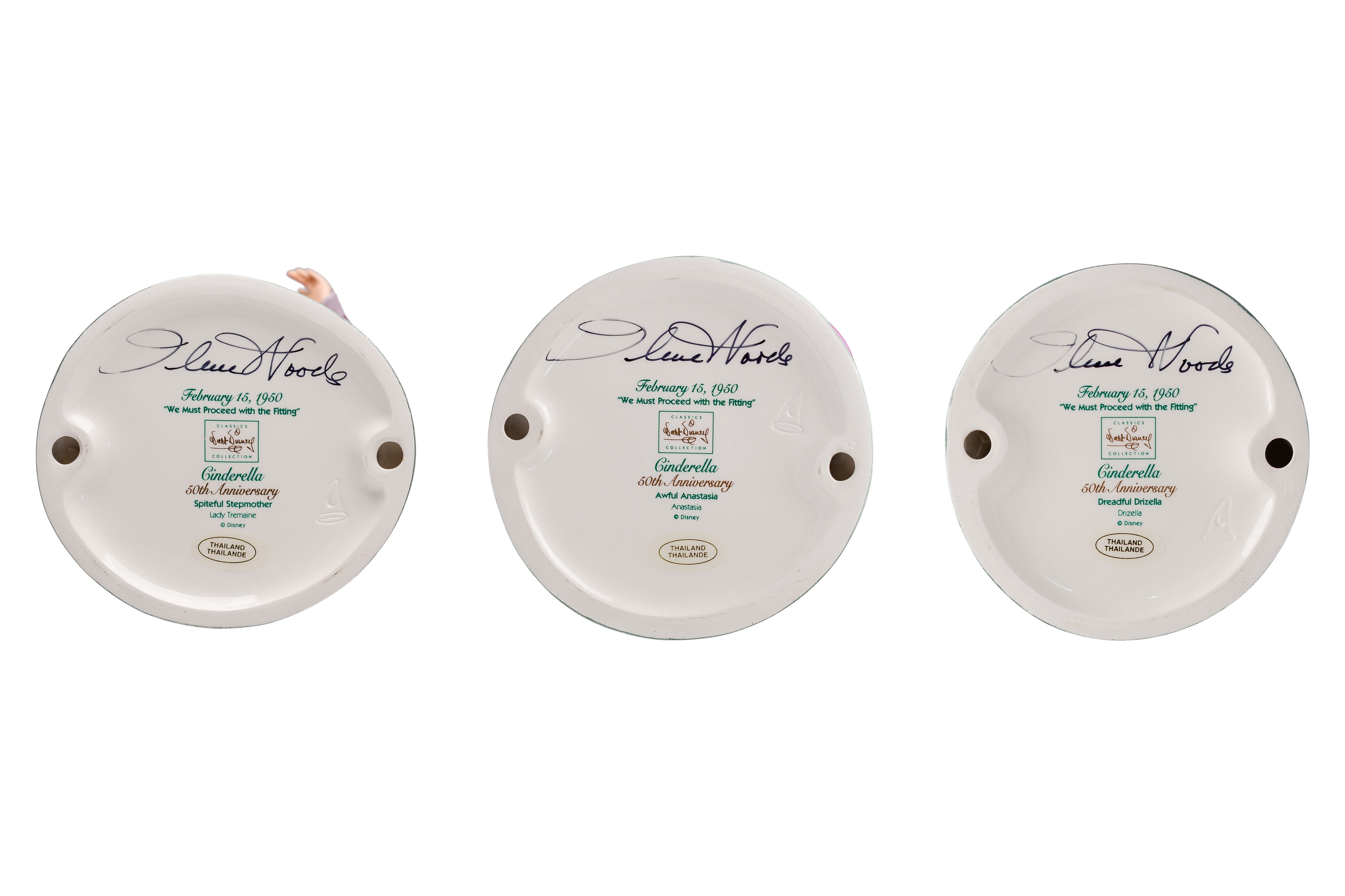 (4) items including 50th Anniversary edition ‘Spiteful Stepmother’ Lady Tremaine, ‘Awful Anastasia’ and ‘Dreadful Drizella’, each signed underside by Ilene Woods, the original voice of Cinderella in the 1950 Disney animated film, as well as an opening title plaque