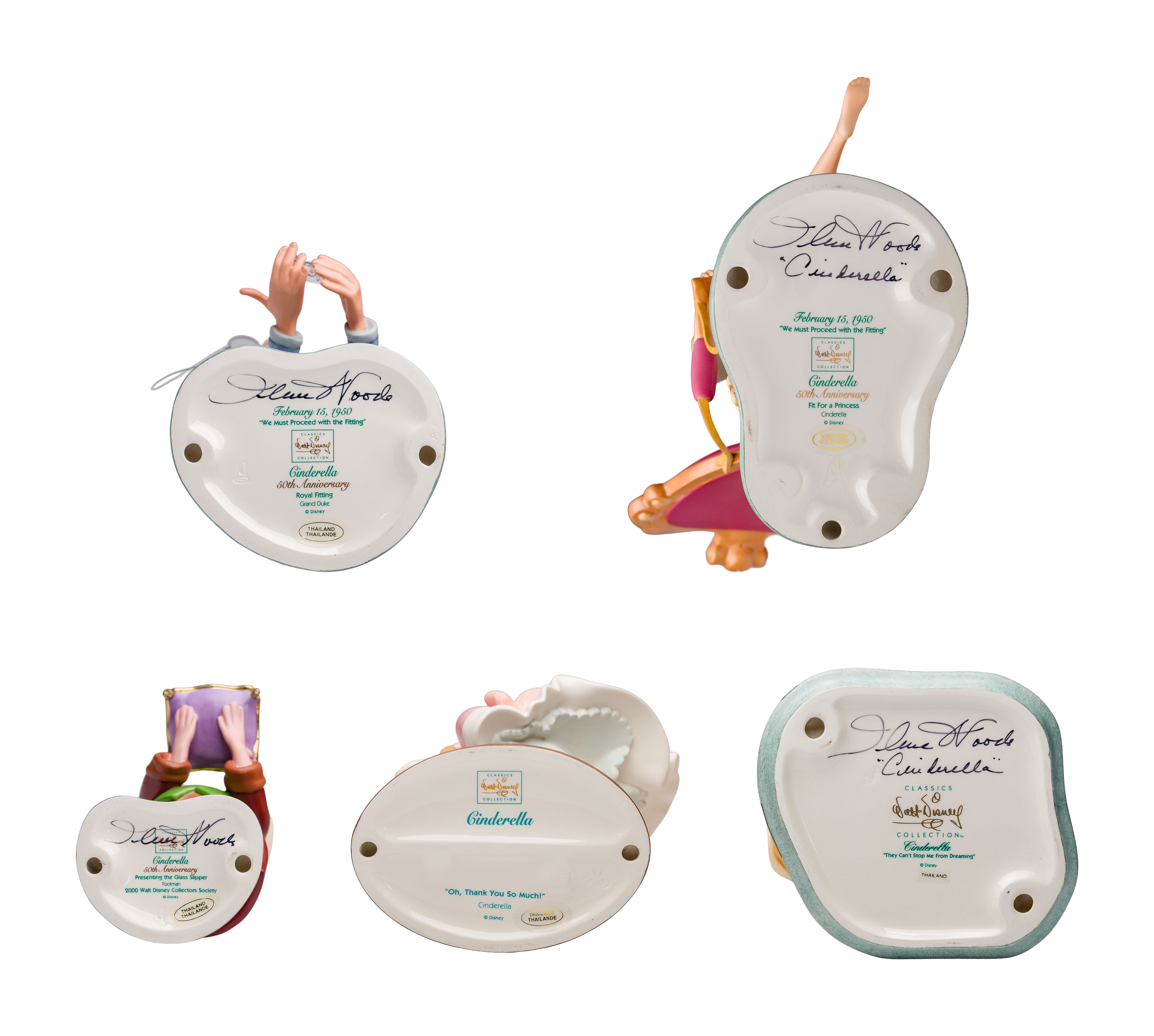 (5) total porcelain items including ‘We Must Proceed With the Fitting’ Cinderella, ‘We Must Proceed With the Fitting’ Grand Duke, ‘They Can’t Stop Me From Dreaming’ Cinderella and ‘Presenting the Glass Slipper’ footman hand signed by Ilene Woods, the voice of Cinderella in the Disney film; together with an unsigned ‘Oh, Thank You So Much!’ Cinderella