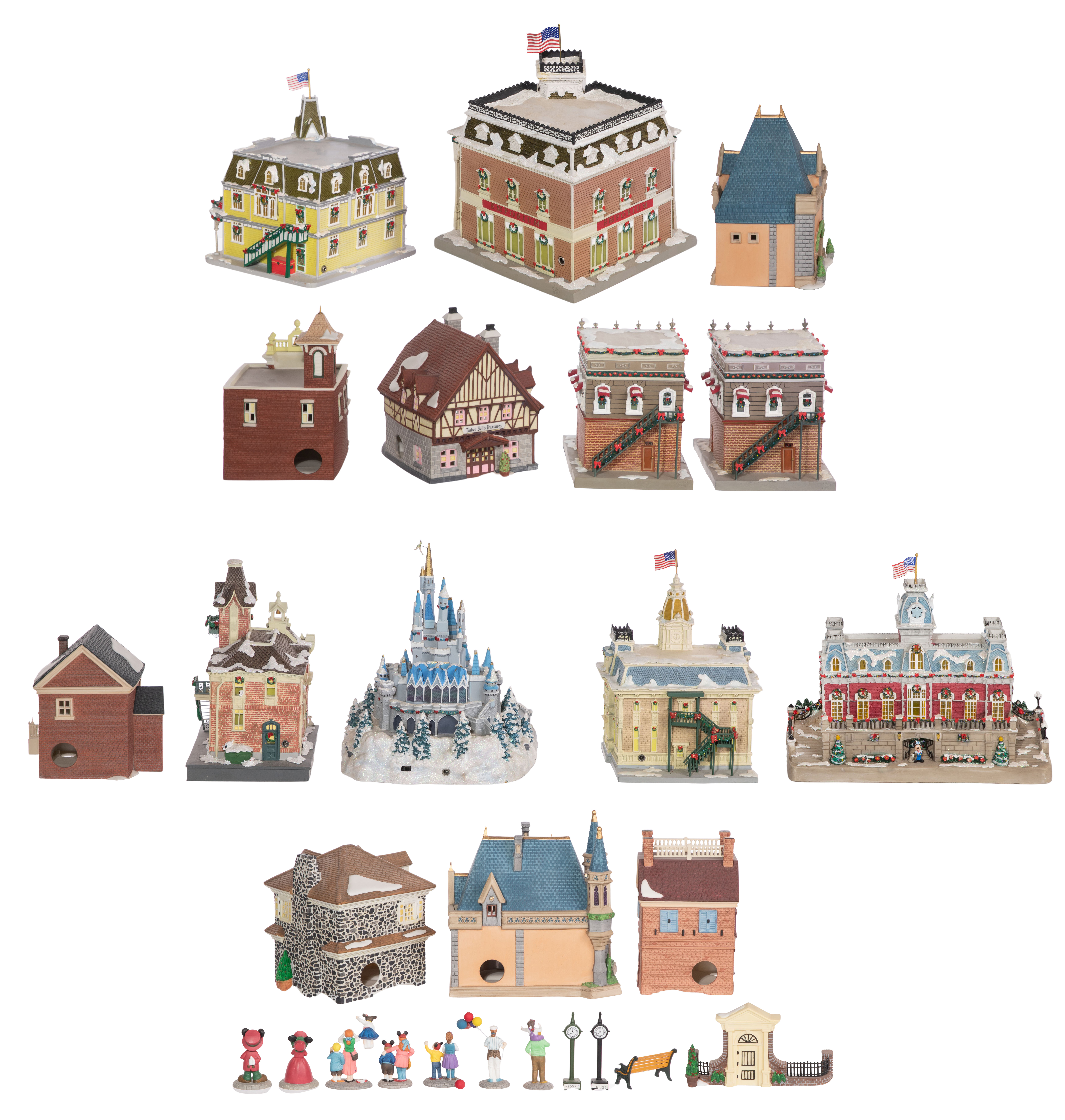 (26) total items of Disneyland Village Buildings and attractions covered in snow, including Cinderellas Castle, Main Street Entrance, Old World Antiques and Fire Station; together with lights, figures and accessories, most marked