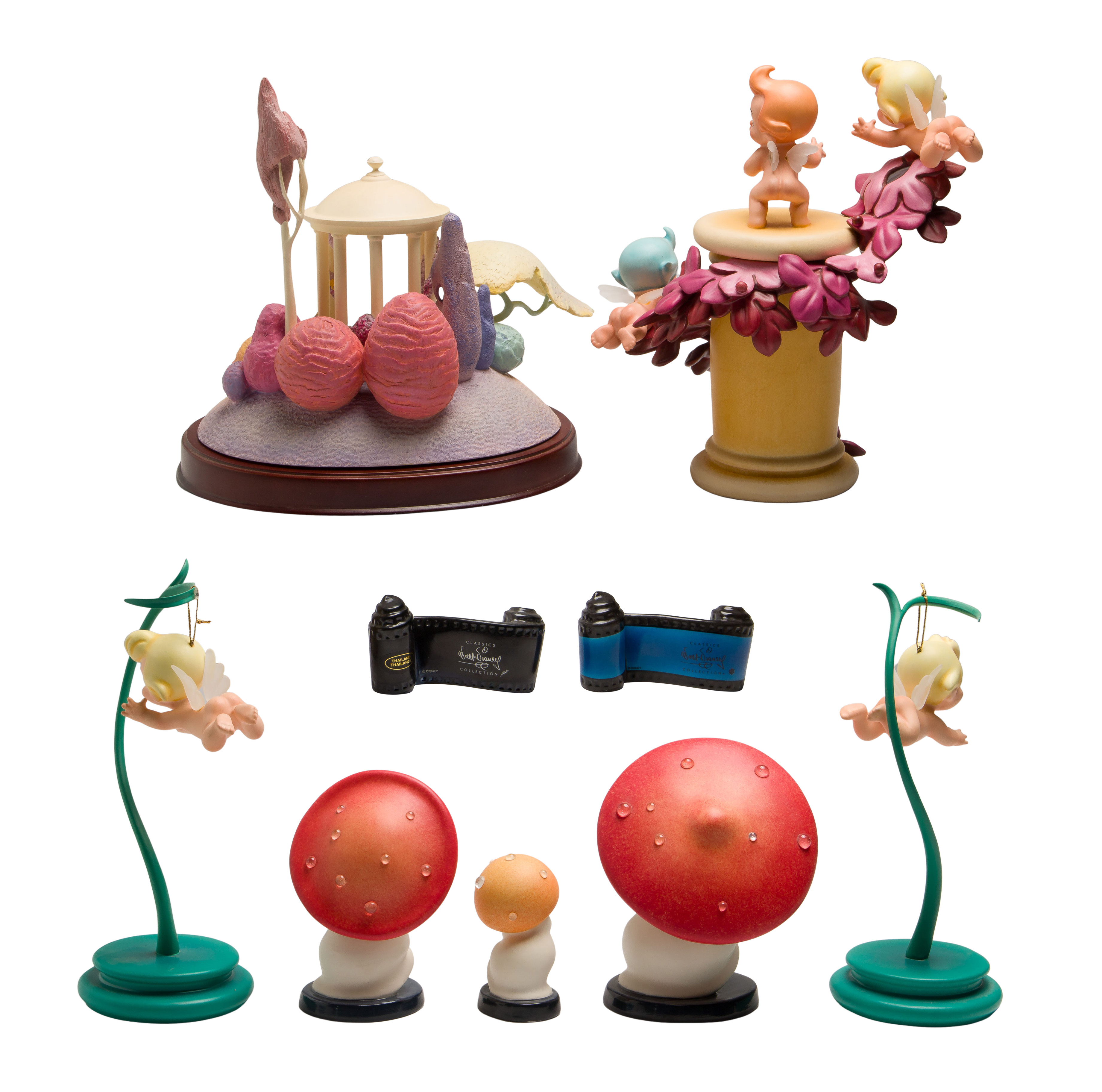(11) items including in porcelain (3) mushroom dancers, ‘Love’s Little Helpers’, (2) cherubs, (2) plant form stands, (2) title plaques and a resin ‘Pastoral Setting’ having wood base