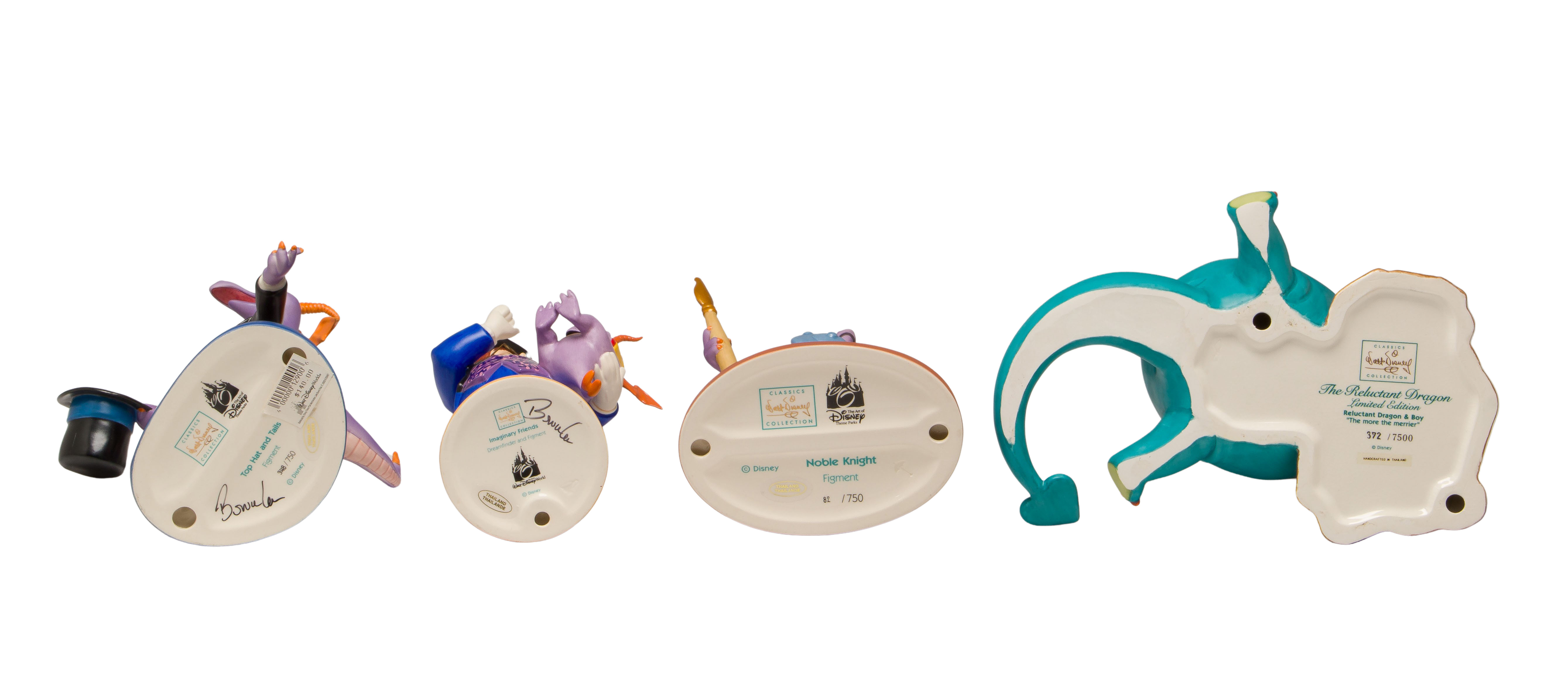 (4) total porcelain items including ‘Noble Knight’, #82/750, ‘Top Hat and Tails’, #348/750 and ‘Dreamfinder and Figment’; together with ‘The More the Merrier’ Reluctant Dragon and boy, #372/7500