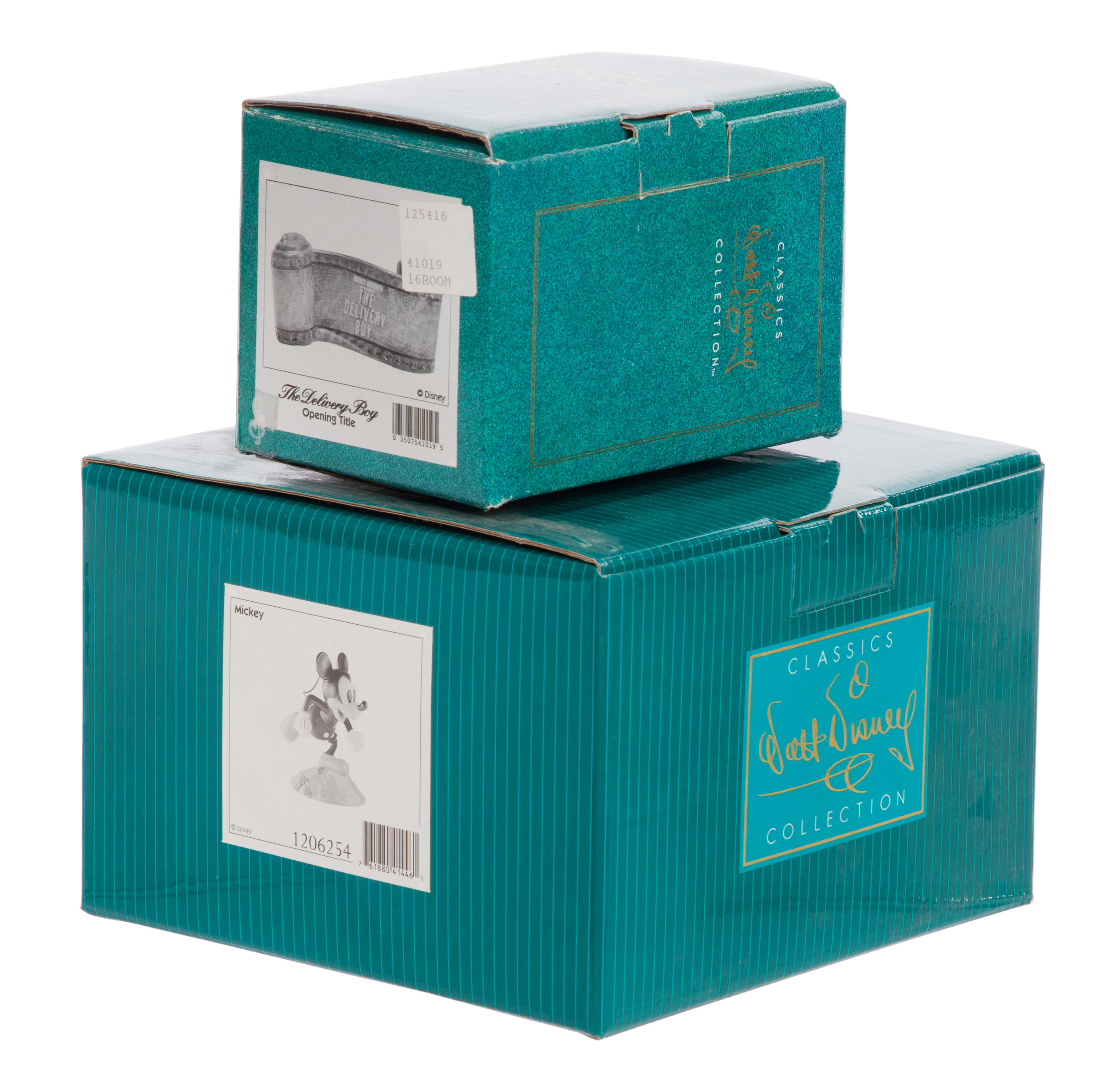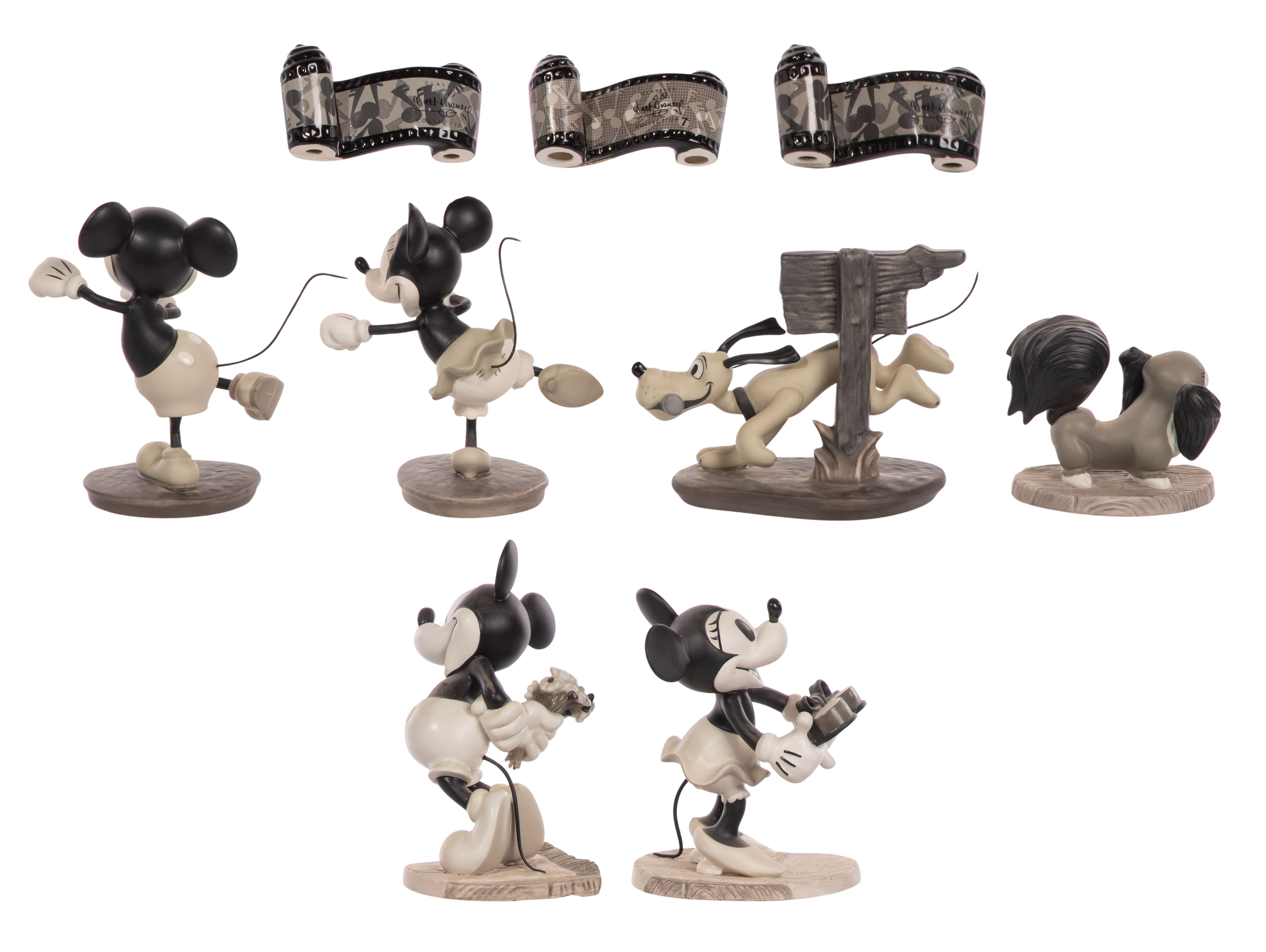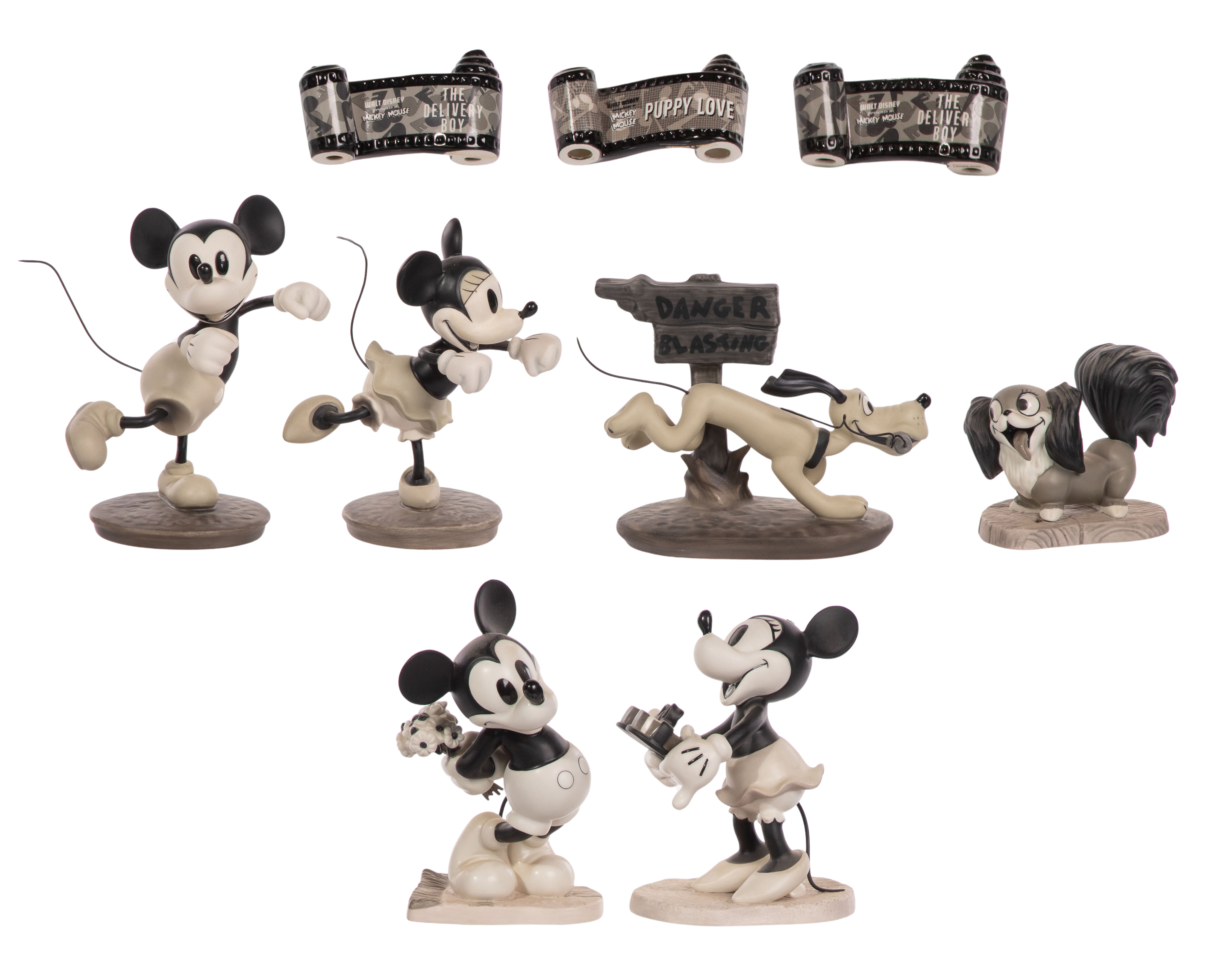 (10) total items, (9) porcelain including ‘Brought You Something’ Mickey, ‘Oh, It’s Swell’ Minnie, ‘Flirtatious Fifi’ Fifi and an opening title reel from ‘Puppy Love’ as well as ‘Hey, Minnie, Do You Wanna Go Steppin’?’ Mickey, ‘I’m a Jazz Baby’ Minnie, ‘Dynamite Dog’ and (2) opening title reels from ‘The Delivery Boy’, one having original packing and box; together with an empty box for #1206254 Mickey