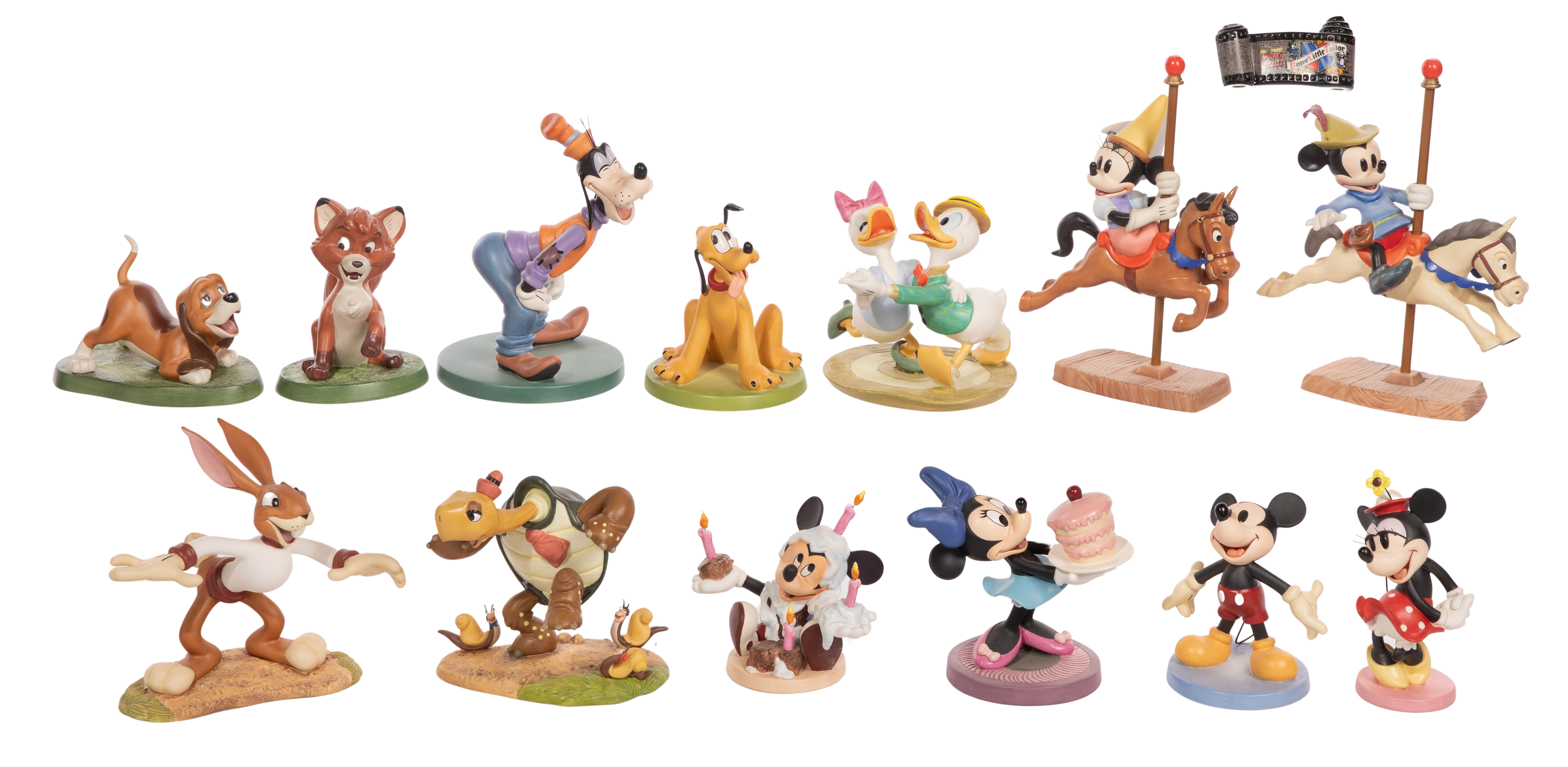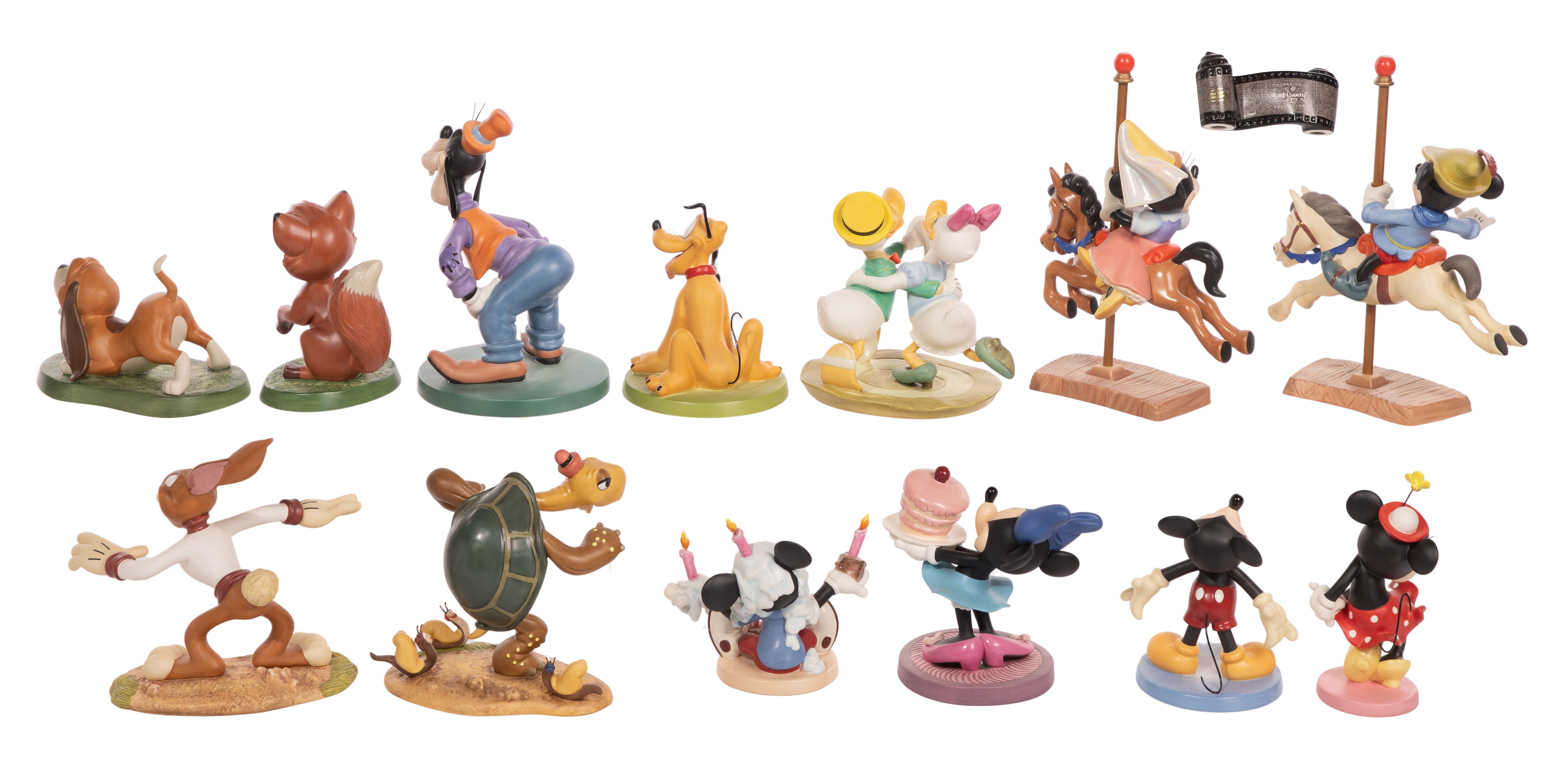 (14) porcelain items including ‘Oh Boy, What a Jitterbug’ Donald and Daisy, #499/5000, ‘Carousel Sweethearts’ Mickey, ‘Carousel Sweethearts’ Minnie and an opening title reel from ‘A Brave Little Tailor’, ‘Slow but Sure’ Tortoise, ‘Blue Streak’ Hare and (8) additional depiction of Mickey, Minnie and friends
