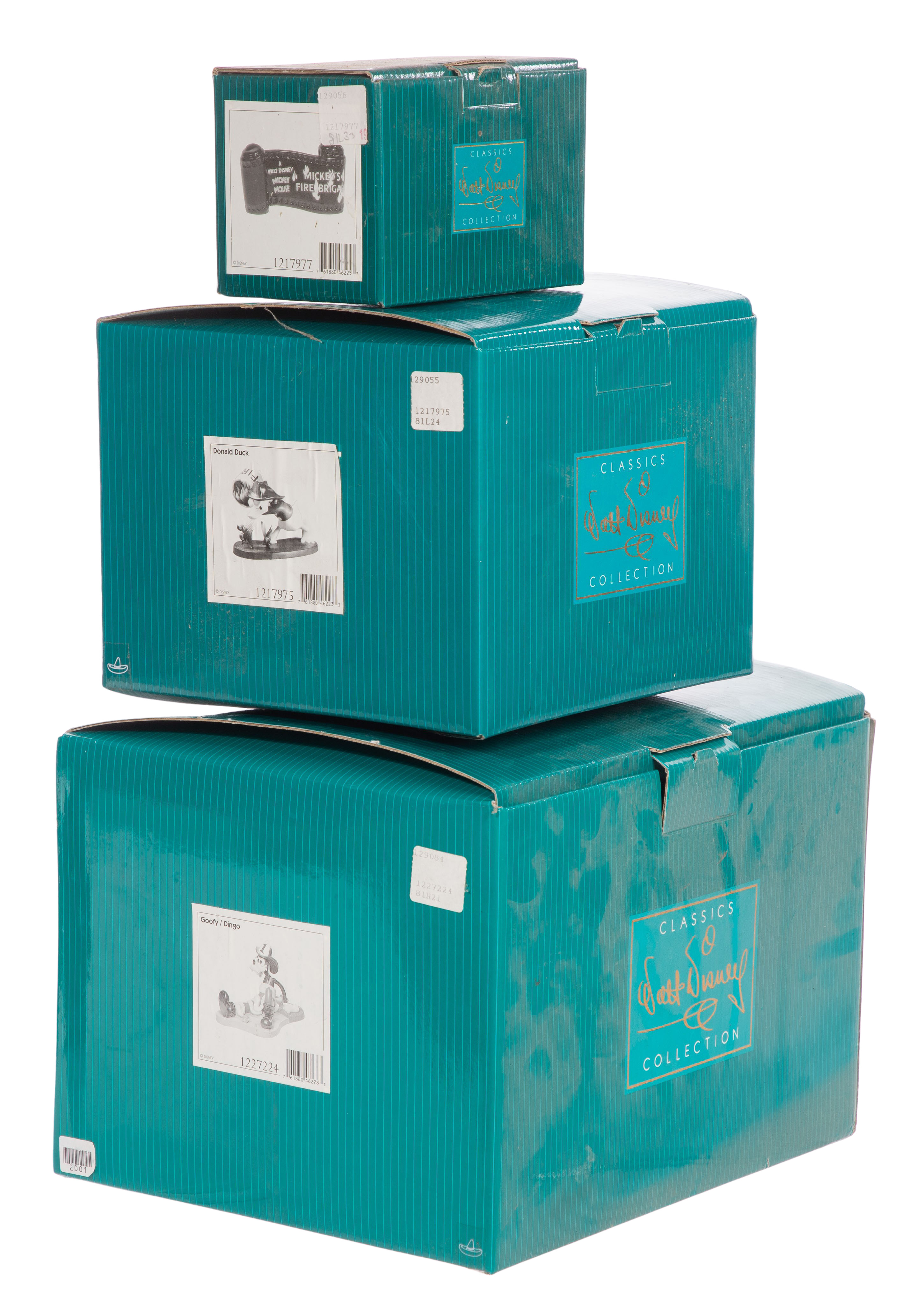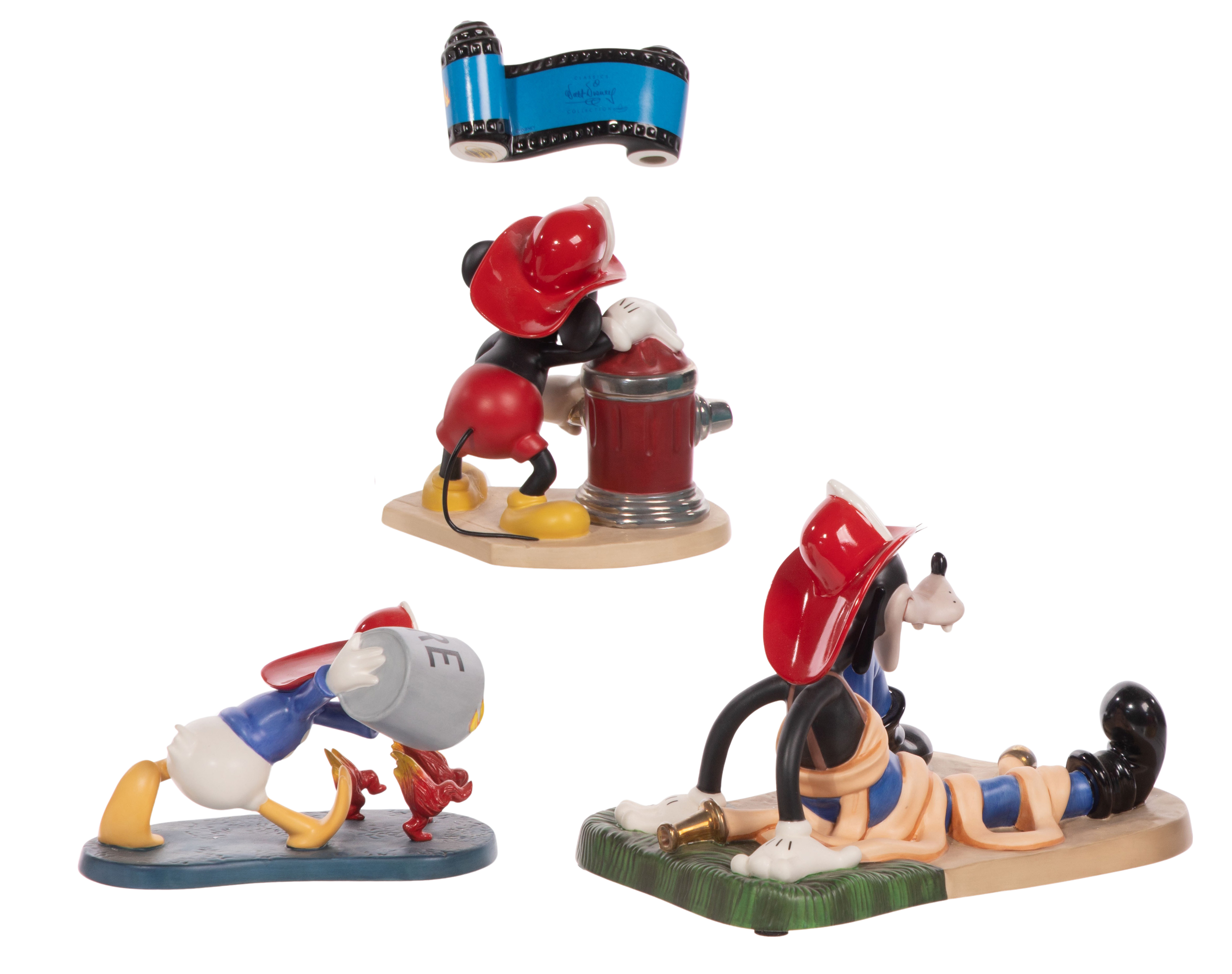 (4) porcelain items including #1227224 ‘All Wrapped Up’ Goofy #2001/2002, #1217975 ‘Duck! A Fire’ Donald Duck and #1217977 opening title plaque, all having original packing and boxes as well as an unboxed ‘Fireman to the Rescue’ Mickey