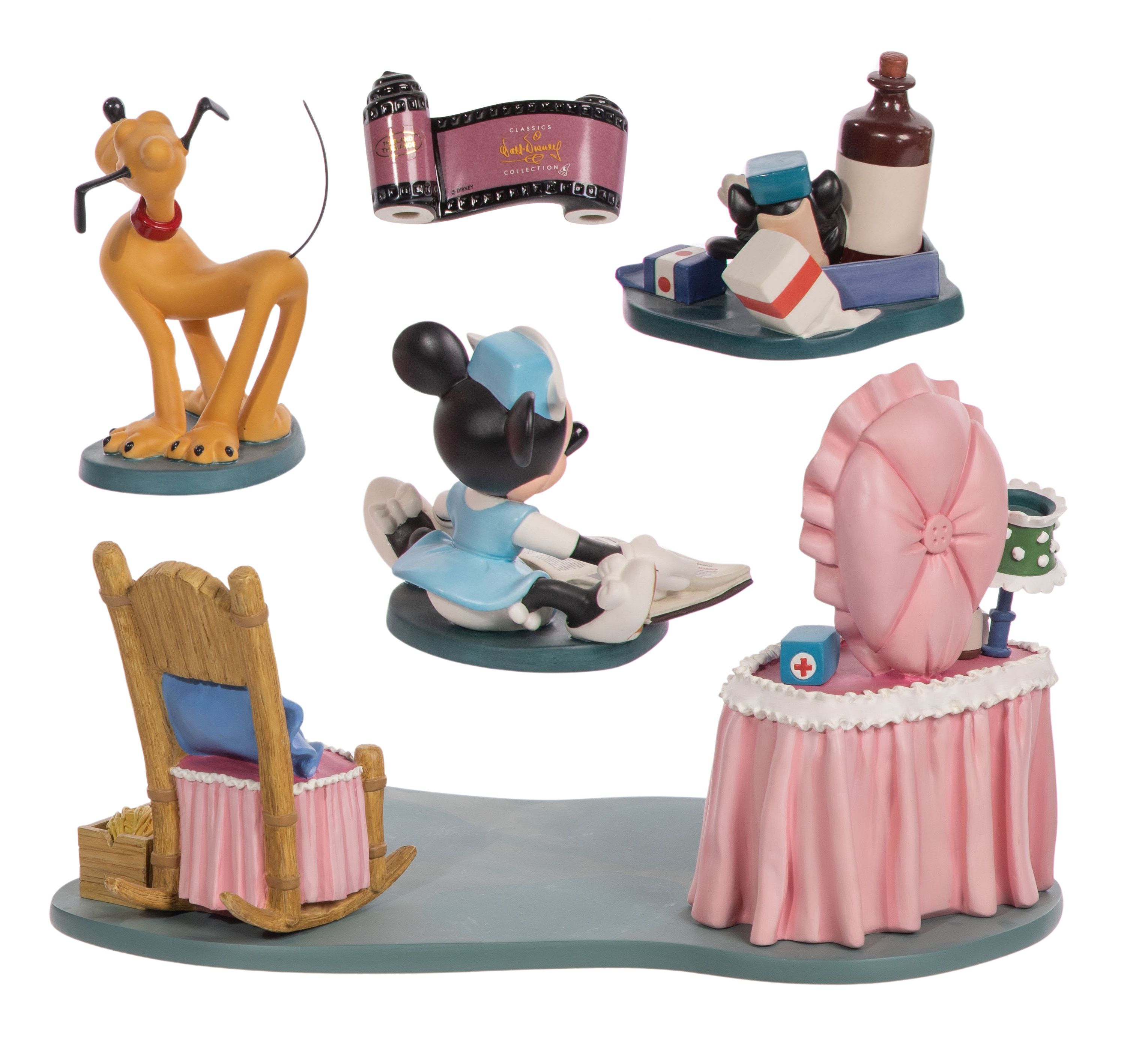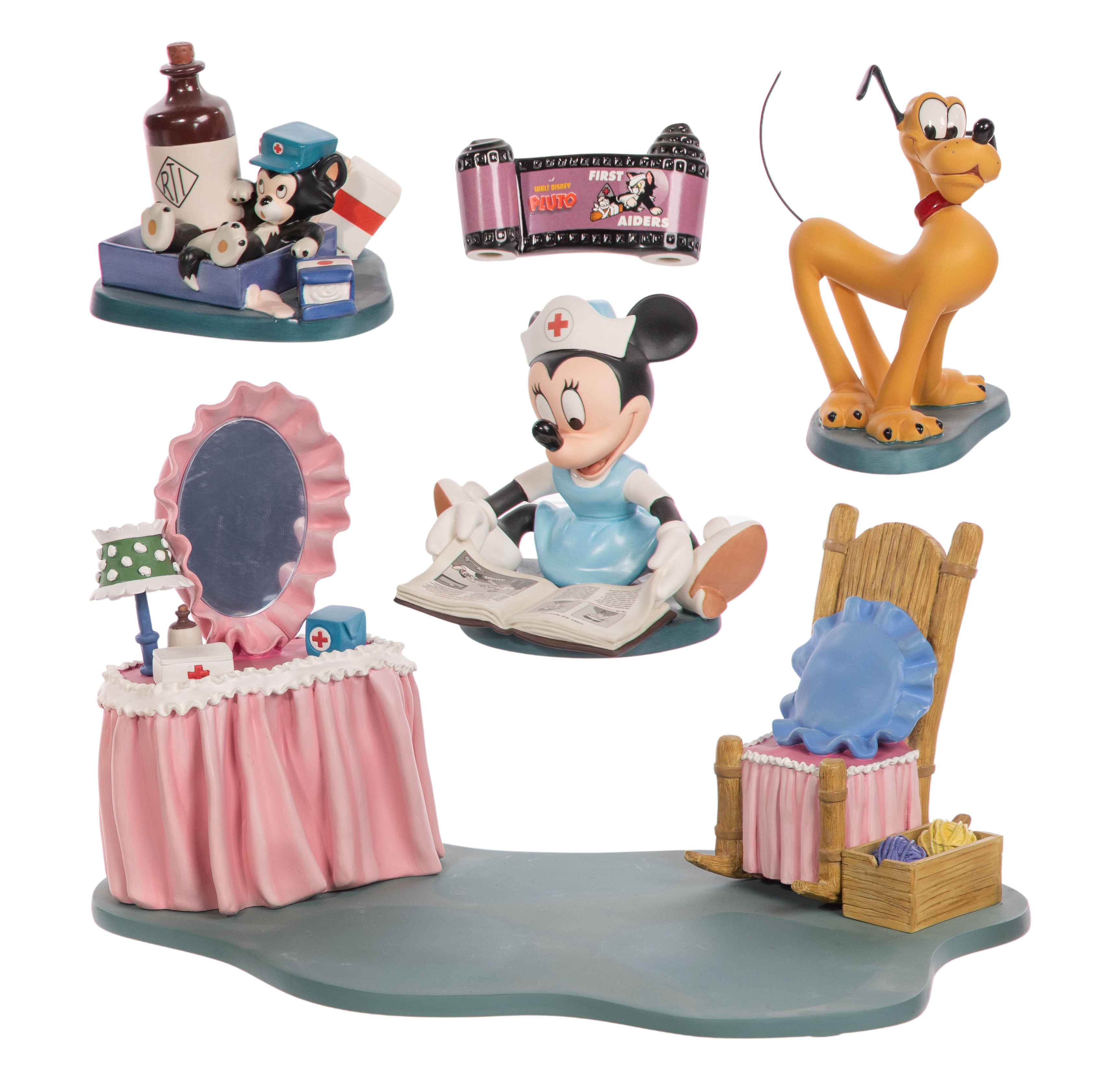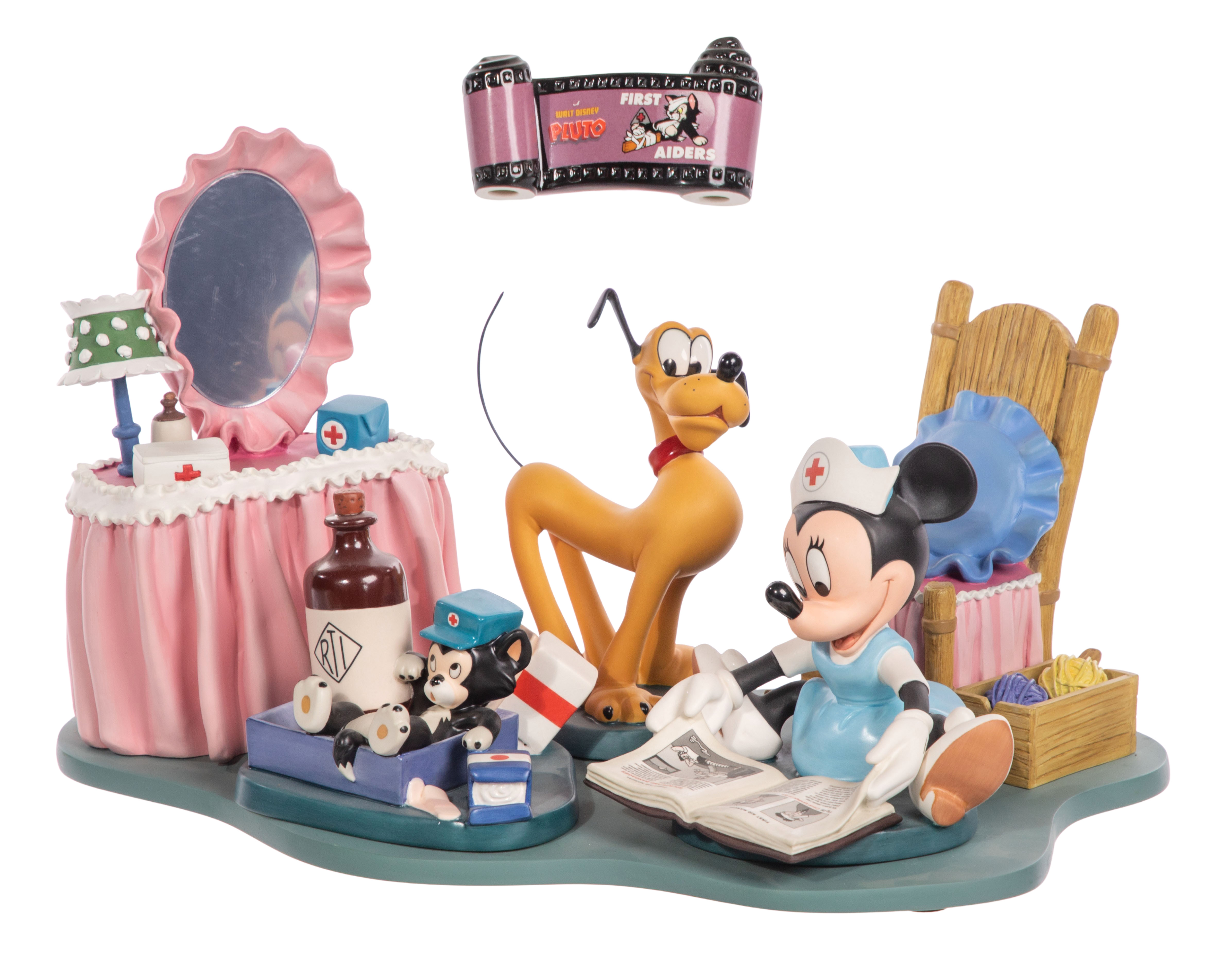‘First Aiders’ porcelain set having nurse Minnie Mouse, Pluto, Figaro the kitten, a resin vanity, a resin chair, a film strip plaque and various props, all marked on underside