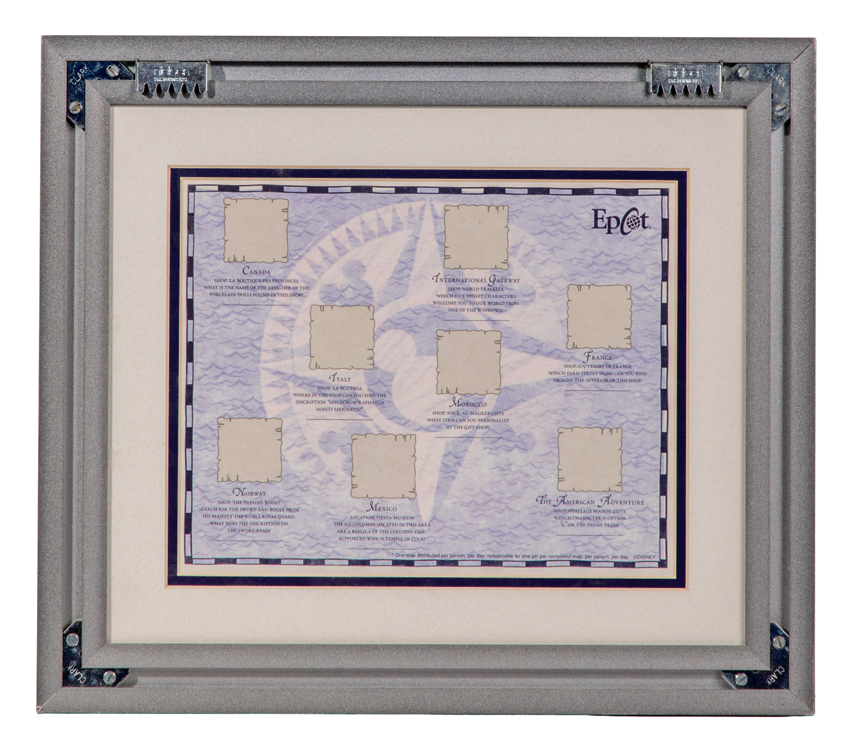 (3) items including ‘Pin Celebration’ having a plaque verso reading ‘Limited Edition 500’ and ‘Passport to Our World’, both having pins attached to printed backgrounds as well as a twelve-pin set, all matted behind acrylic in wood / metal frames