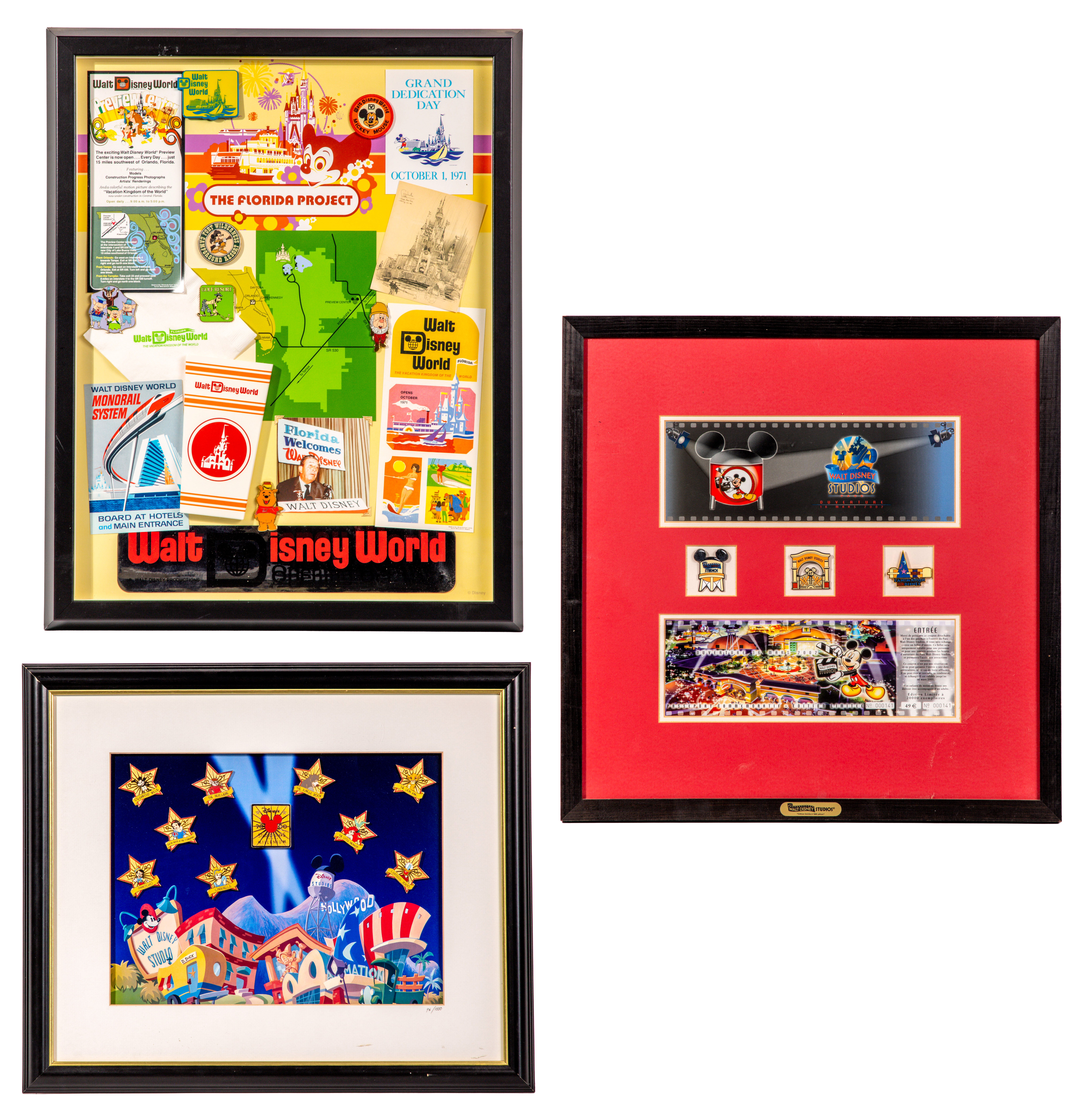 (3) total items including ‘2000 Studio Stars of the Millenium’ having ten pins on printed background, a Walt Disney Studios Park, Paris four-pin and 1st day pass set from an edition of 1000, both matted behind acrylic in wood frames; together with ‘The Florida Project’ collage set from an edition of 200, behind acrylic in a shadow box frame