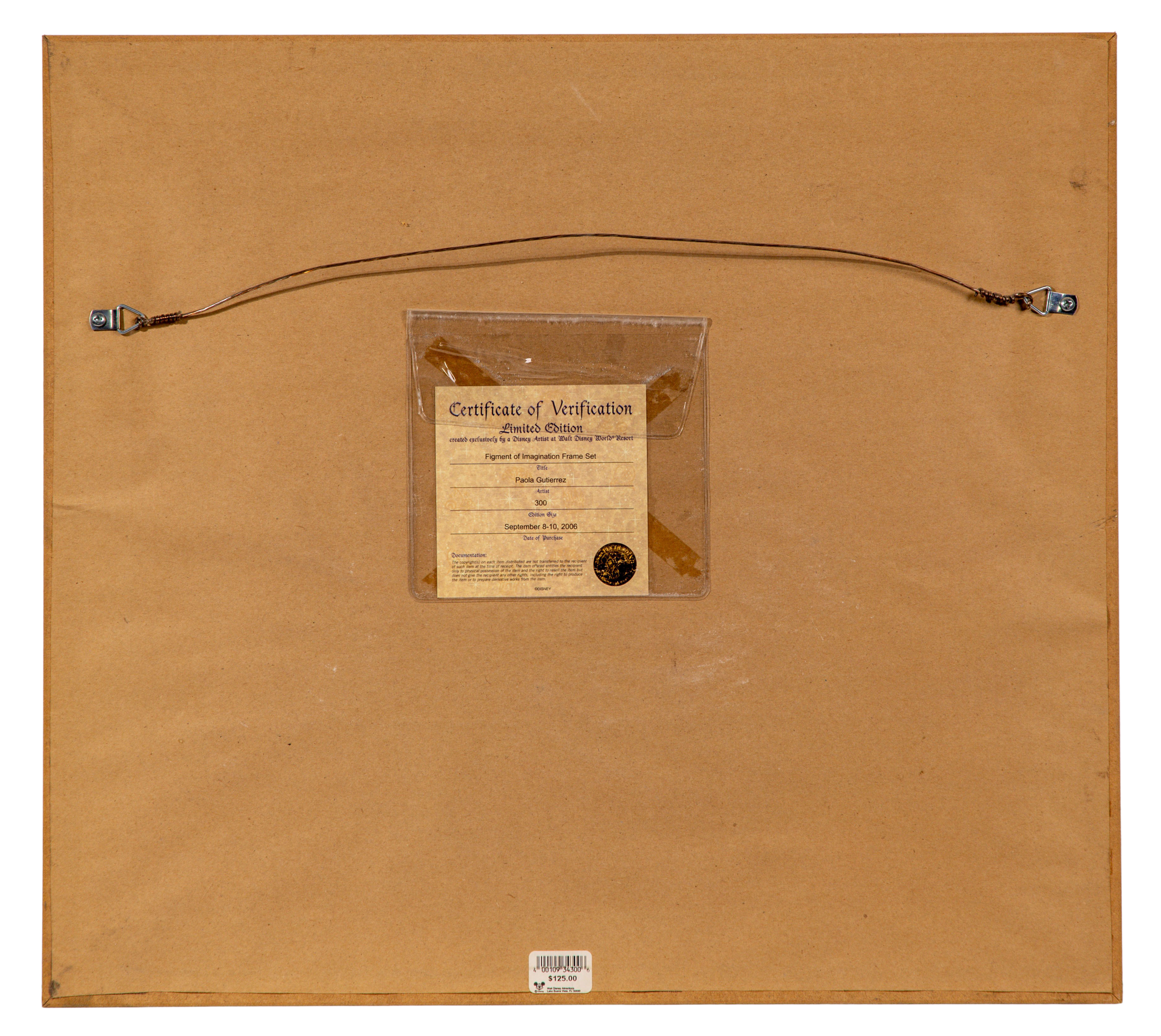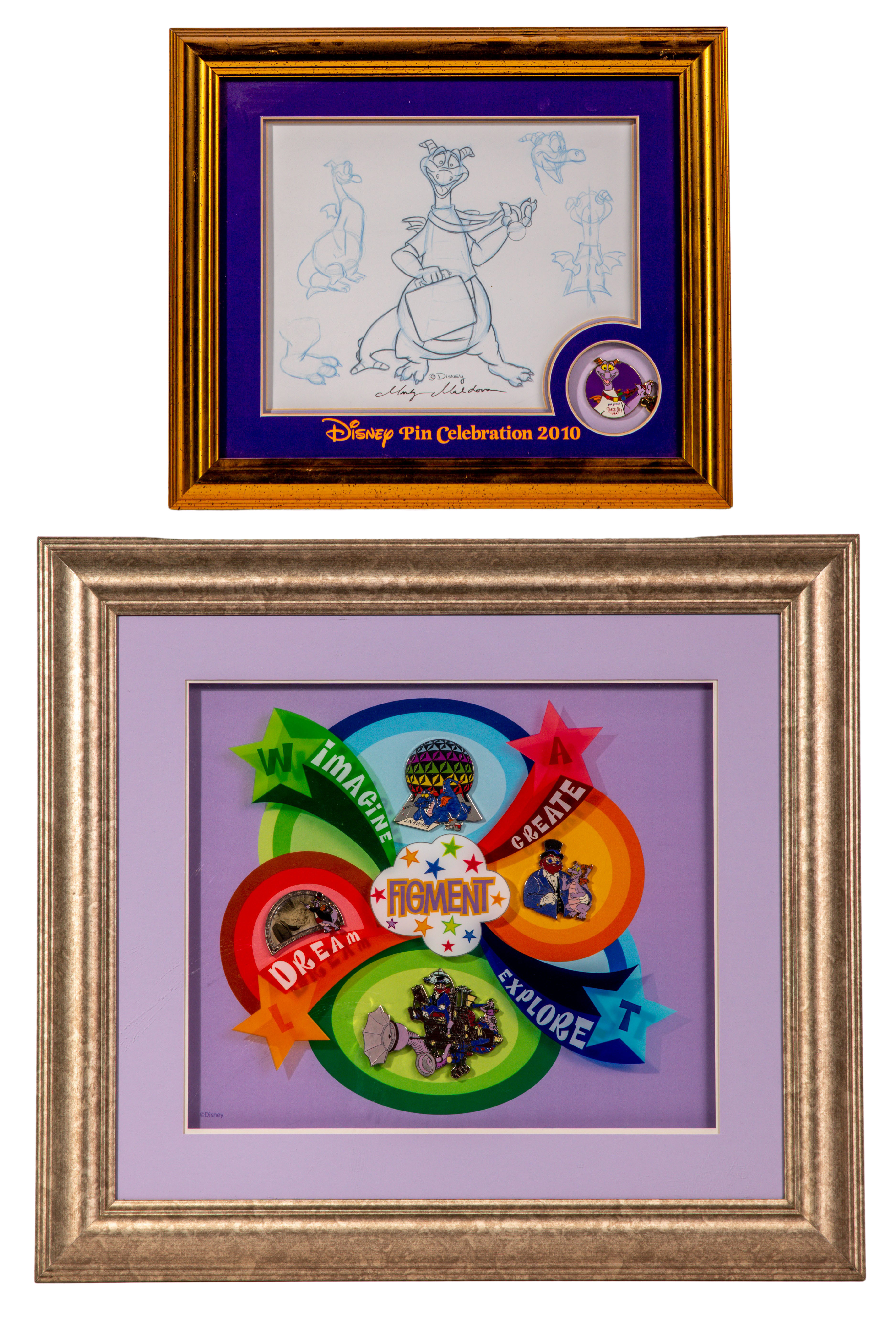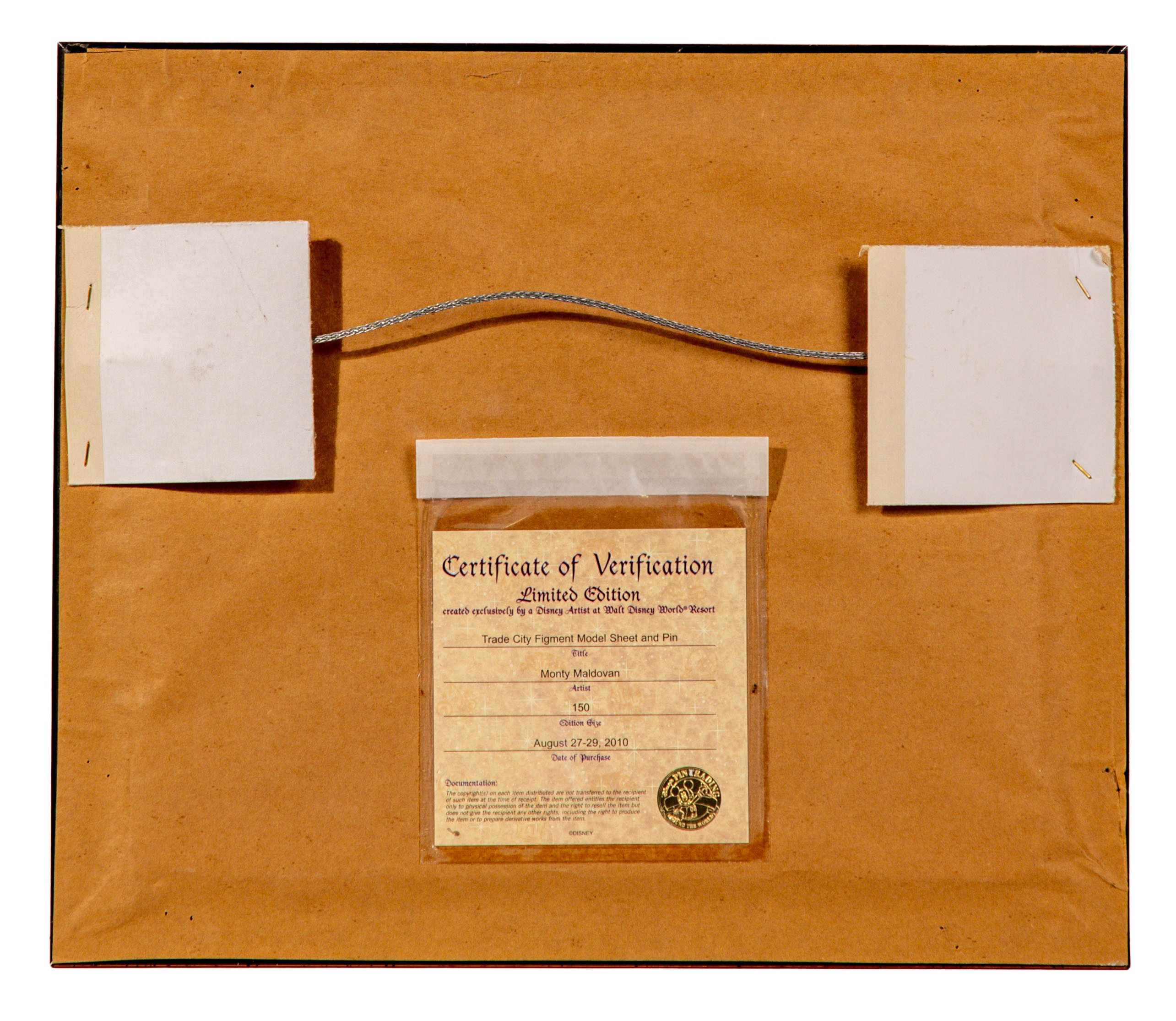 (2) items including a 2010 ‘Trade City Figment Model Sheet and Pin’ from an edition of 150, having a pin and printed sheet after a production drawing, ink signed ‘Monty Maldovan’ (artist) and a 2006 ‘Figment of Imagination’ from an edition of 300, having four pins mounted to printed sheet behind printed acrylic overlay, both matted behind acrylic in gold-tone frame