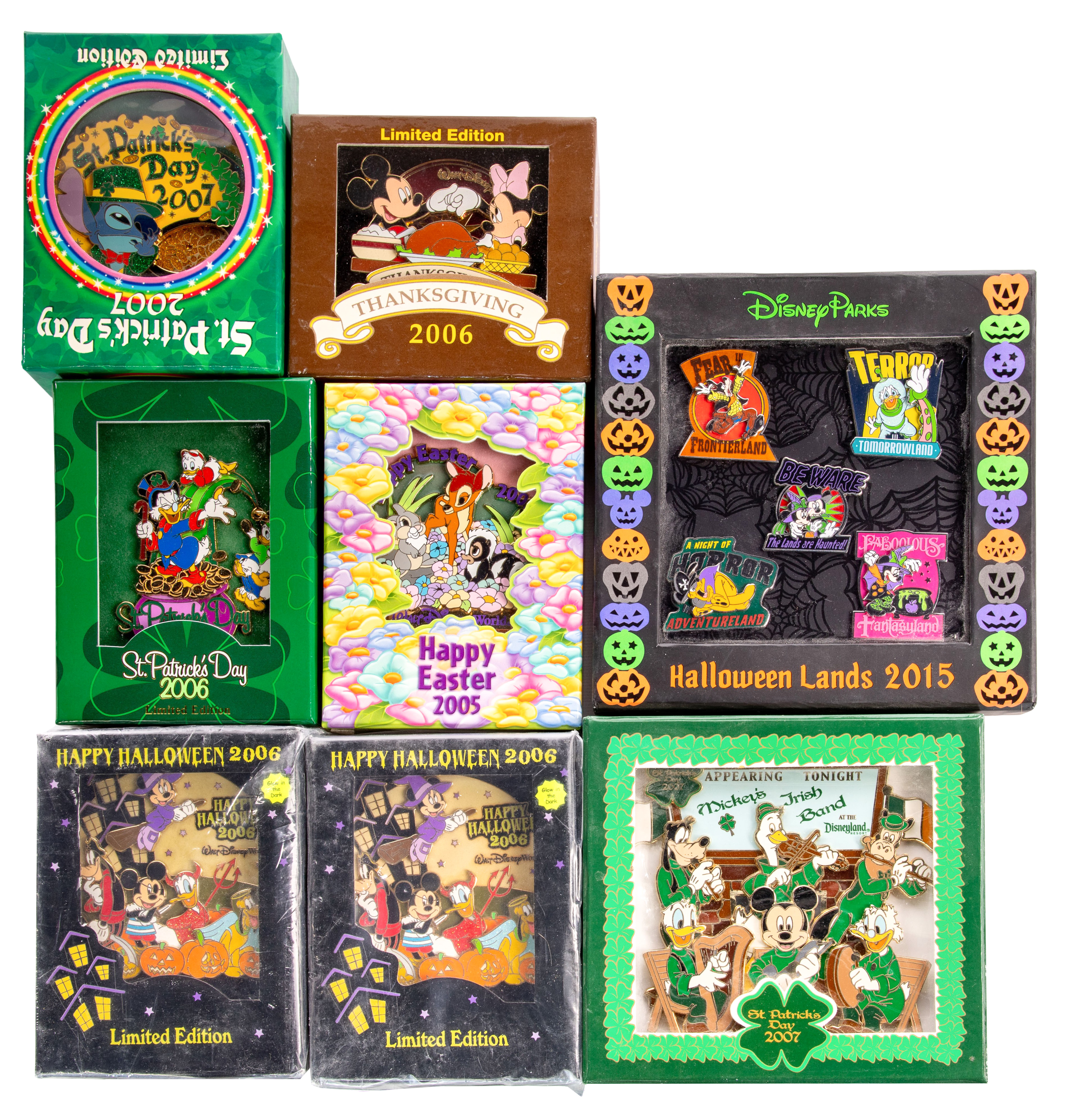 (8) items including a 2005 Happy Easter jumbo pin, (2) 2006 Happy Halloween jumbo pins (in original plastic), a 2006 Thanksgiving jumbo pin, a 2006 St. Patrick’s Day jumbo pin, (2) St. Patrick’s Day jumbo pins and a 2015 Halloween Lands pin set, all having boxes
