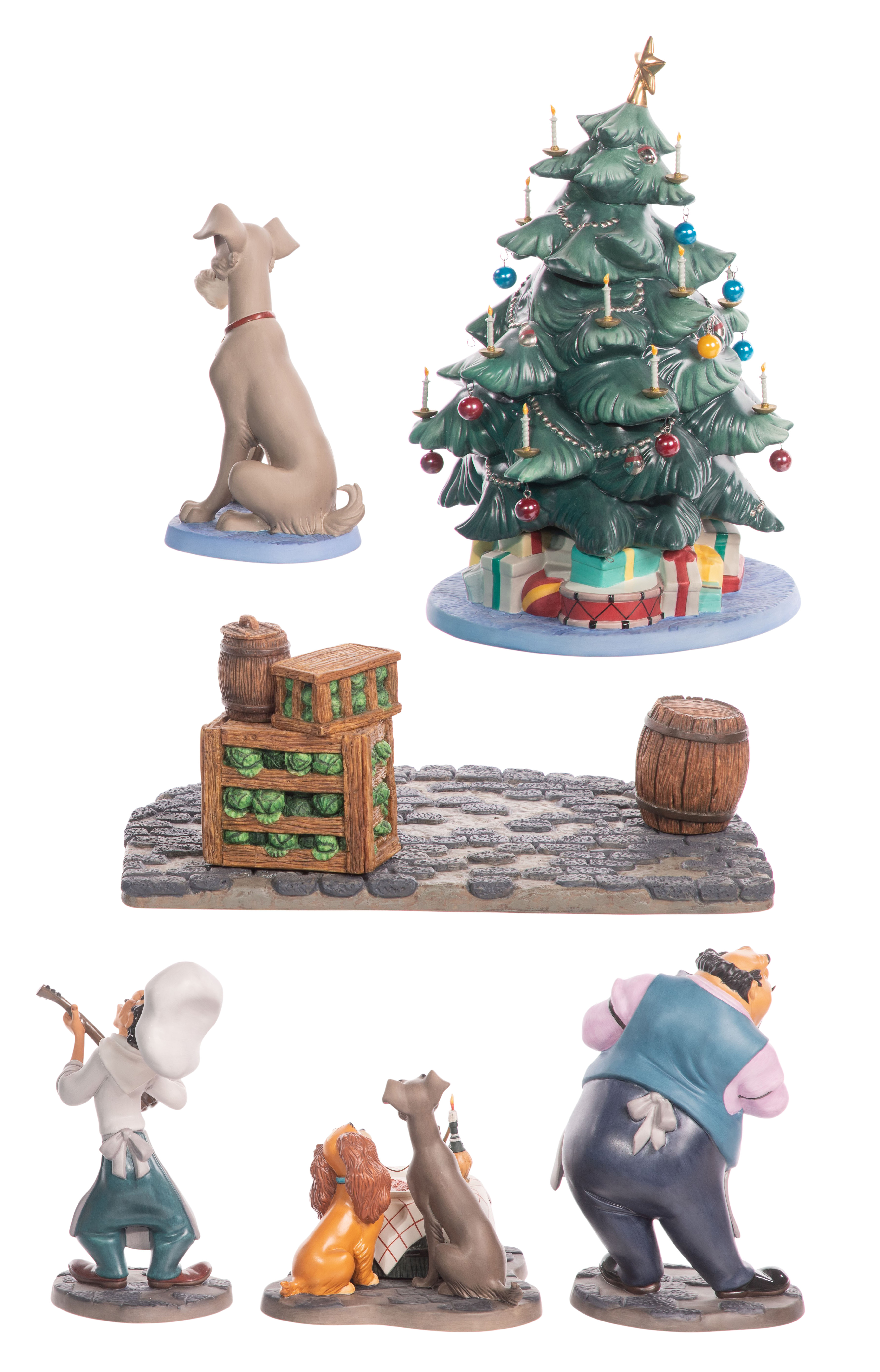 (5) items including in porcelain #1217797 ‘Tramp and Tree’ two-piece Christmas set having original packing and box, ‘Bella Notte’ Lady and Tramp, ‘Bella Notte’ Joe and ‘Bella Notte’ Tony as well as a resin ‘Bella Notte Base’