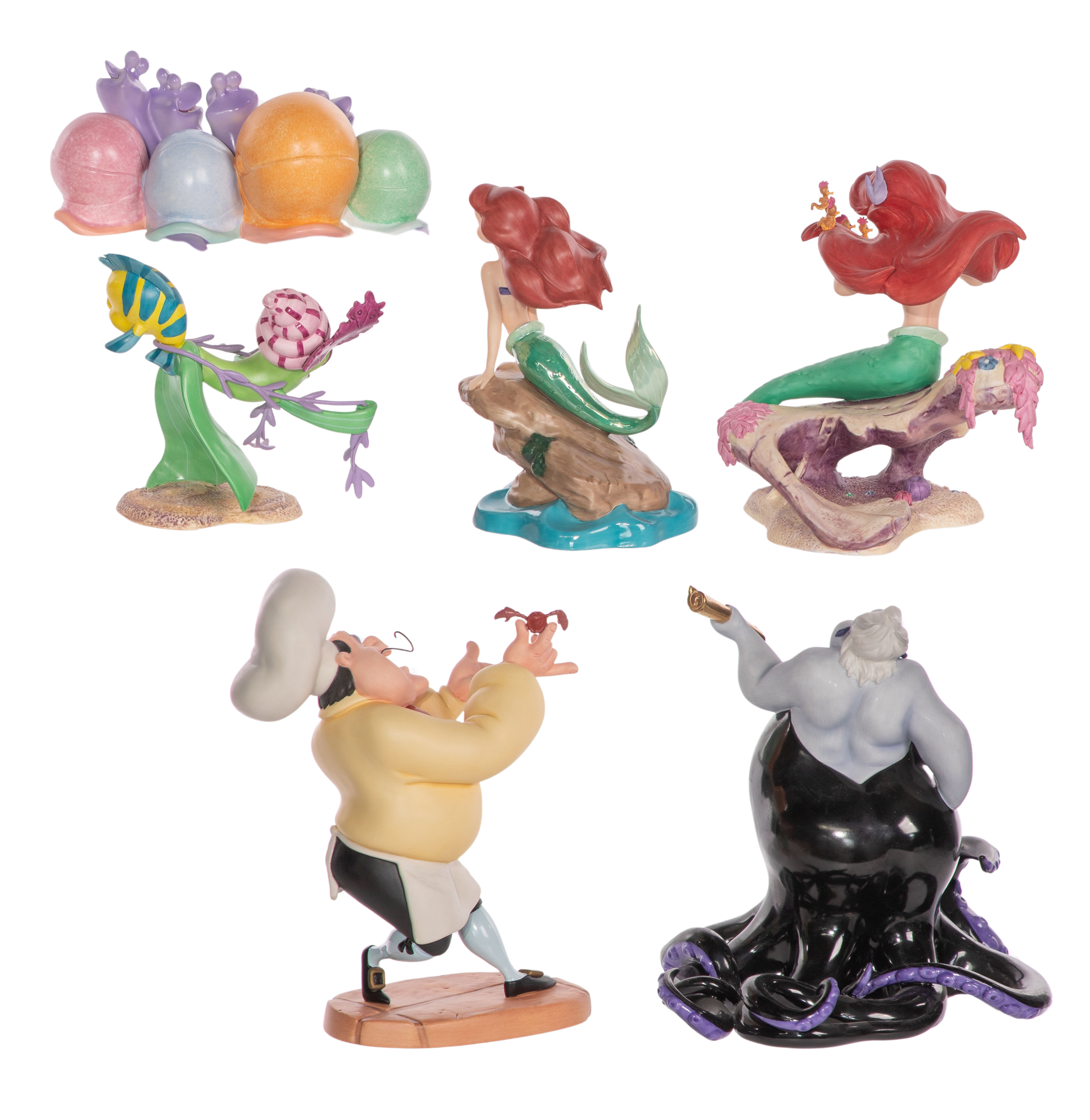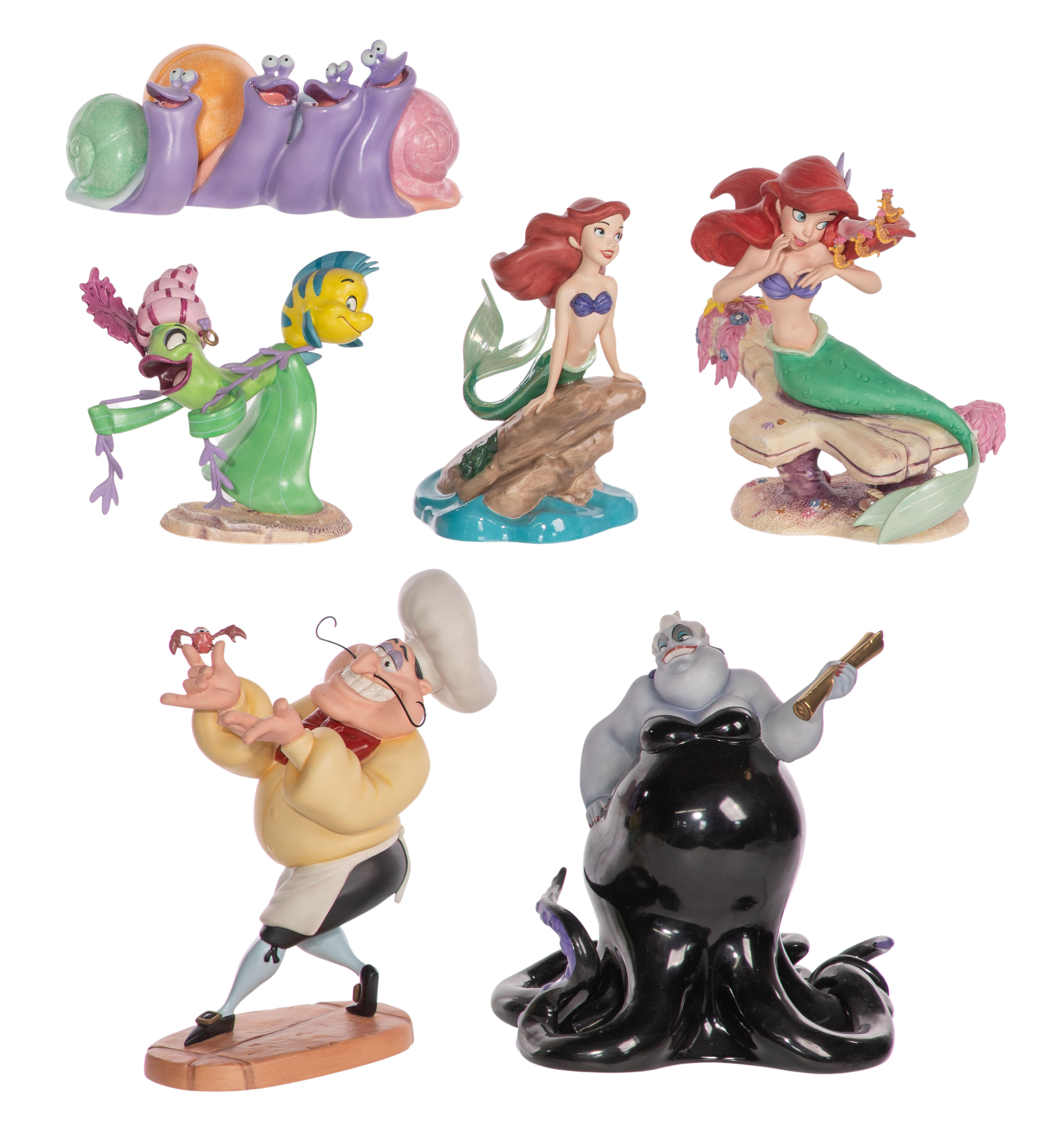 (6) porcelain items of various sizes, characters and scenes including Ursula, The Chef and Sebastian, Flounder, The Singing Snails and (2) Ariels, all marked on the underside