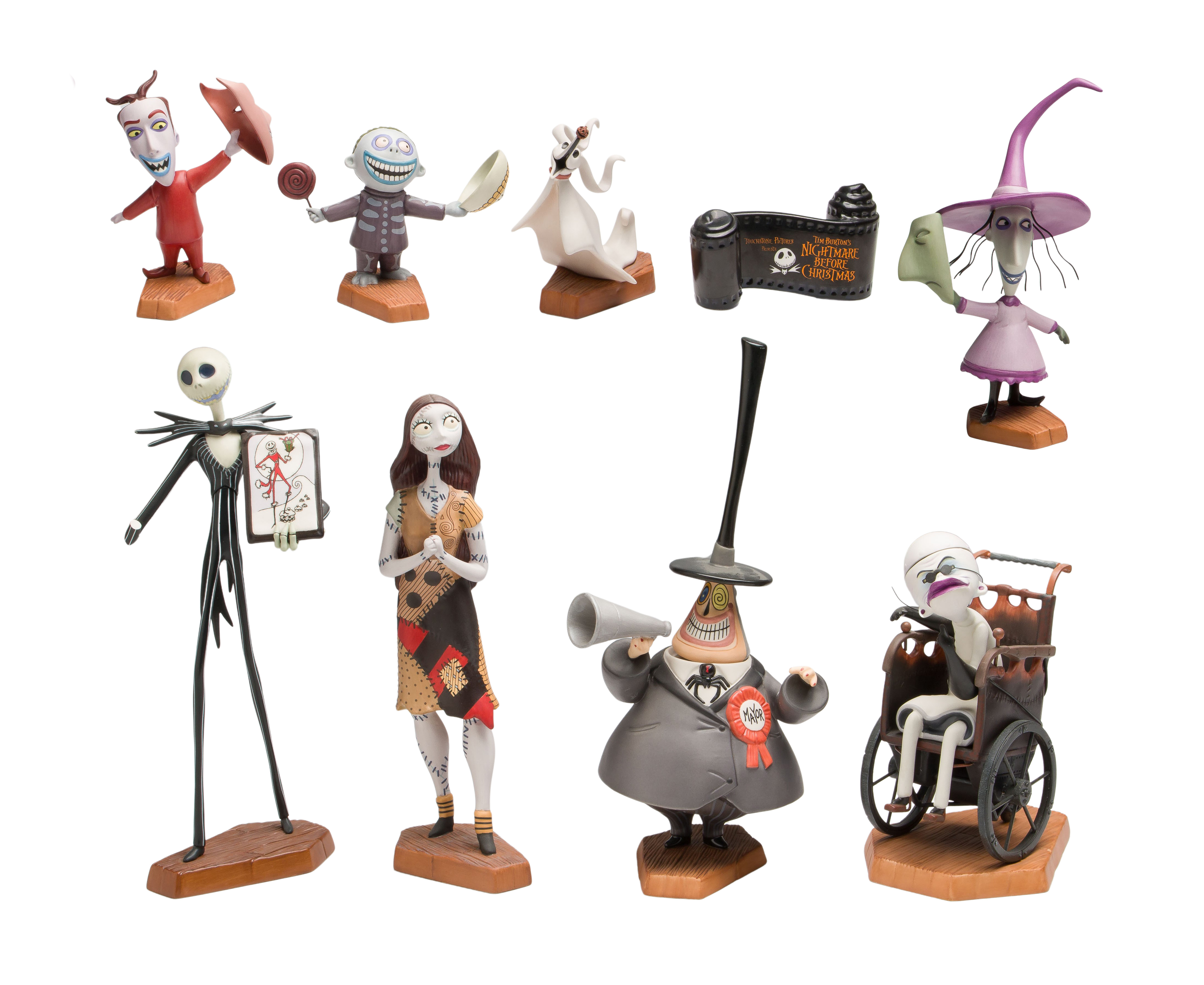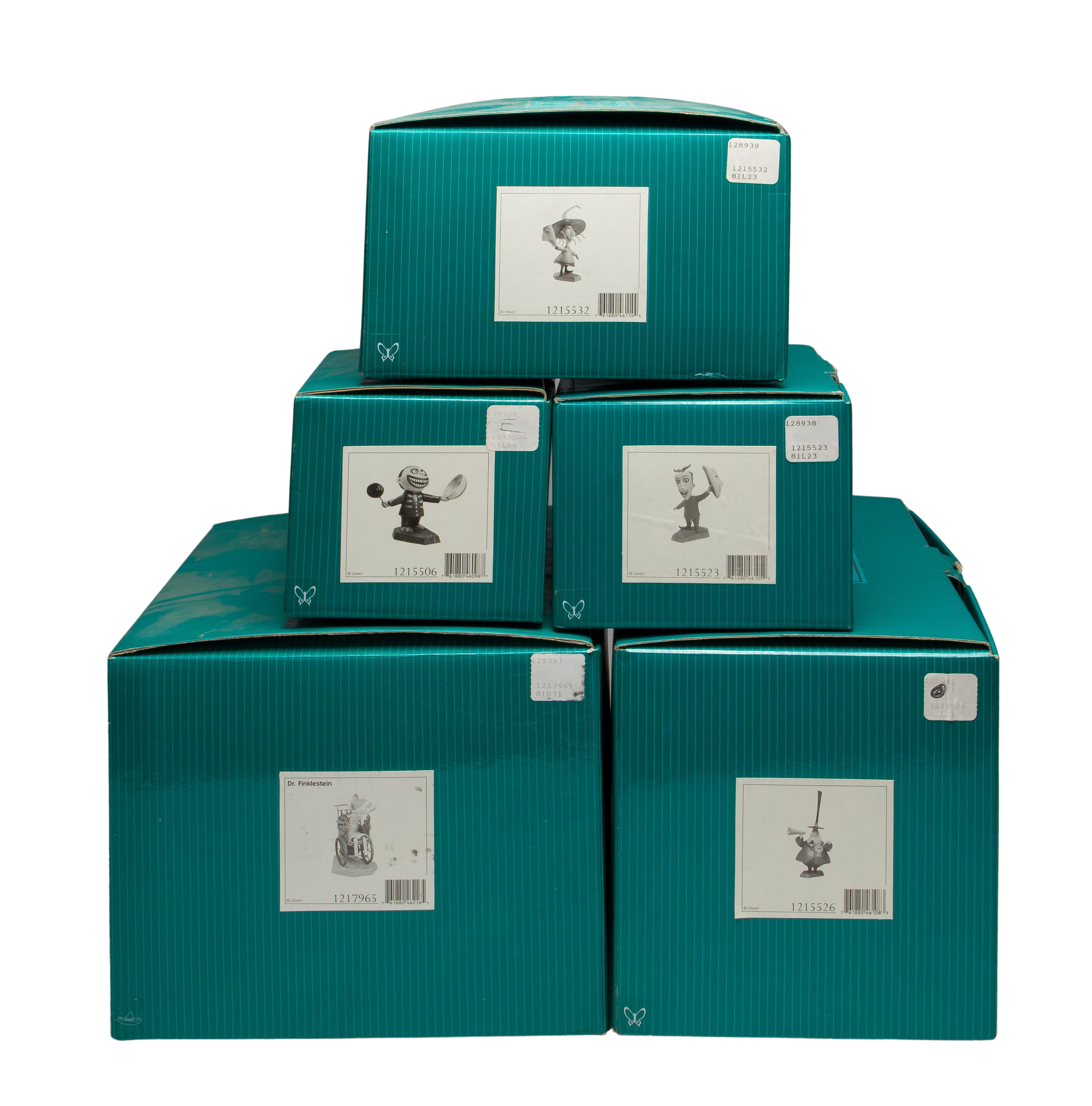 (9) porcelain items including ‘My Christmas is Filled With Laughter and Joy’ Jack, ‘The Sandy Claws Seamstress’ Sally, ‘Spirited Companion’ Zero and an Opening Title plaque, all above lacking boxes, boxed items include #1217965 ‘Unhinged’ Dr. Finklestein, #1215526 ‘Two-faced Politician’ Mayor, #1215523 ‘Birds of a Feather’ Lock, #1215532 ‘Three Of a Kind’ Stock and #1215506 ‘Now and Forever’ Barrel