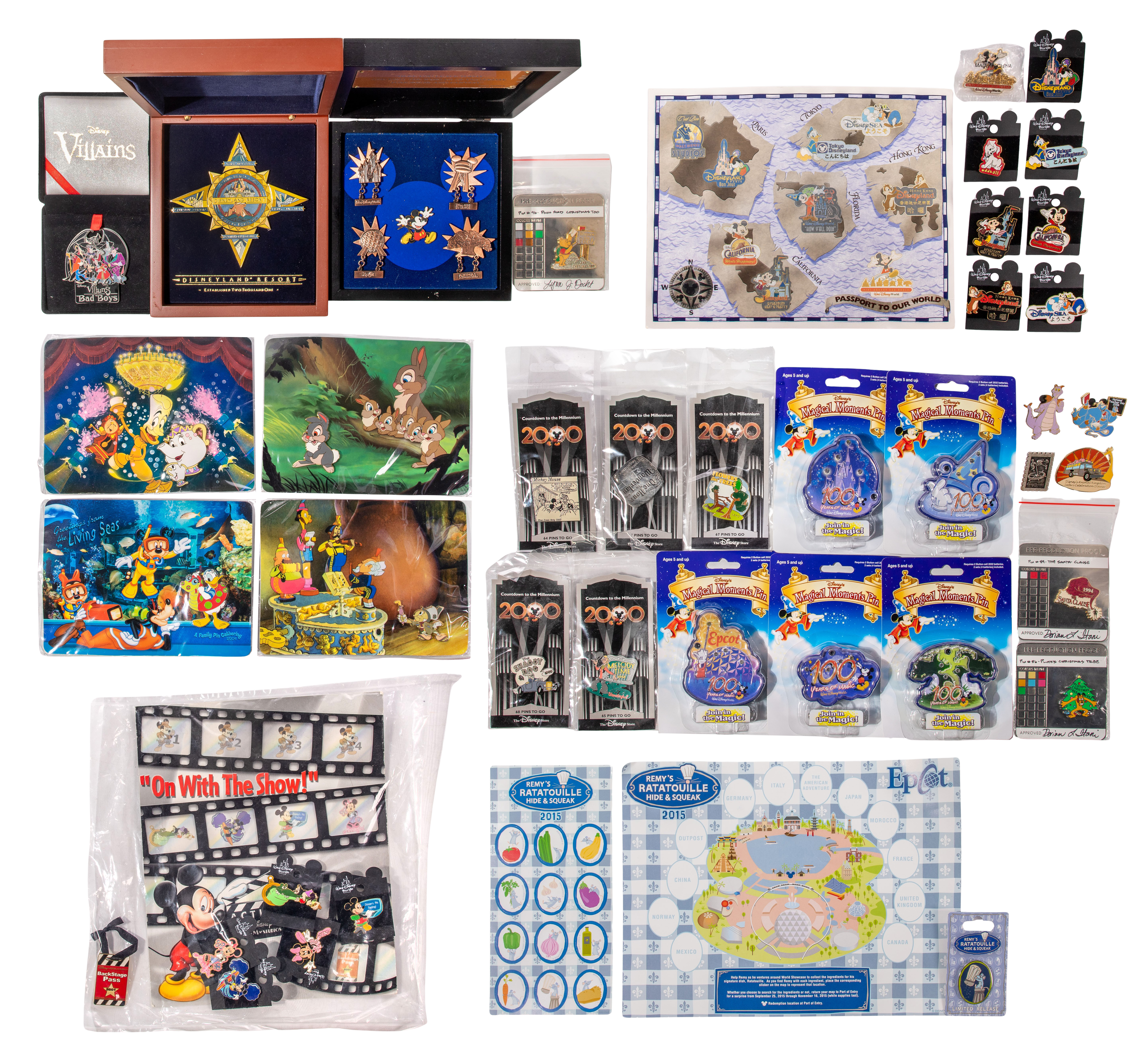 (19) items including (3) Pre-Production Pin Proofs (‘Pluto’s Christmas Tree’, ‘The Santa Clause’ and ‘Pooh and Christmas Too’), a Walt Disney World 5-pin set in a wood box #295/1000, a Disneyland Resort pin in wood box, (4) postcard and pin sets, each from editions of 1000 sealed in original bags, (5) ‘!00 Years of Magic’ pin sets in sealed bubble packs, a ‘Pin Trading’ 4-pin set in sealed bag, a partial set of ‘Countdown to Millennium’ pin set in card-backed packs bagged, an ‘On With the Show’ pin set sealed in bag, a ‘Passport to Our World’ activity and pin set and a ‘Ratatouille’ activity and pin set