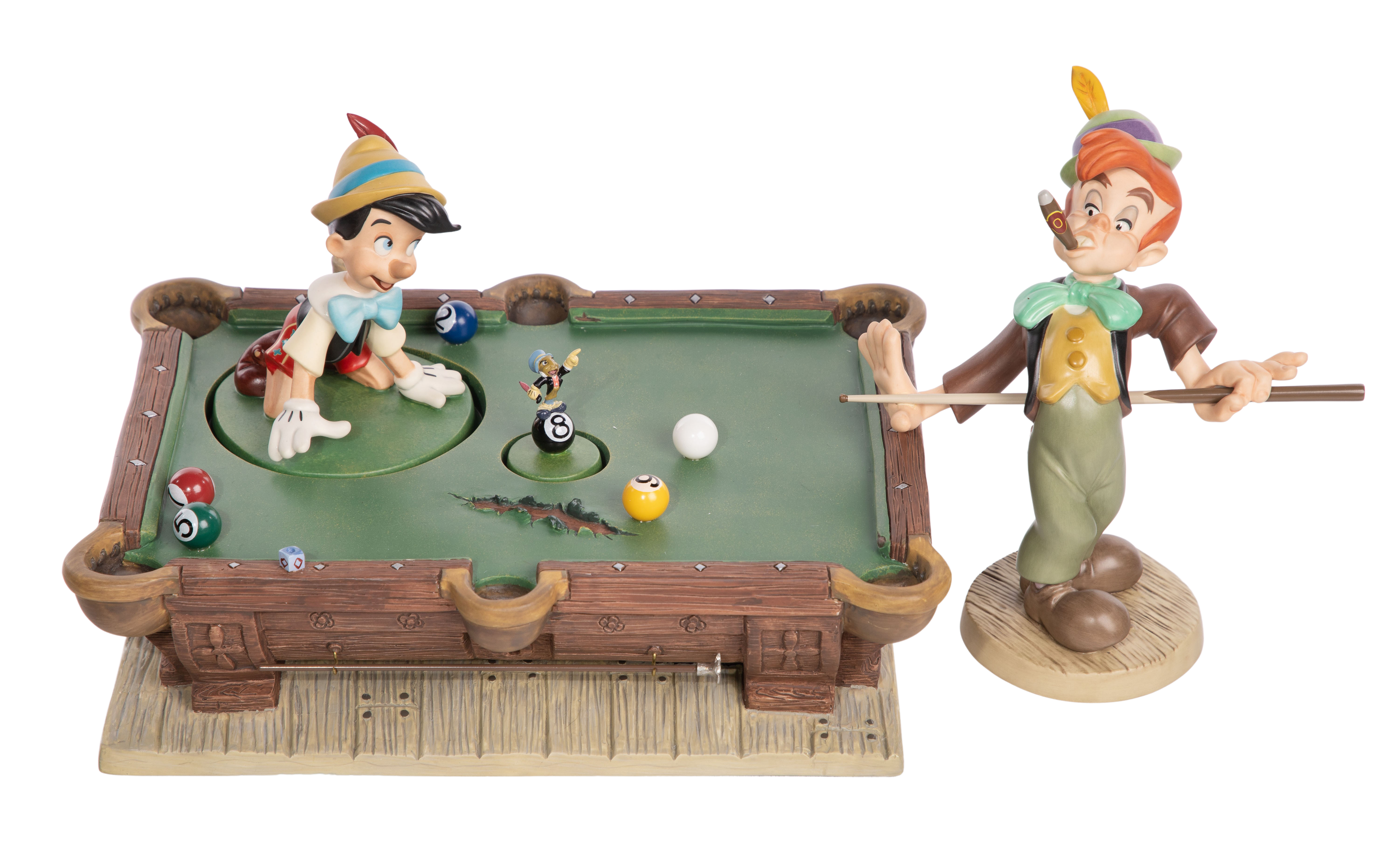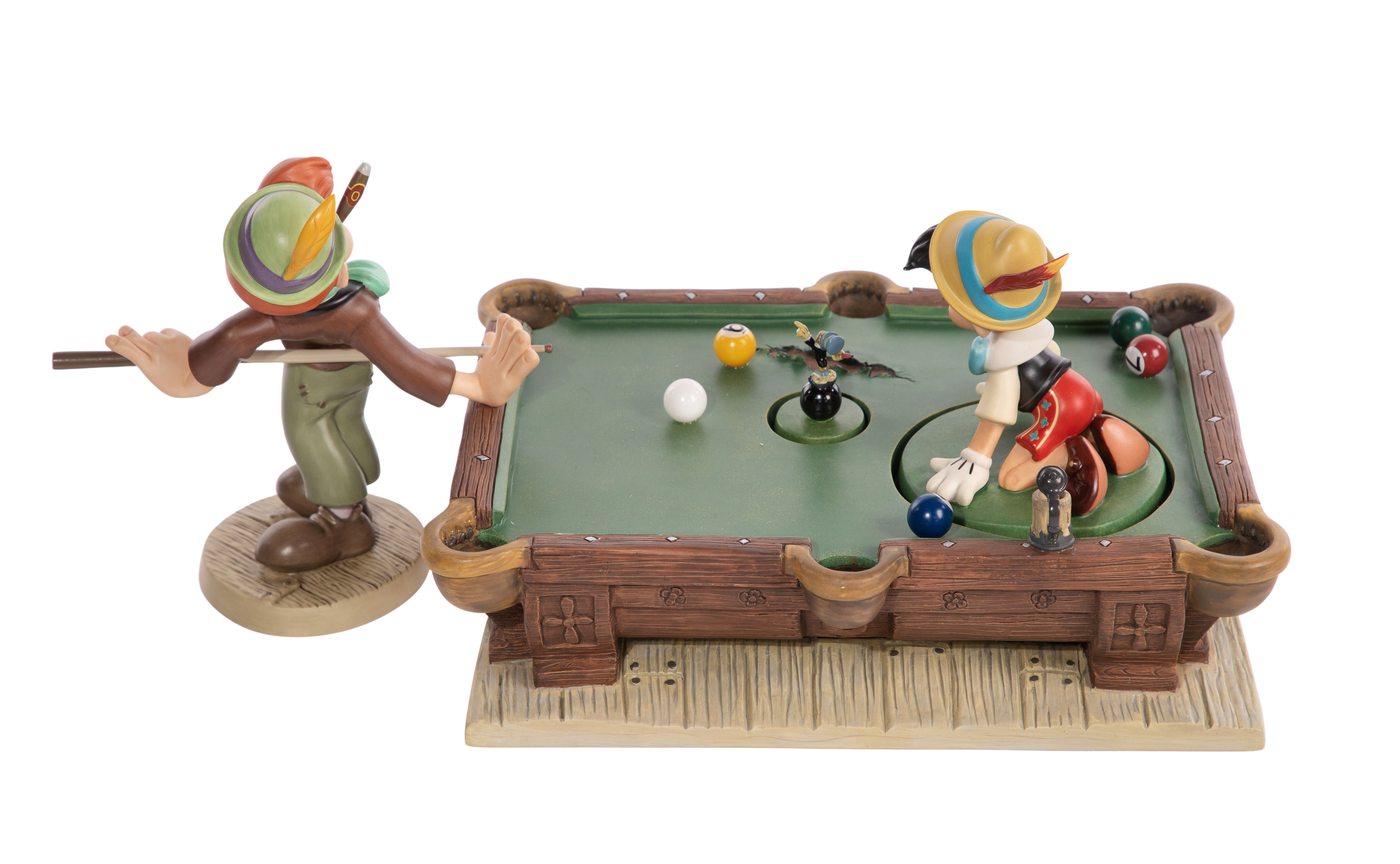 (3) porcelain items including a ‘Screwball in the Corner Pocket’, a ‘He’s My Conscience’ of Pinocchio and Jiminy Cricket (with box) and a pool table having a bridge accessory
