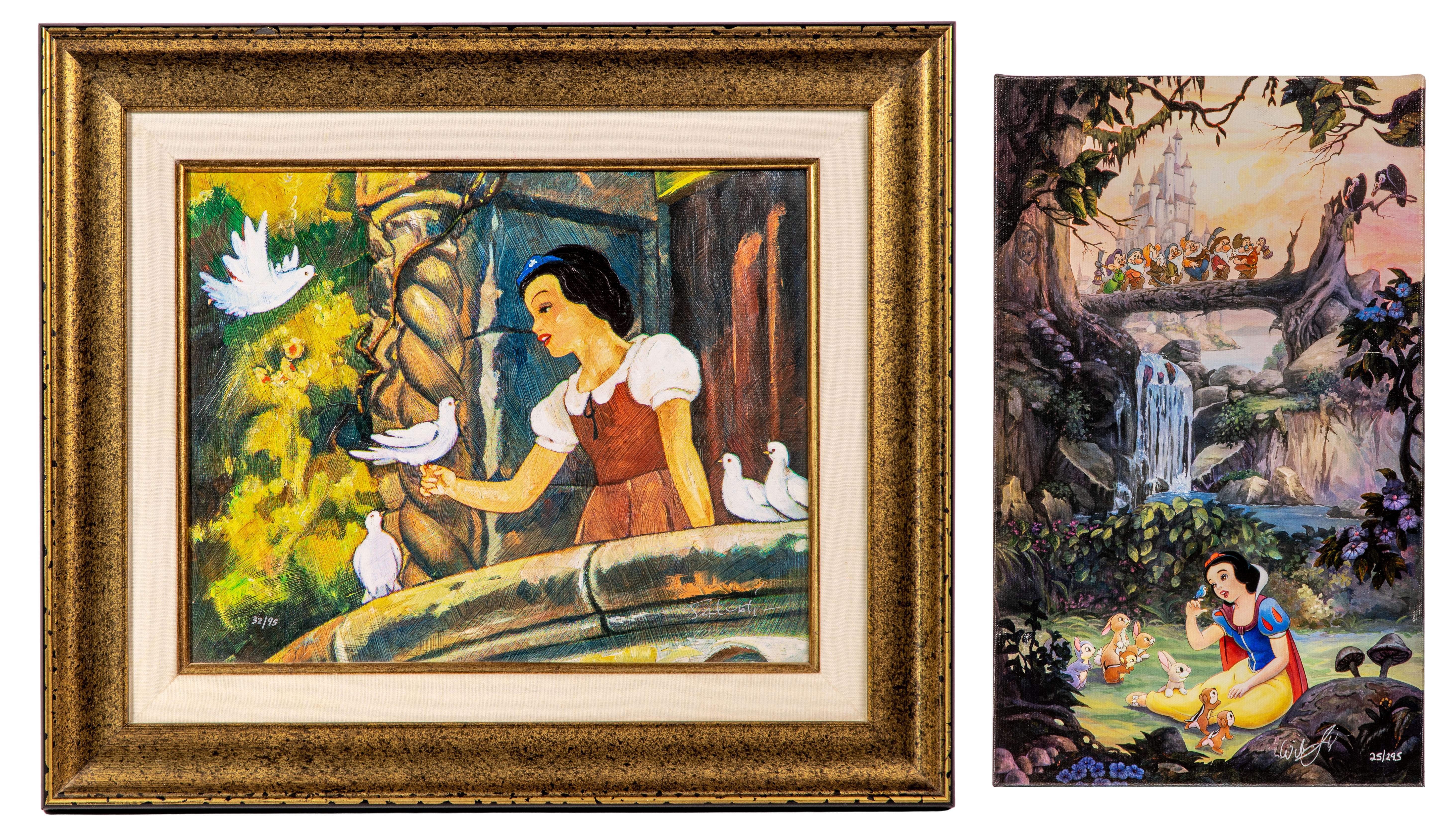 (2) items including a 2005 ‘Snow White on the Balcony’, ink signed ‘Jim Salvati’ lower right, #32/95 lower left, in a linen lined bronze-tone wood frame having a Collectors Editions COA attached verso and an undated ‘Song Bird’, ink signed ‘William Silvers’, #25/295 lower right, gallery wrapped canvas on stretcher, signed again on backing board along also having a crayon sketch of a chipmunk and toadstool, COA and artist biography in attached plastic sleeve