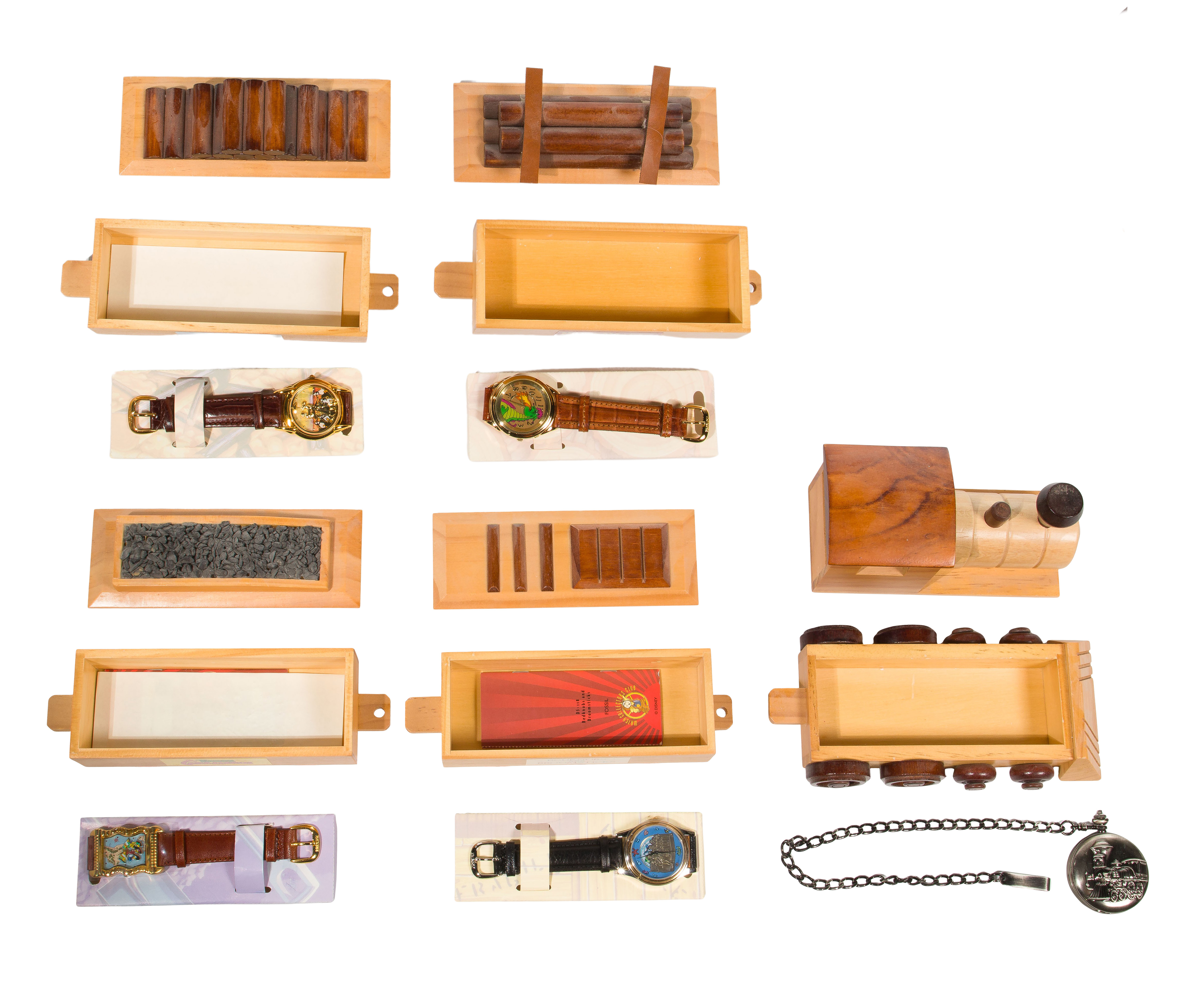 A 5-piece set including (4) Fossil wristwatches and a pocket watch, each watch coming in a labeled wood train car display case, connecting to form a train, most having papers