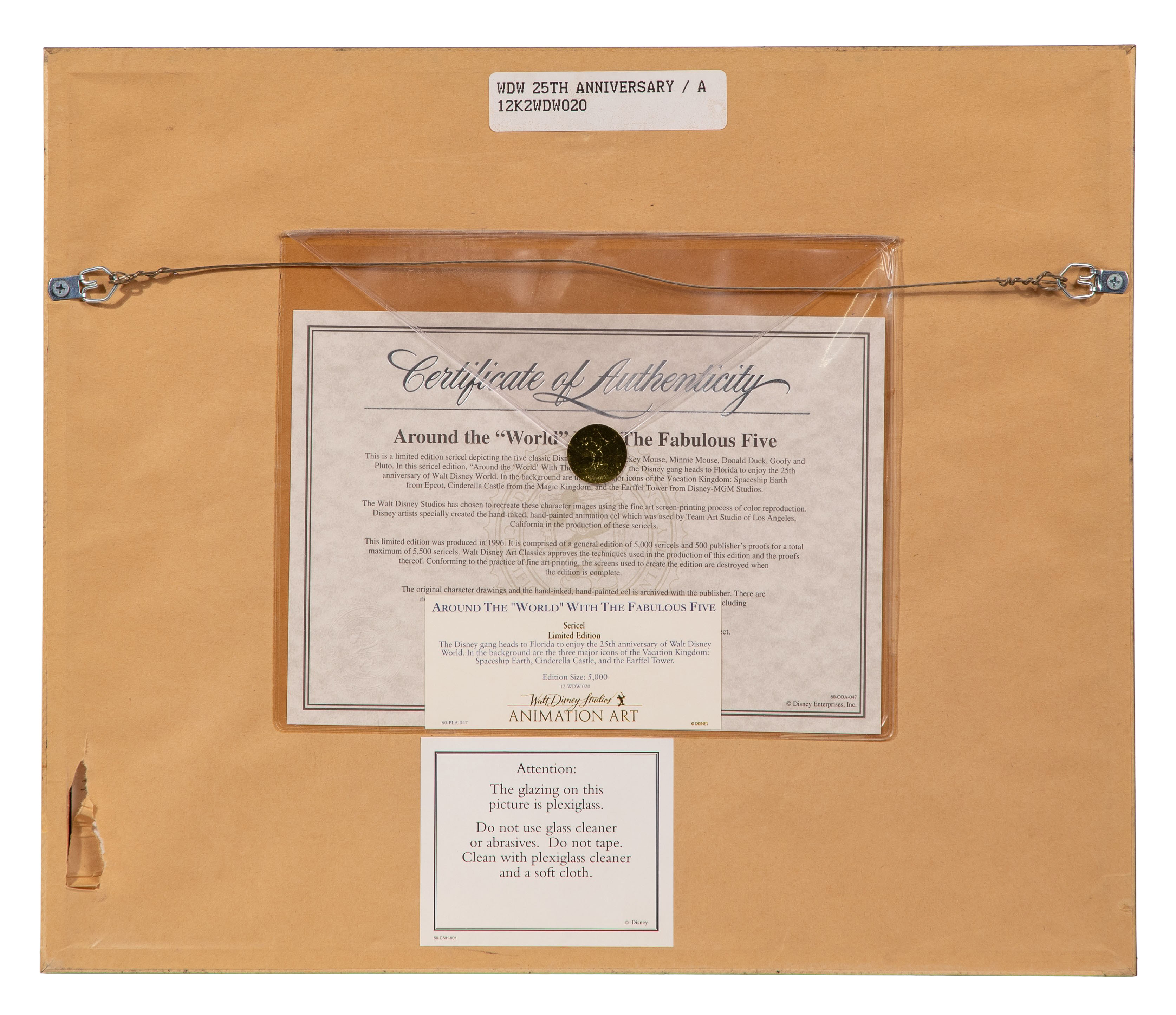 (2) sericels including ‘Magic of Disney, 25th’ and ‘Around the World with The Fab Five’ celebrating Disney World’s 25th Anniversary having Disney Productions stamp and COA verso, both matted under acrylic in wood and metallic frames