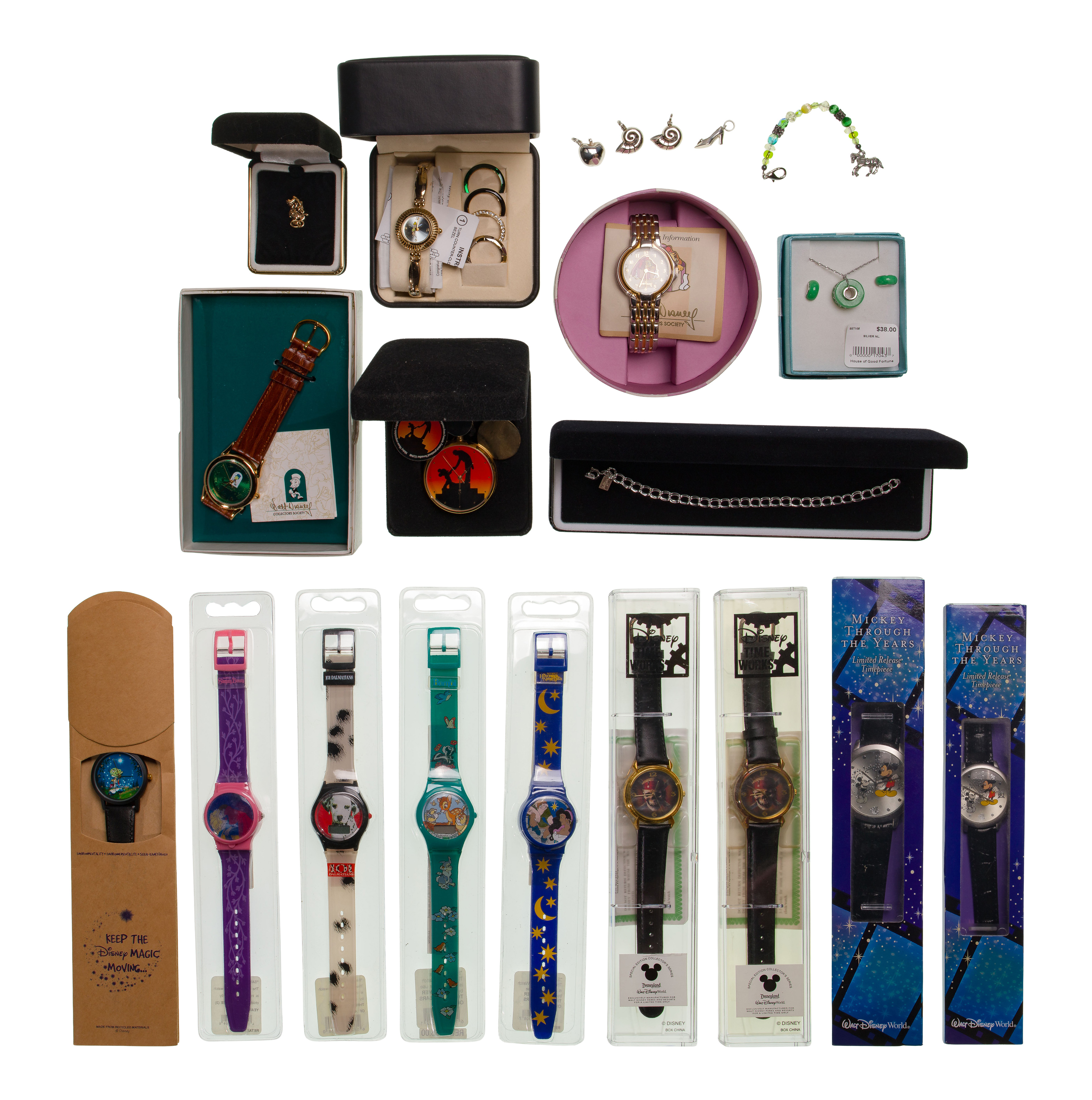 (21) items including a Mickey Mouse pendant (marked ’14k’), charms, bracelets, earrings and pendants (marked ‘925’) and (13) various Disney character watches including a pocket watch, all having original packaging