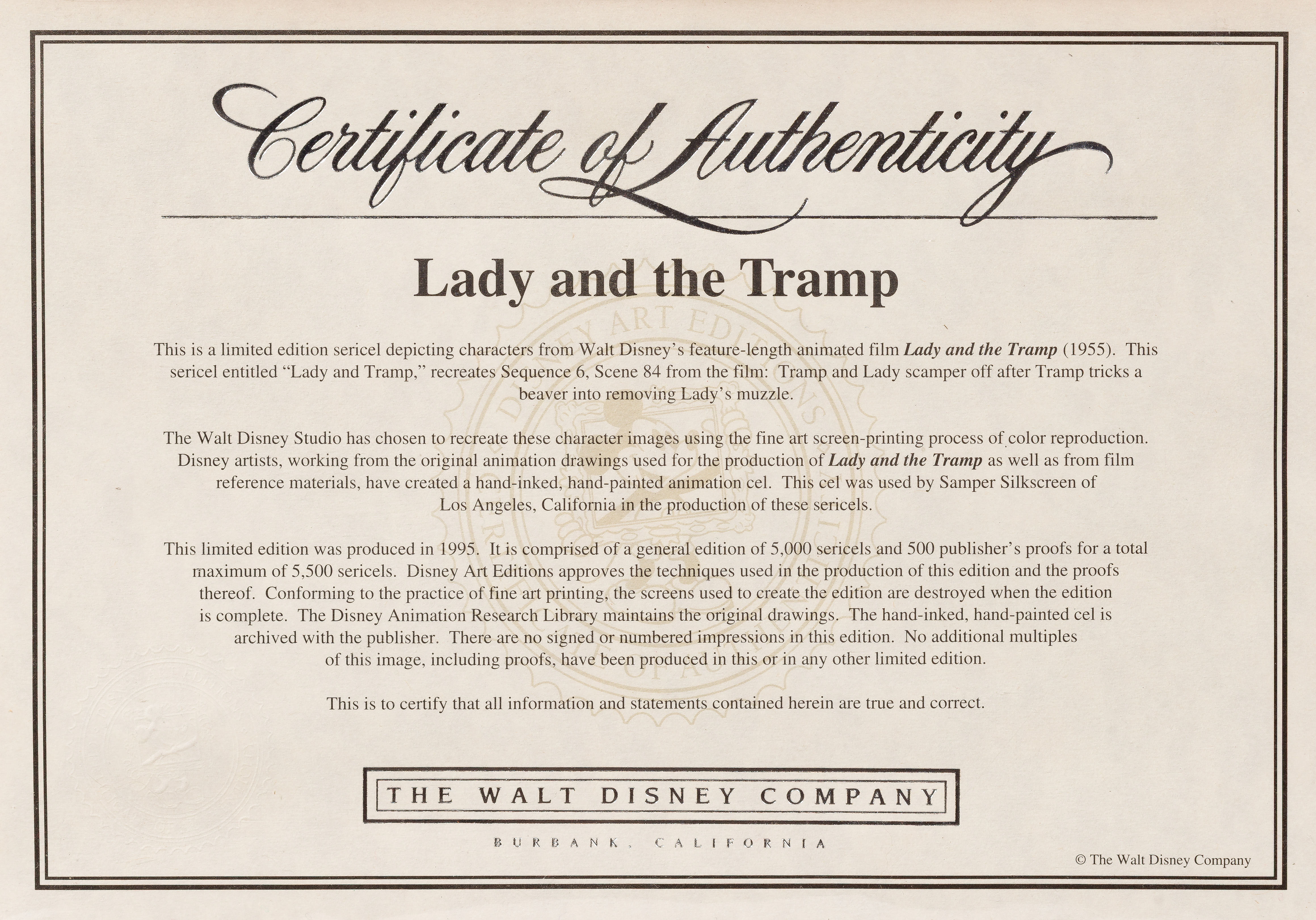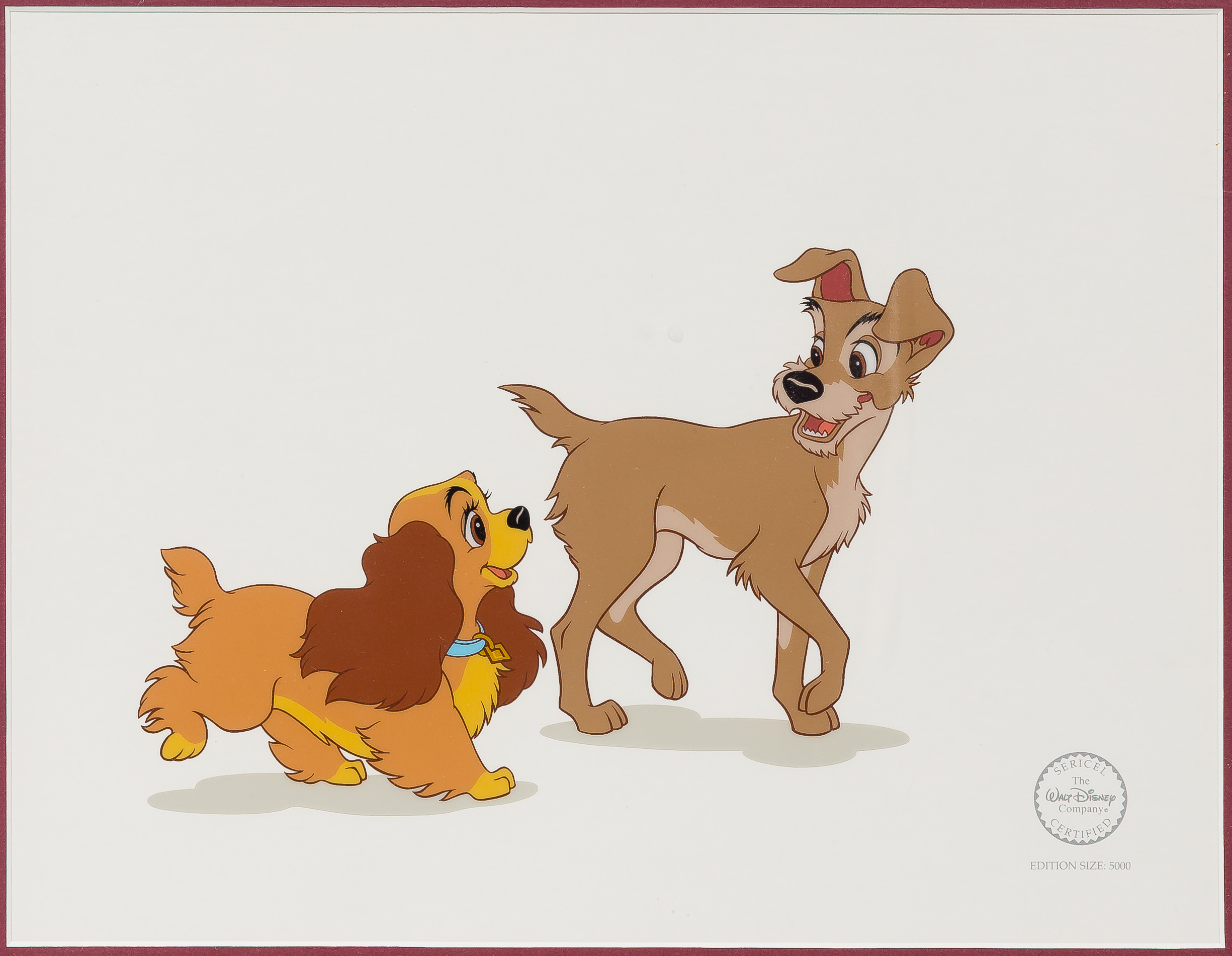 (2) items from the movie ‘Lady and the Tramp’ including ‘First Flirtation’, #322/500 and ‘Lady and the Tramp’ having COA verso, both having official Disney stamps and matted under acrylic in wood frames