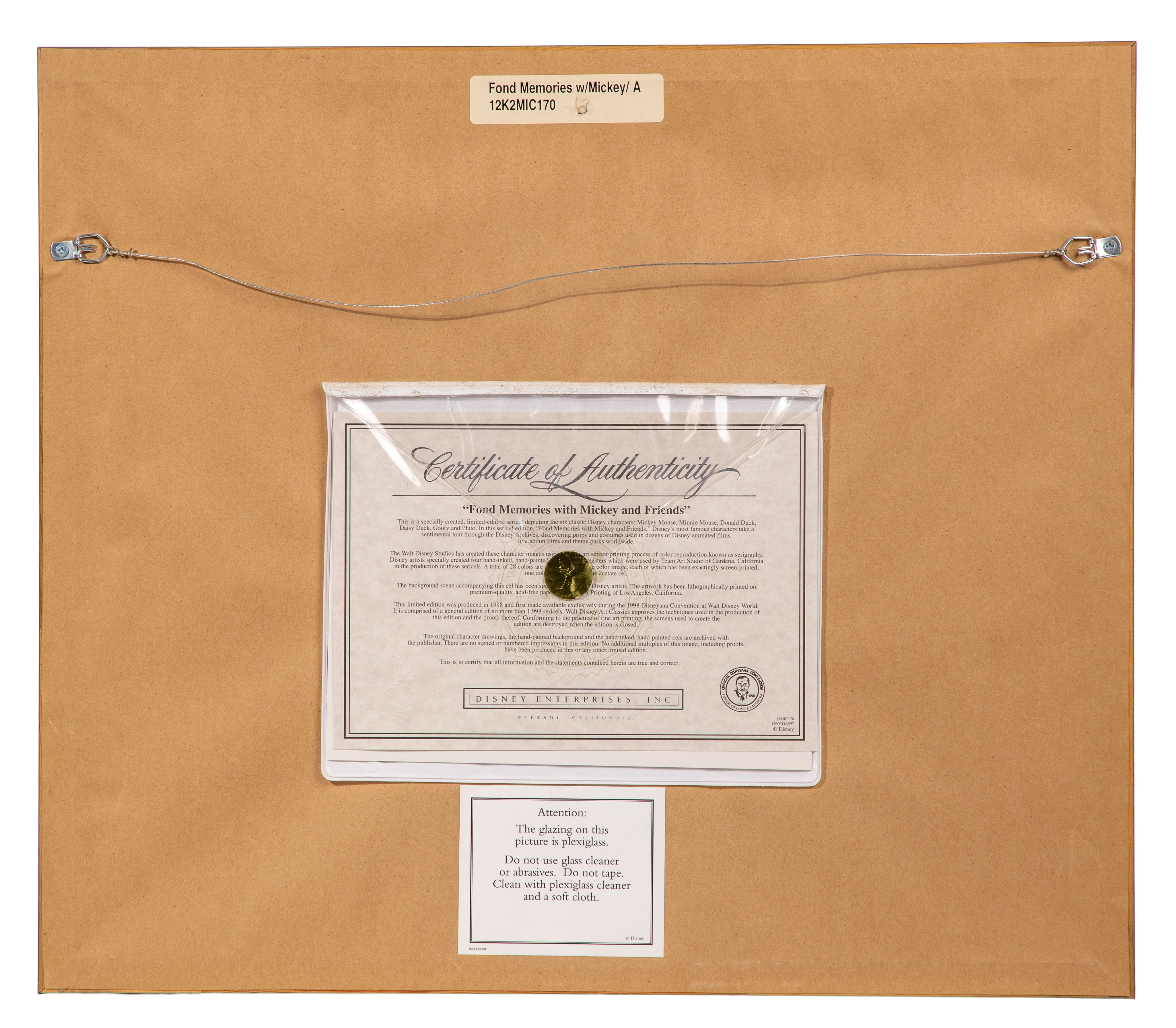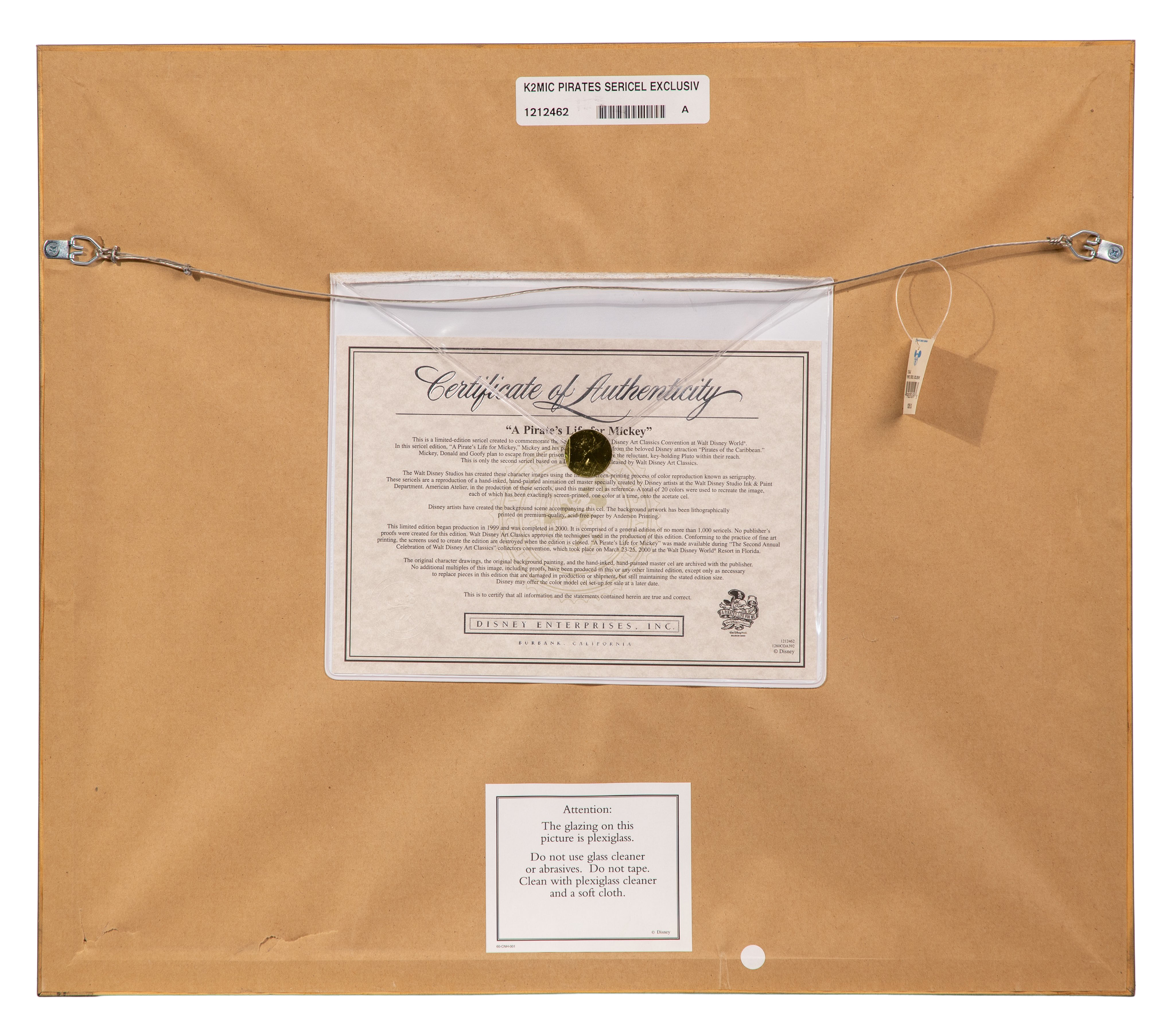 (2) sericels including ‘Fond Memories with Mickey and Friends’ and ‘A Pirate’s Life for Mickey’, both having Disney Productions stamps and COAs verso, matted under acrylic in wood frames