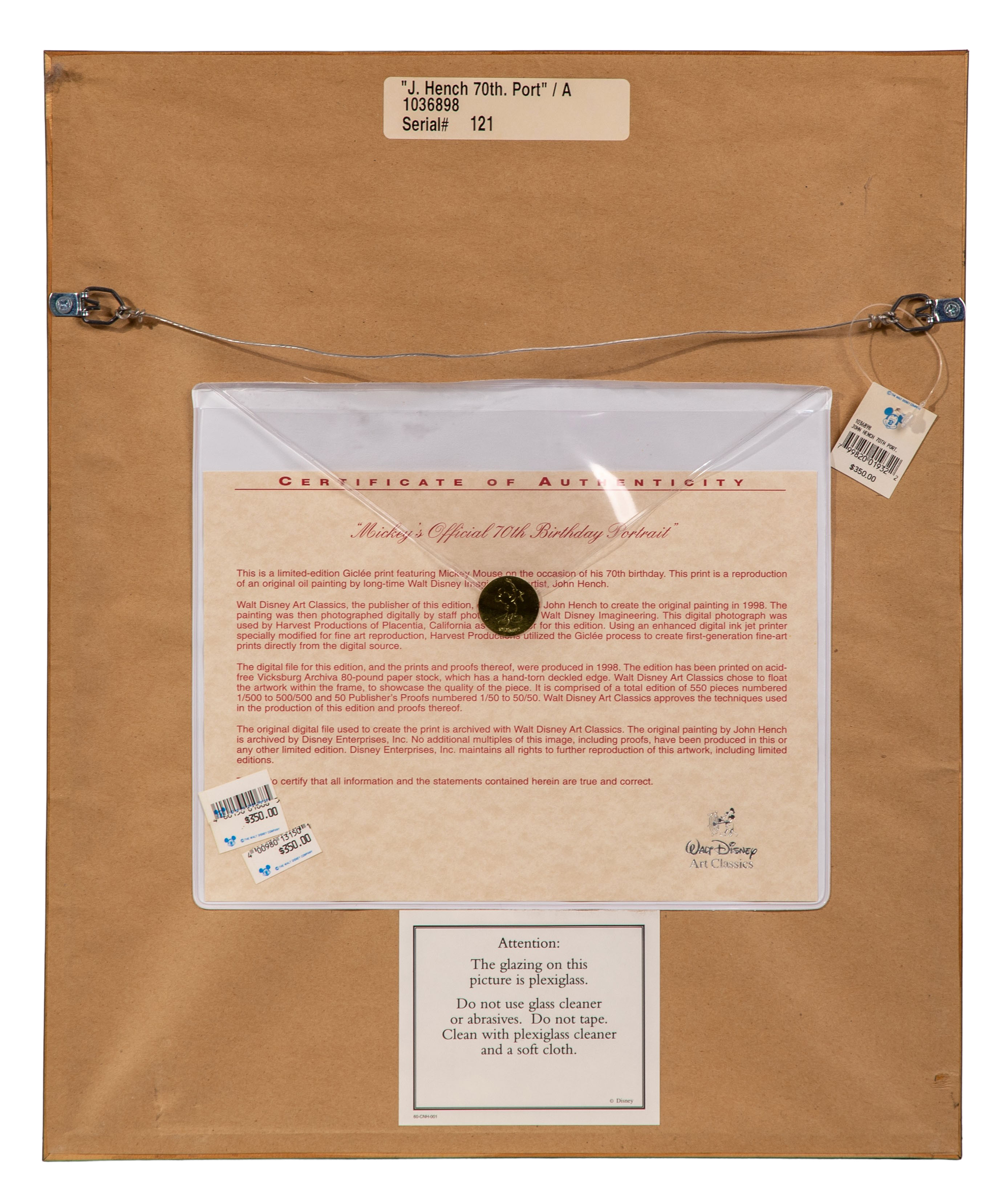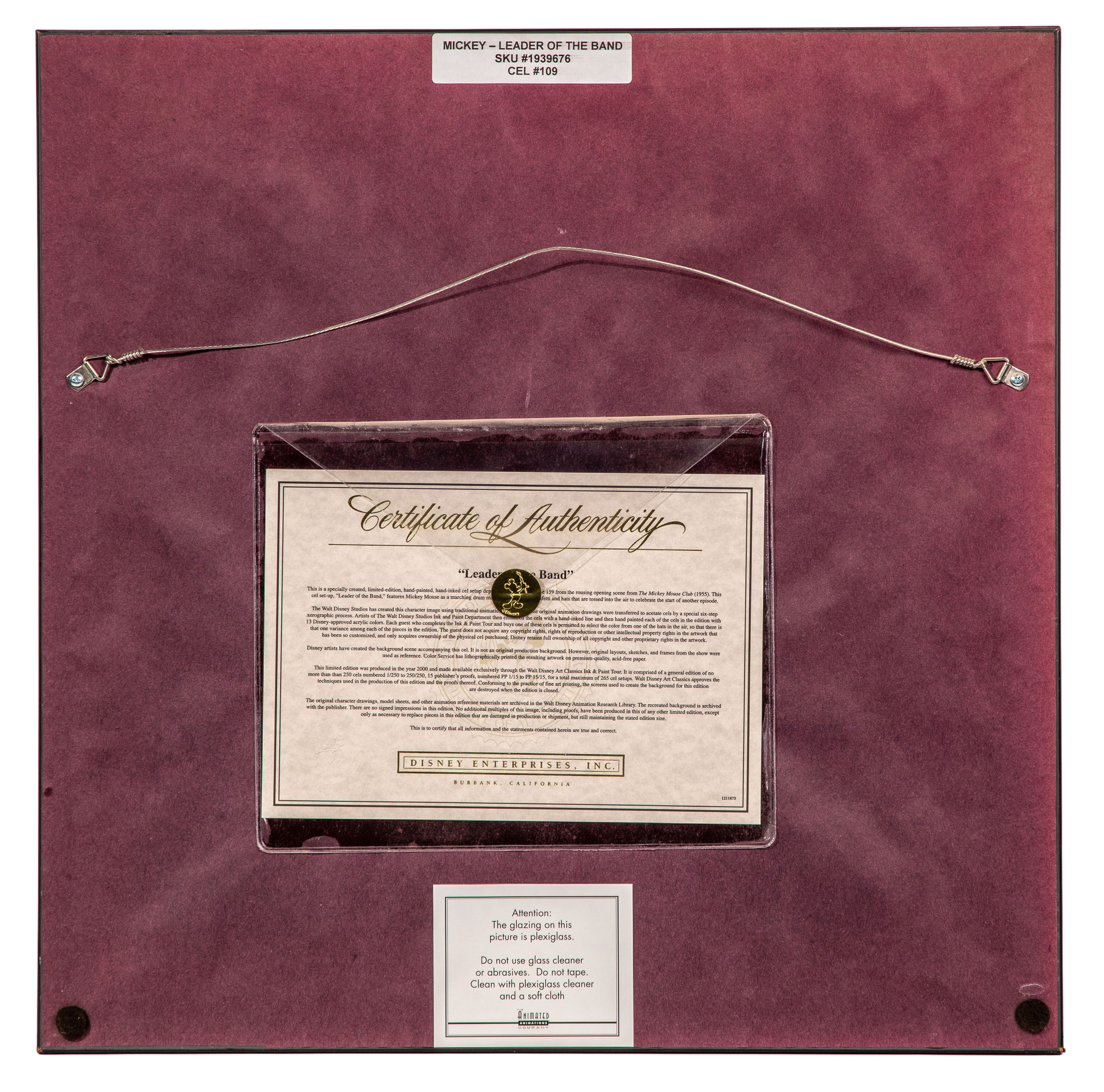 (2) items including 1998 ’70th Birthday Portrait’ giclee, #121/500, pencil signed ‘John Hench’ on mat and ‘Leader of the Band’ sericel, #109/250, signed ‘Bill Justice’, both having Disney Productions stamps and COAs verso, matted under acrylic in wood frames