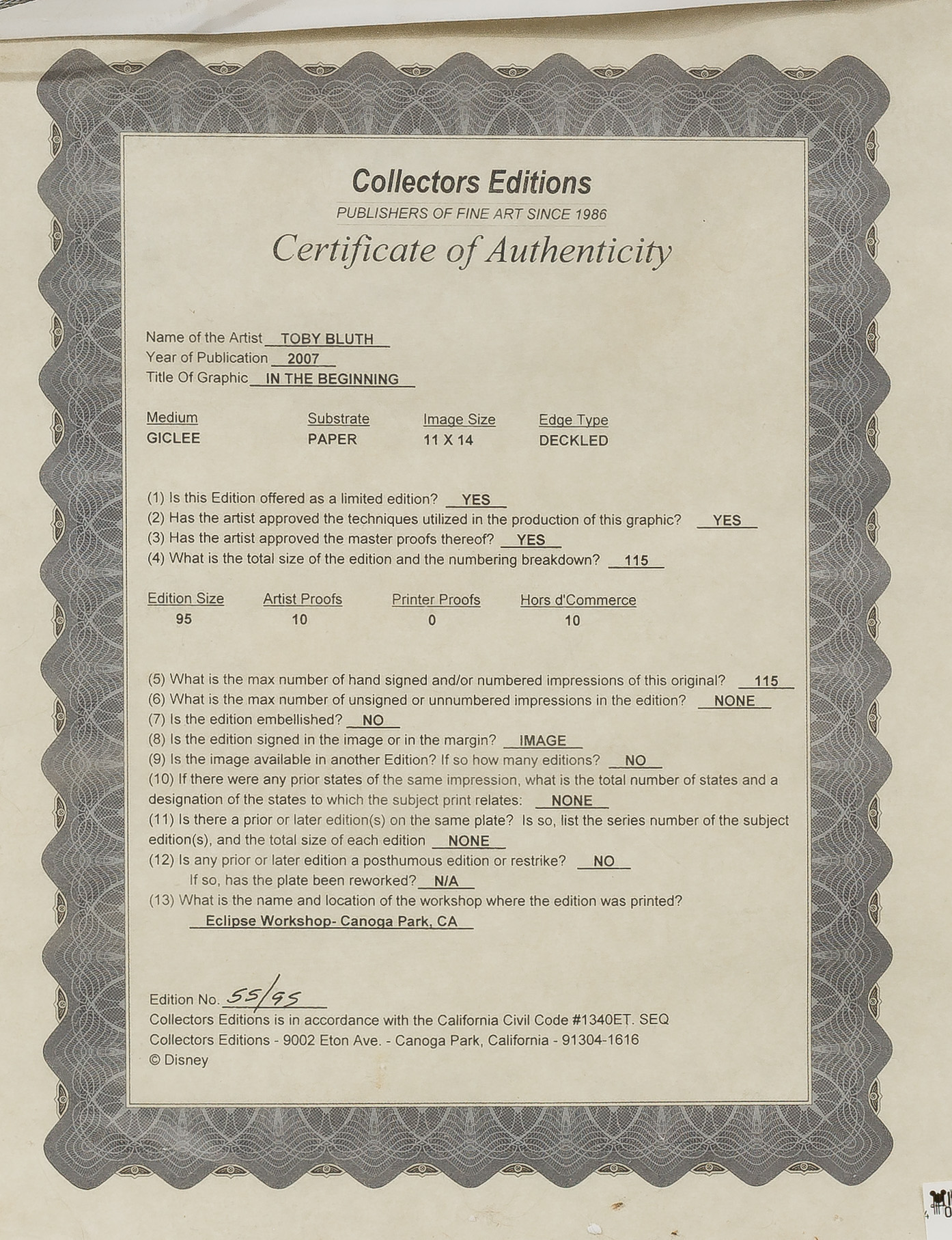 (2) items including a 2005 ‘New Friend’ signed by Noble lower right, #2/95 and a 2007 ‘In the Beginning’ signed by Bluth lower right, #55/95 having a COA verso, both float matted under acrylic in wood frames