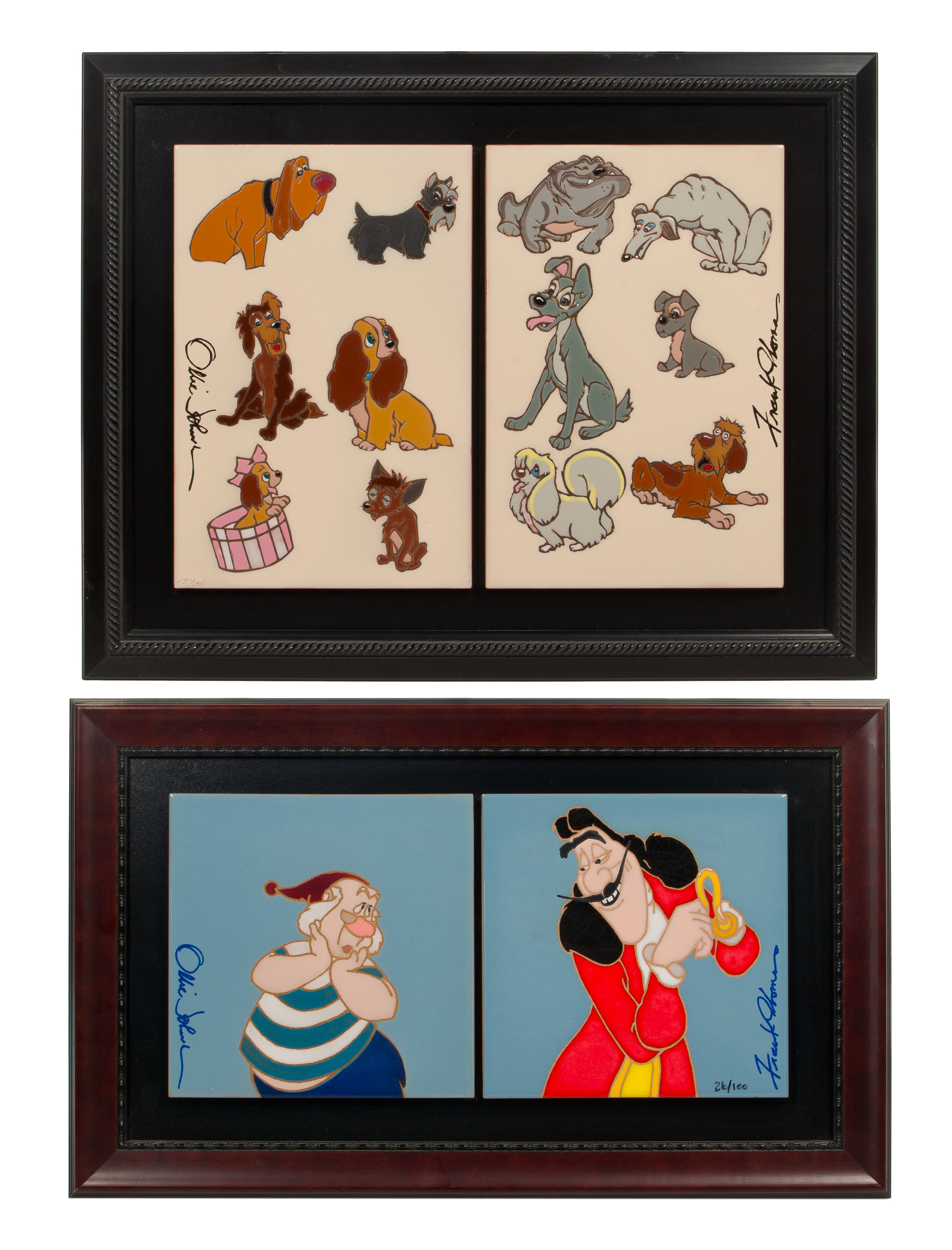 (2) frames, each containing two tiles, including ‘Lady and the Tramp’ characters, #15/100 having COA as well as Captain Hook and Smee, #26/100, both signed by Thomas and Johnston recto and verso, float mounted in wood frames, retaining a White Horse Studio label verso