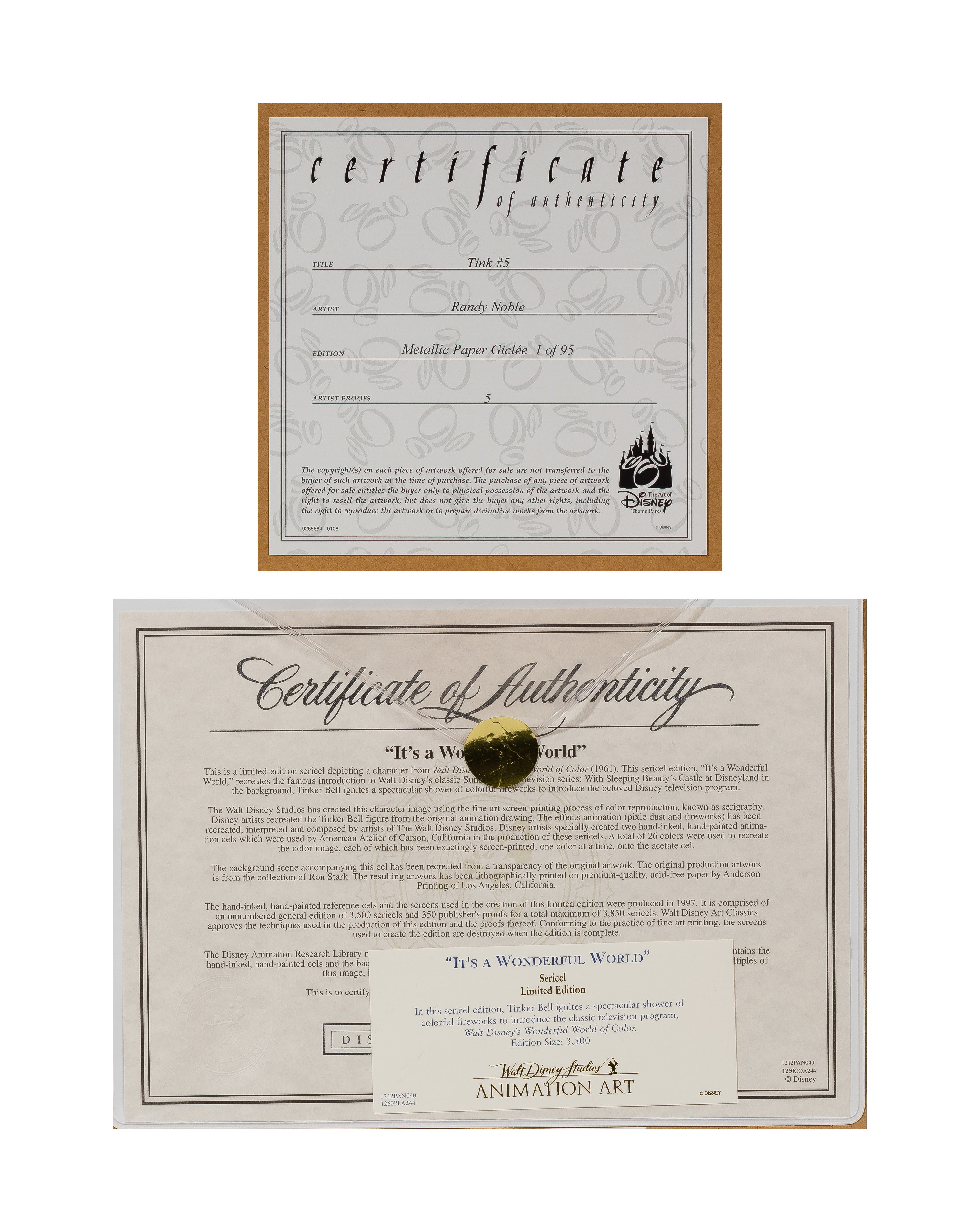 (2) items including a metallic paper giclee ‘Tink #5’ signed ‘Randy Noble’ lower left, #1/95 and ‘It’s a Wonderful World’ sericel from an edition of 3500, both matted under acrylic in wood frames having COAs verso