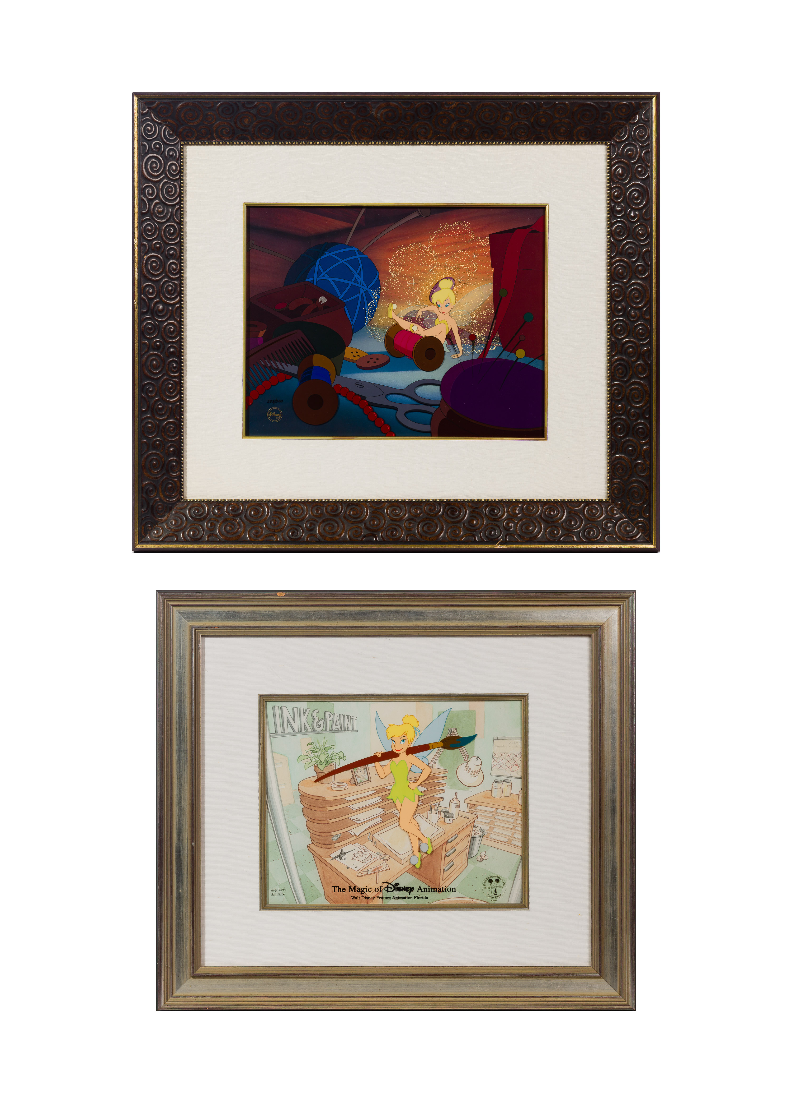 (2) items including ‘Chaos in a Dresser Drawer’, #288/500 and a 2002 mystery cel featuring Tinker Bell, #64/100, both having Disney Productions stamps and COAs verso, matted under acrylic in wood frames