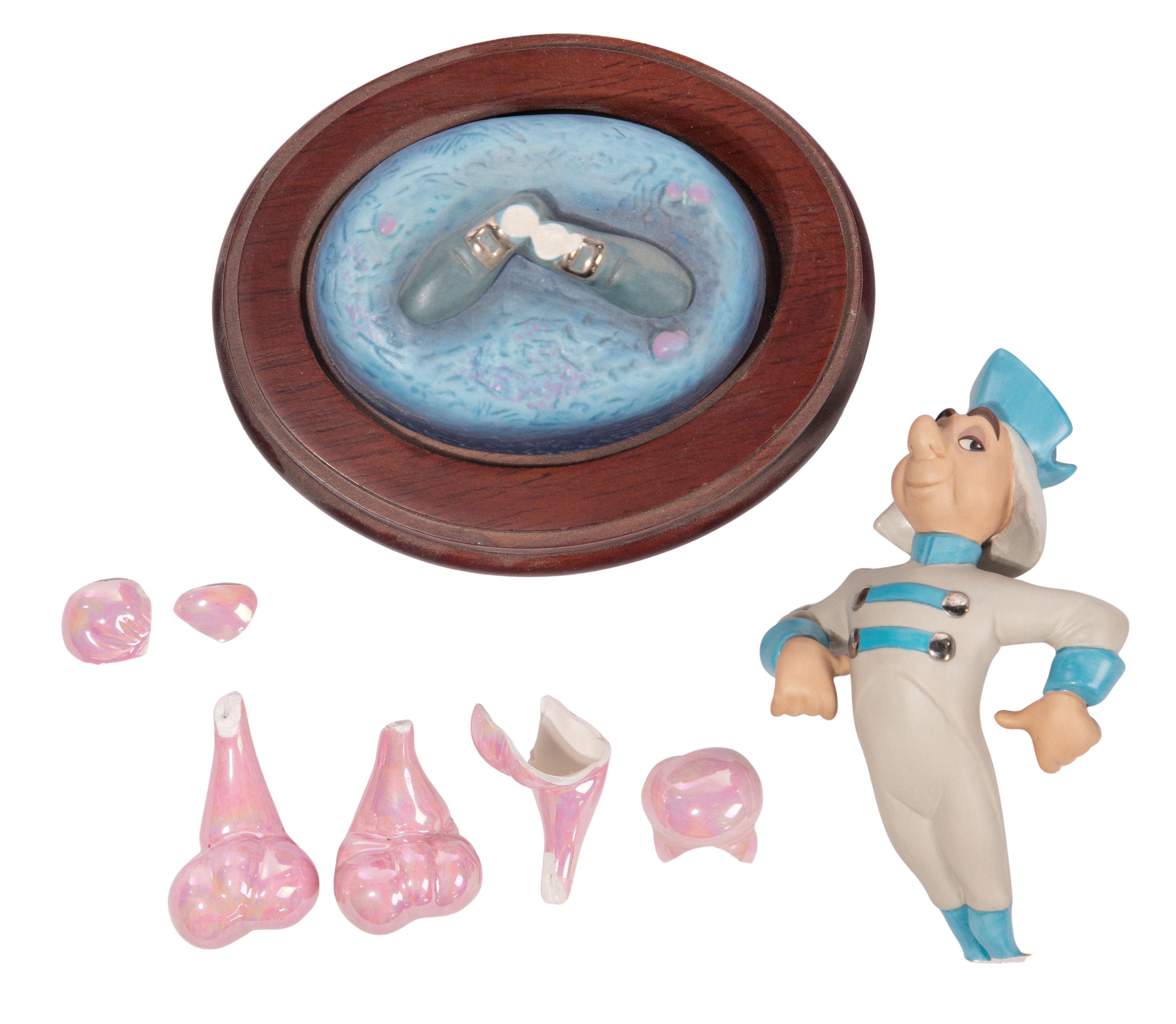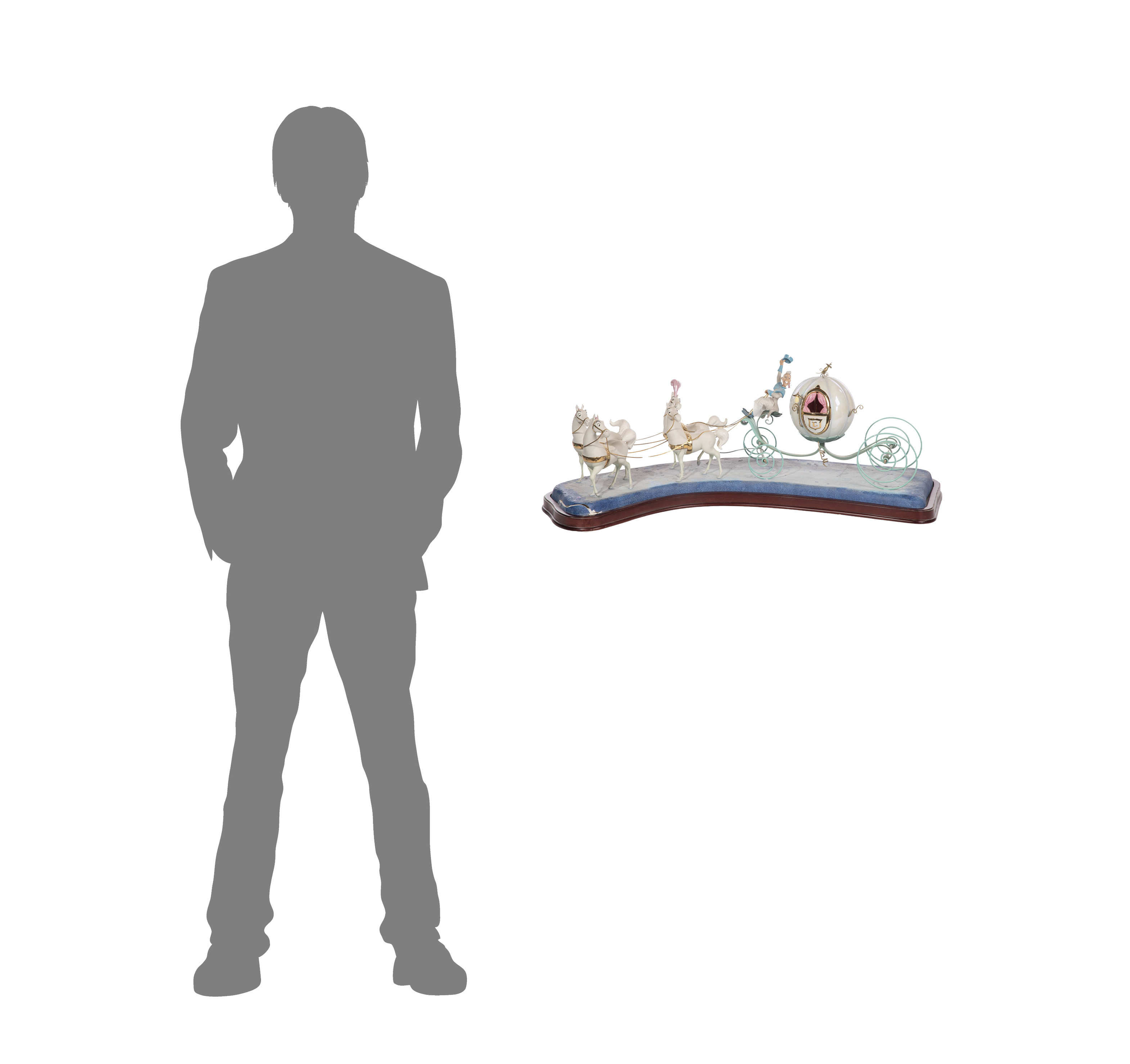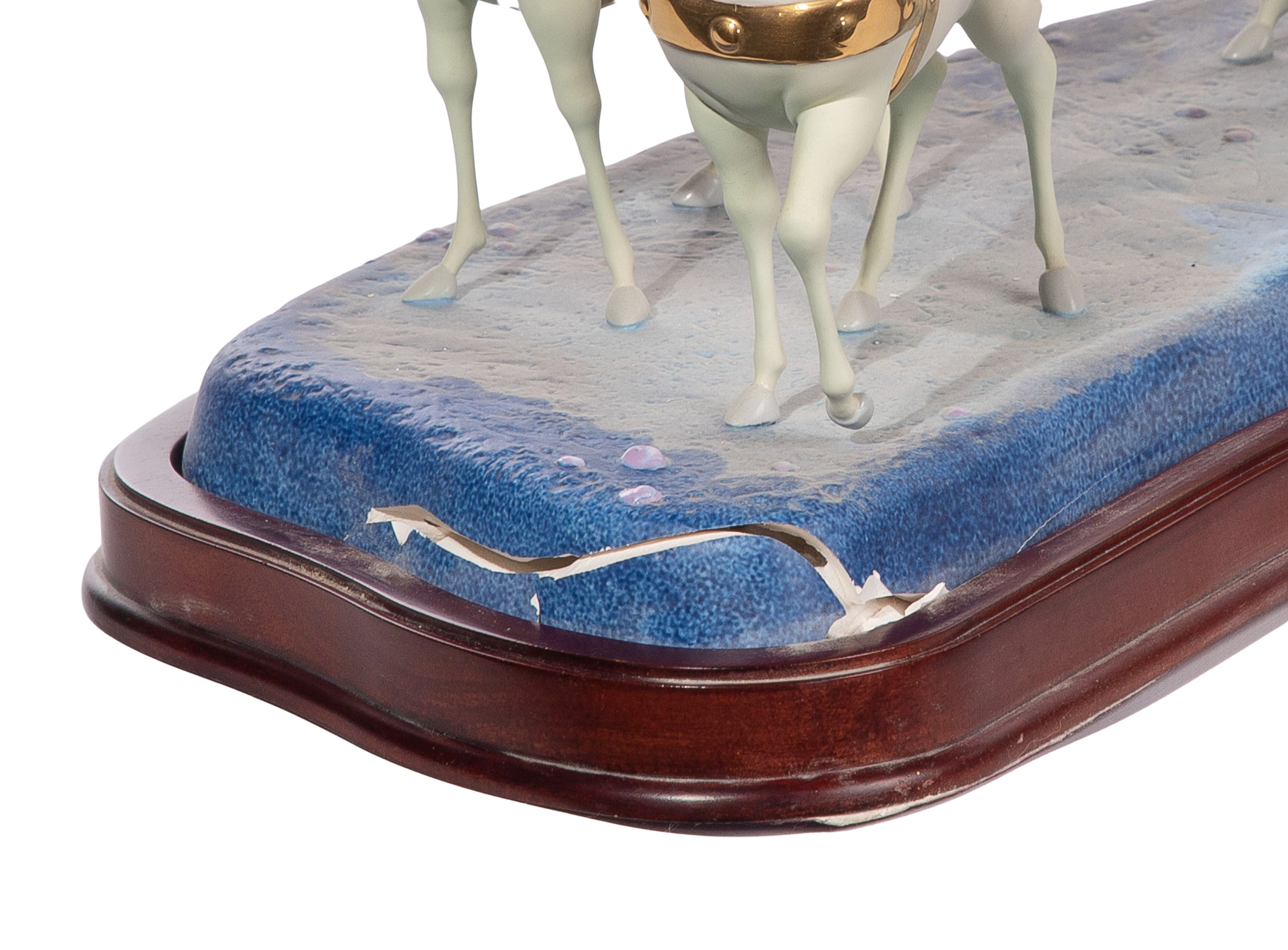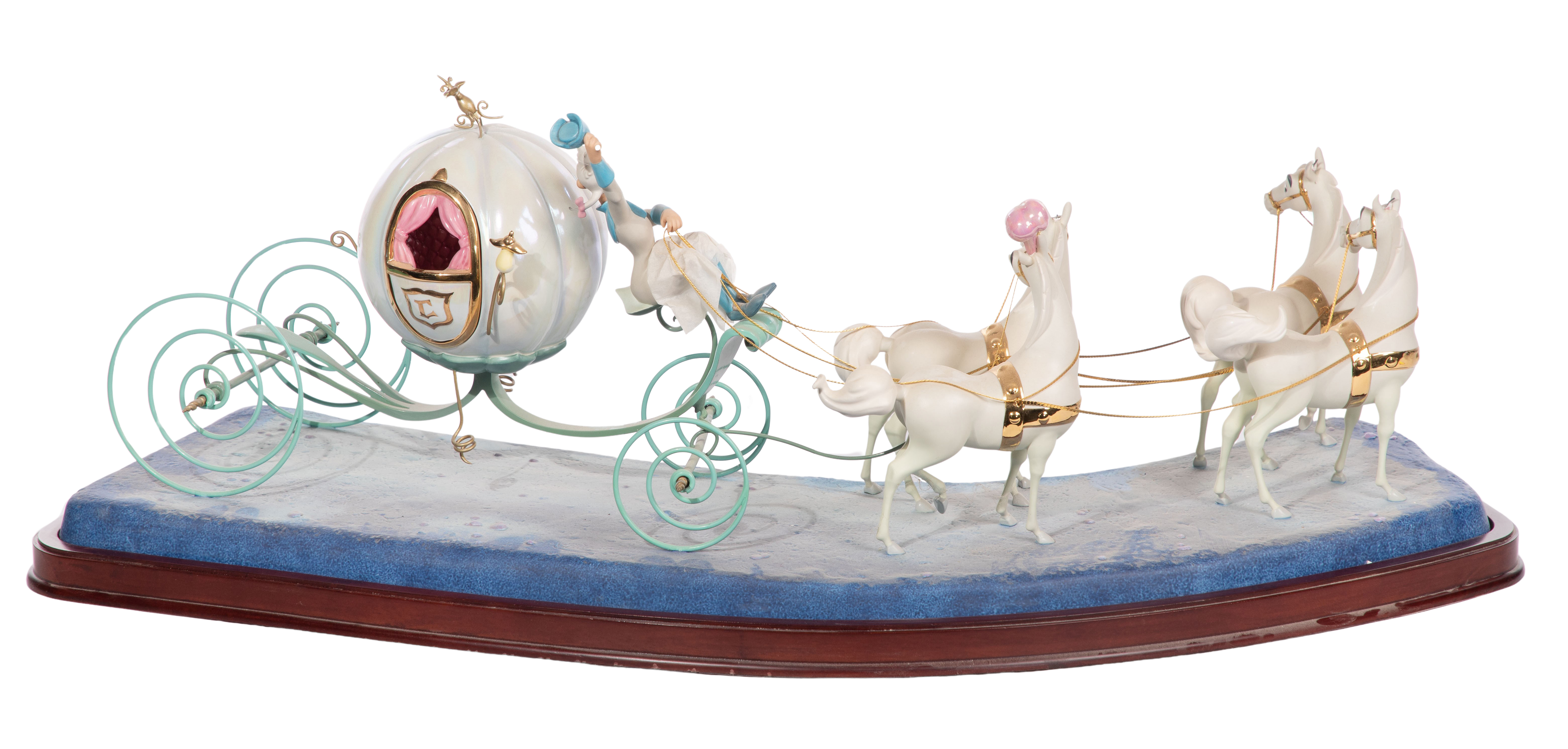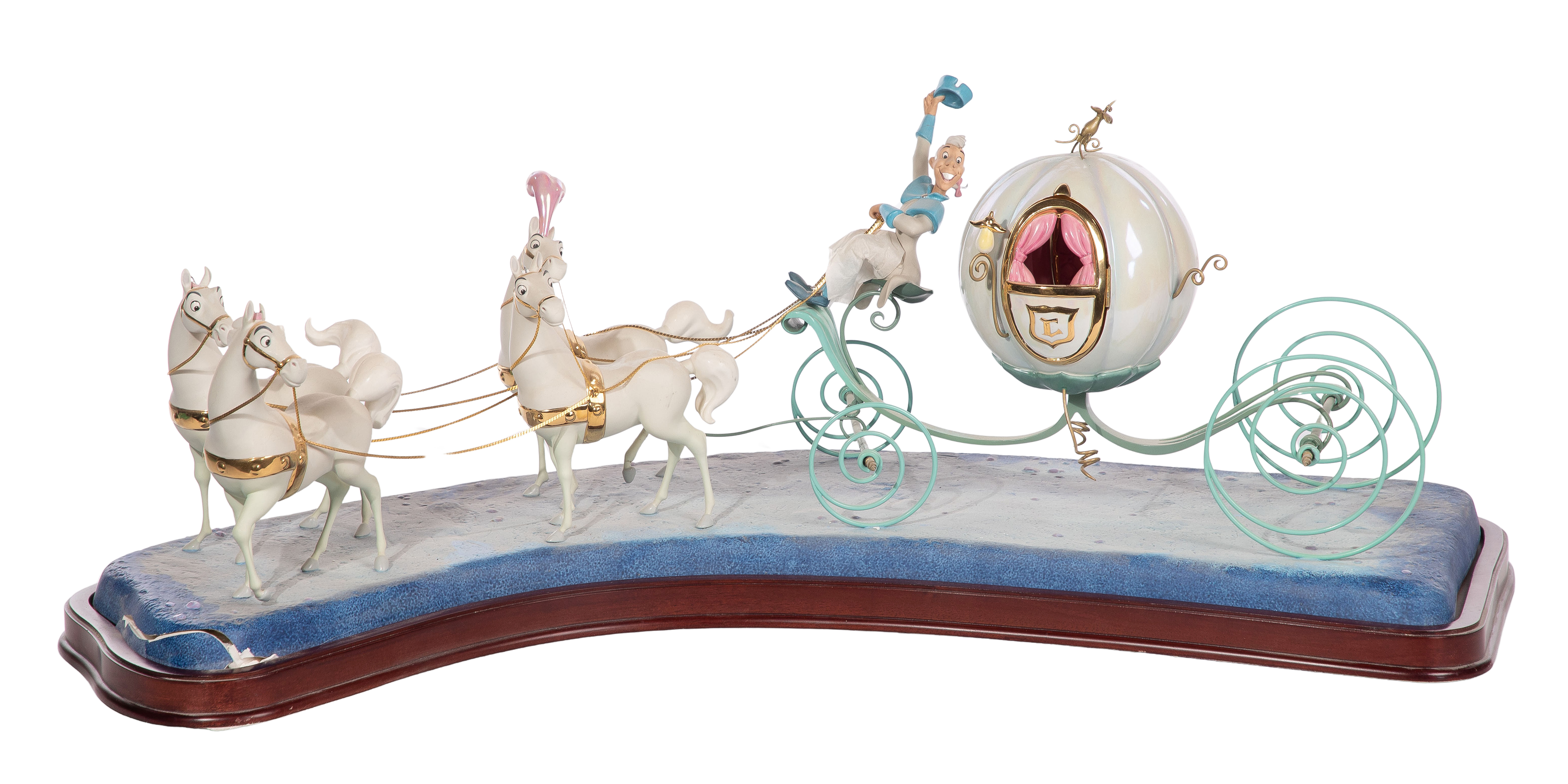 Condition: lacking separate Cinderella figurine, coach having breaks to porcelain base, broken plumes to three horses (present, bagged), bent finial, footman broken off at ankles