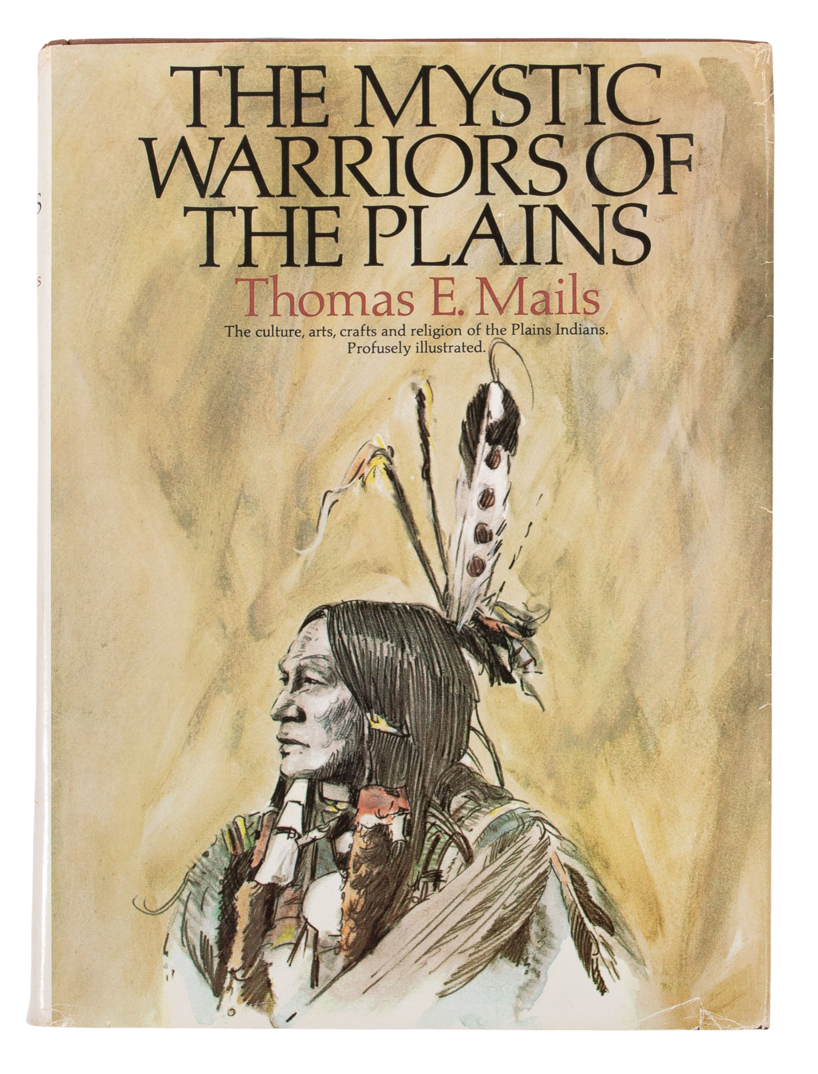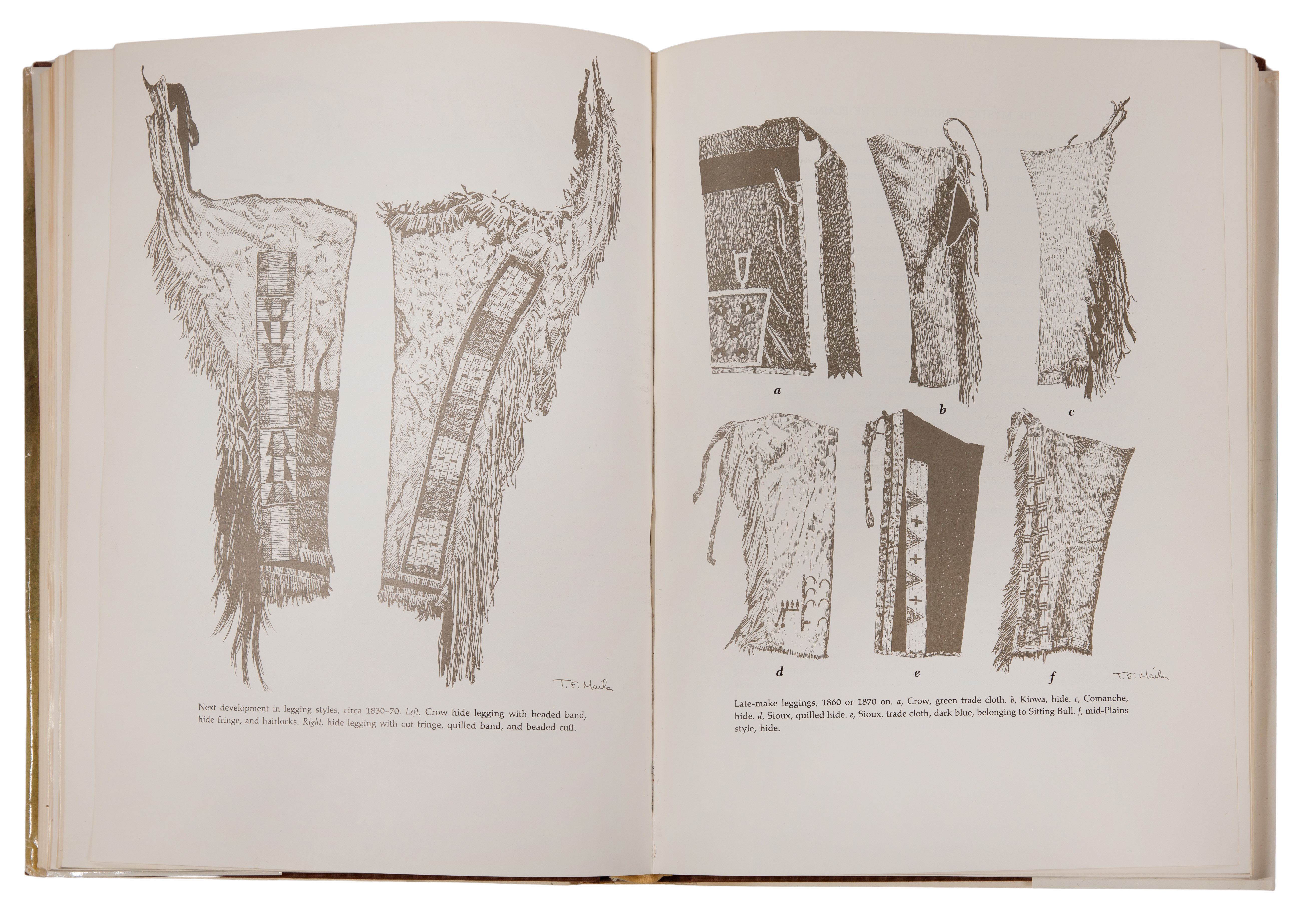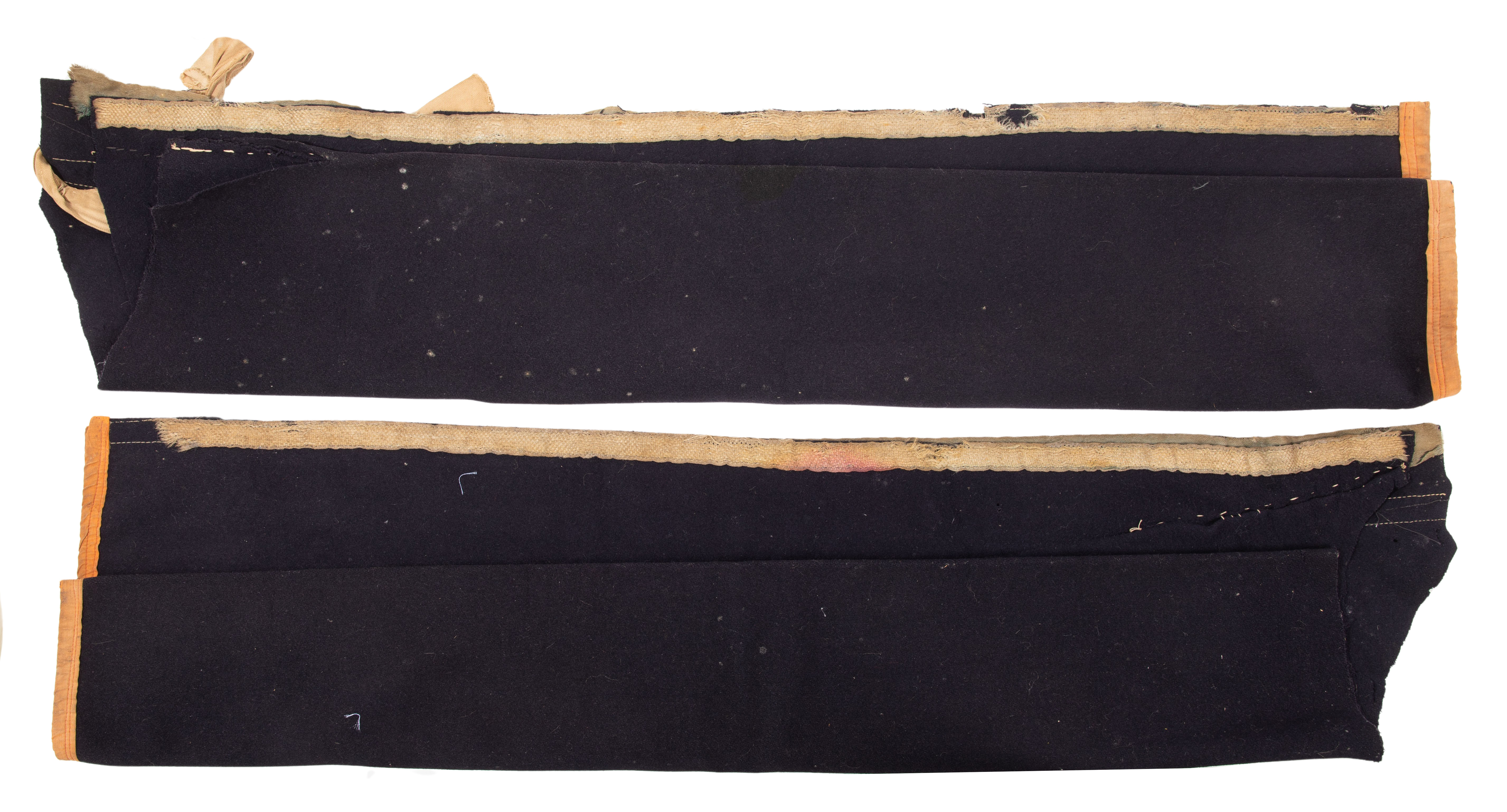 c.1870, a pair of dark blue (almost black) trade cloth dance leggings, reportedly belonging to Sitting Bull, trimmed with bands of color cloth including flat braid US uniform trim and having tipi and cross on white ground lazy stitch beadwork on tanned hide sewn to the cloth; together with ‘Mystic Warriors of the Plains’ by Thomas Mails, 1972, hardcover in dust jacket, having an illustration of these leggings on page #331, a description in text on page #328