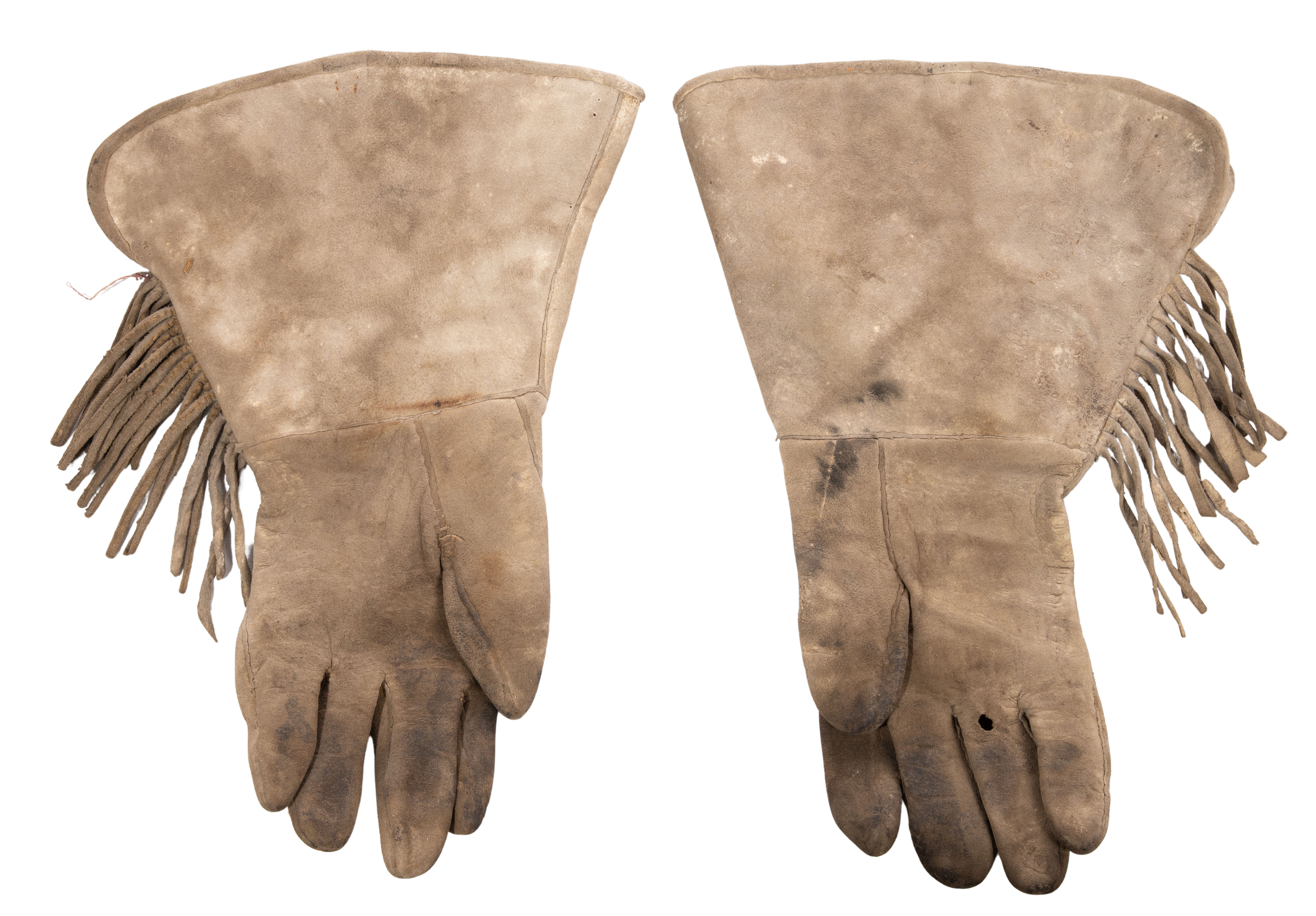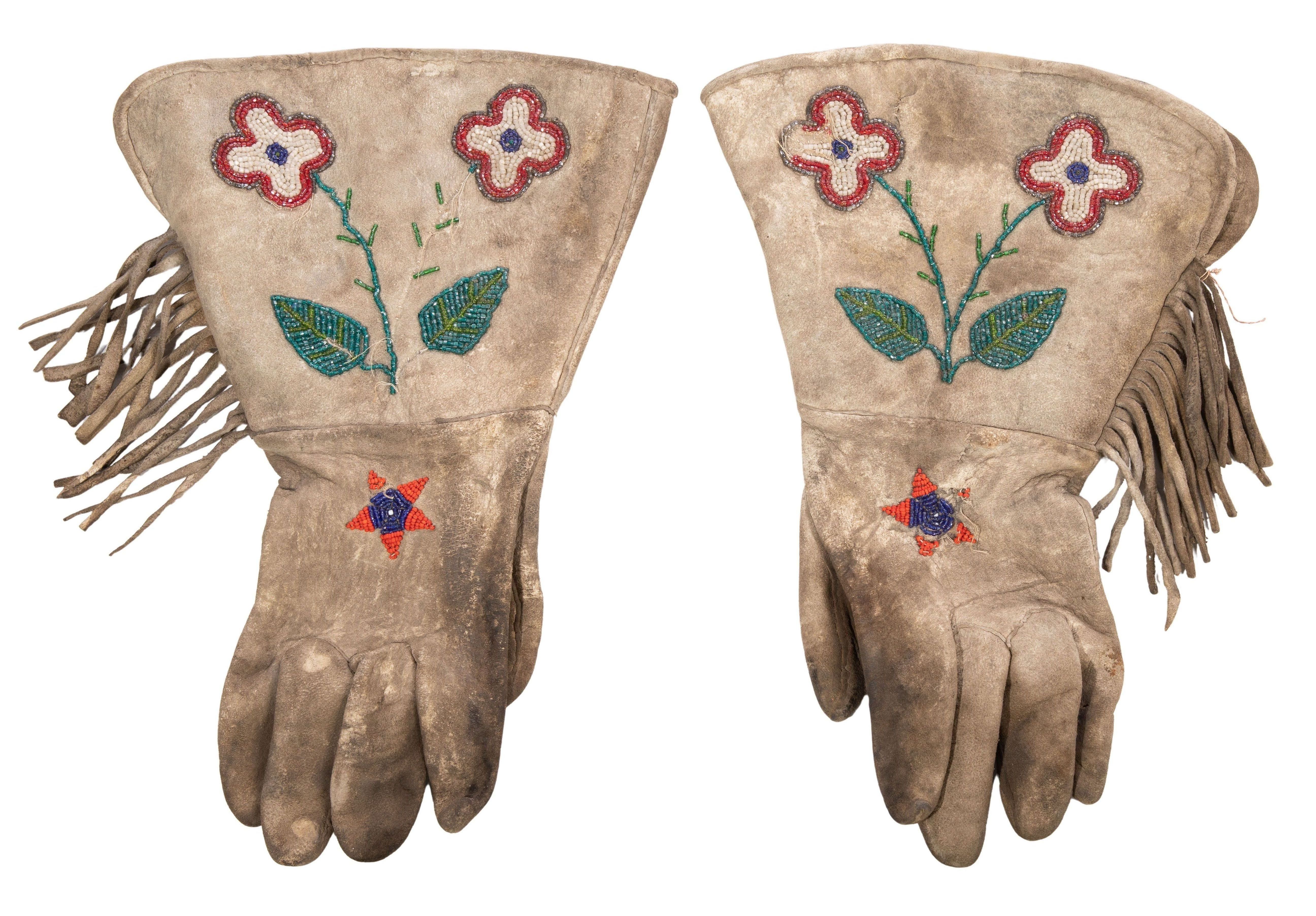 Condition: overall moderate to heavy wear consistent with age and normal use, buckskin having areas of brittleness, holes from use, some loose or missing threads and beads, dirt accumulation