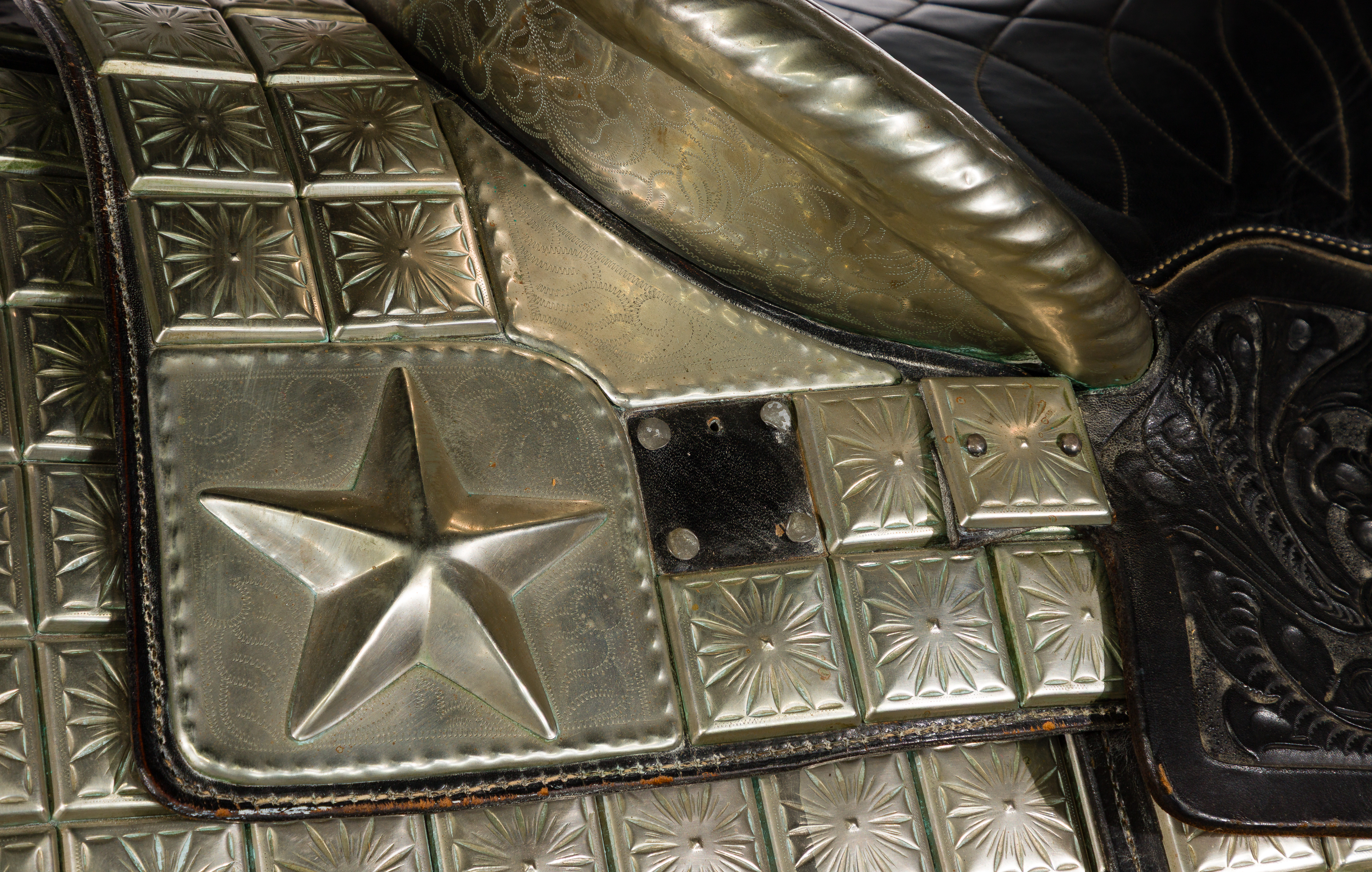 Full rig, floral hand-tooled leather saddle accented in square exploding star silver armor and a Texas star, including breast collar, serape, headstall, bit, reins and long silver covered tapaderos