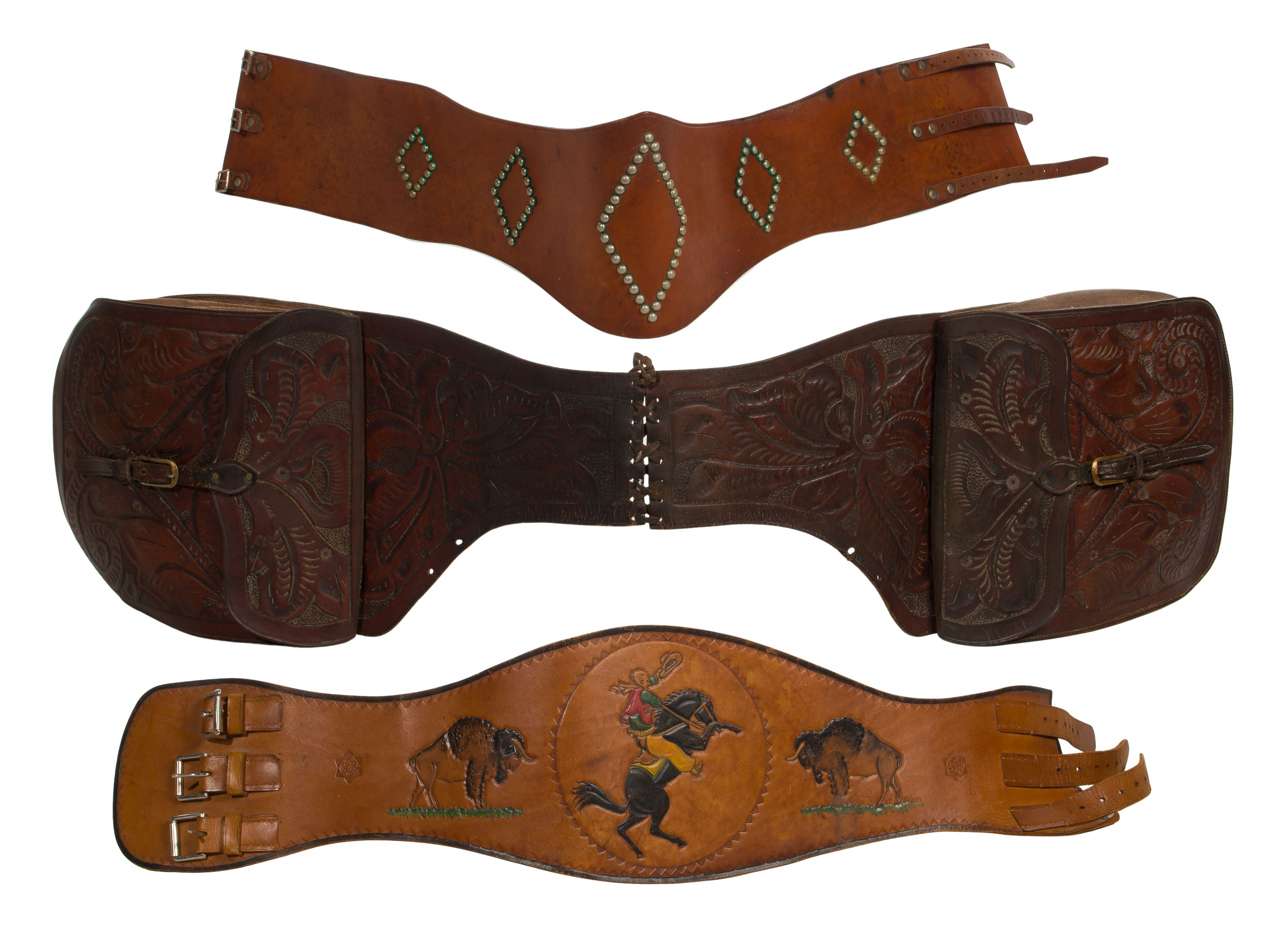 (3) items including a belt having an embossed buffalo and horse motif, a belt having a studded motif and a saddle bag having an embossed floral motif
