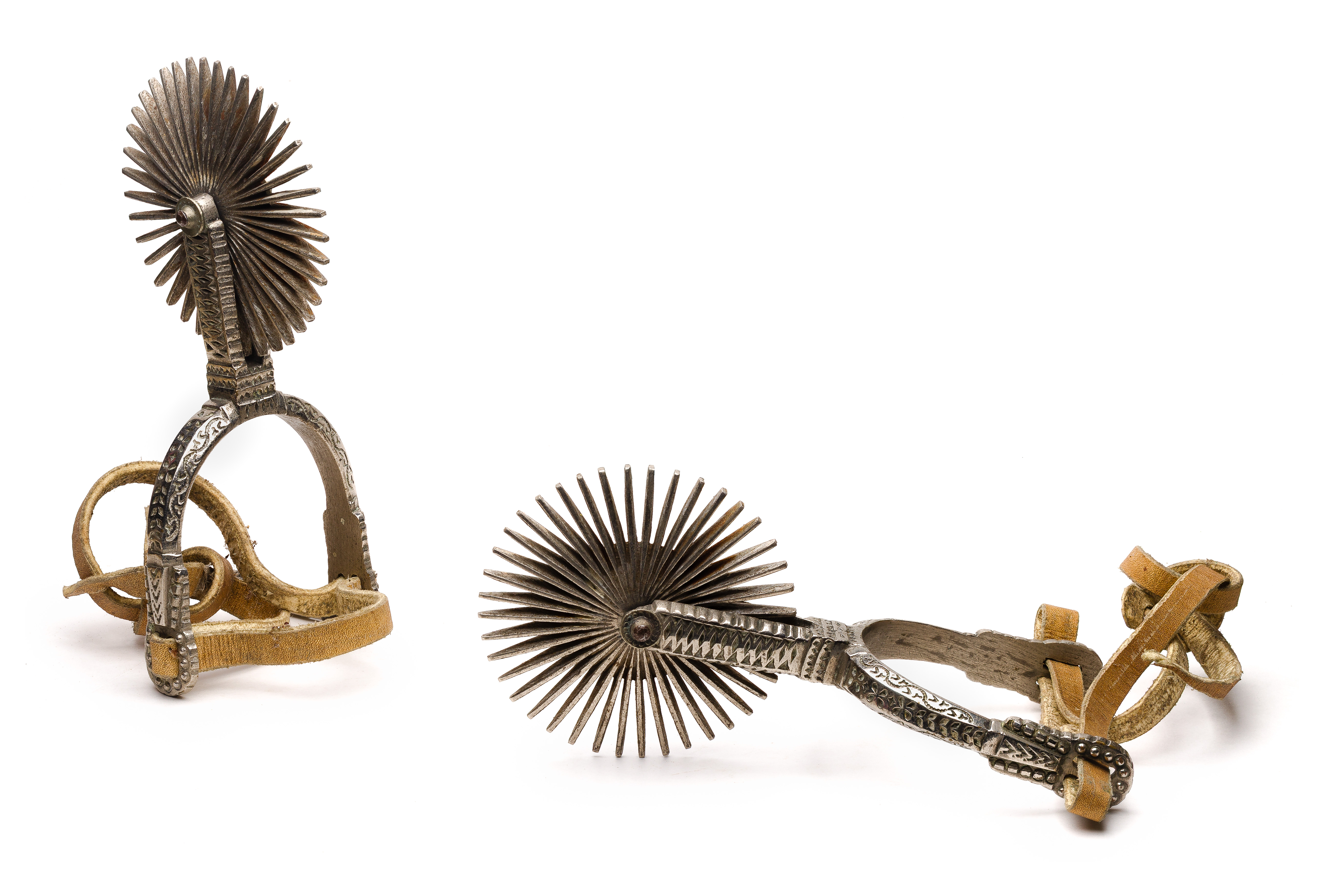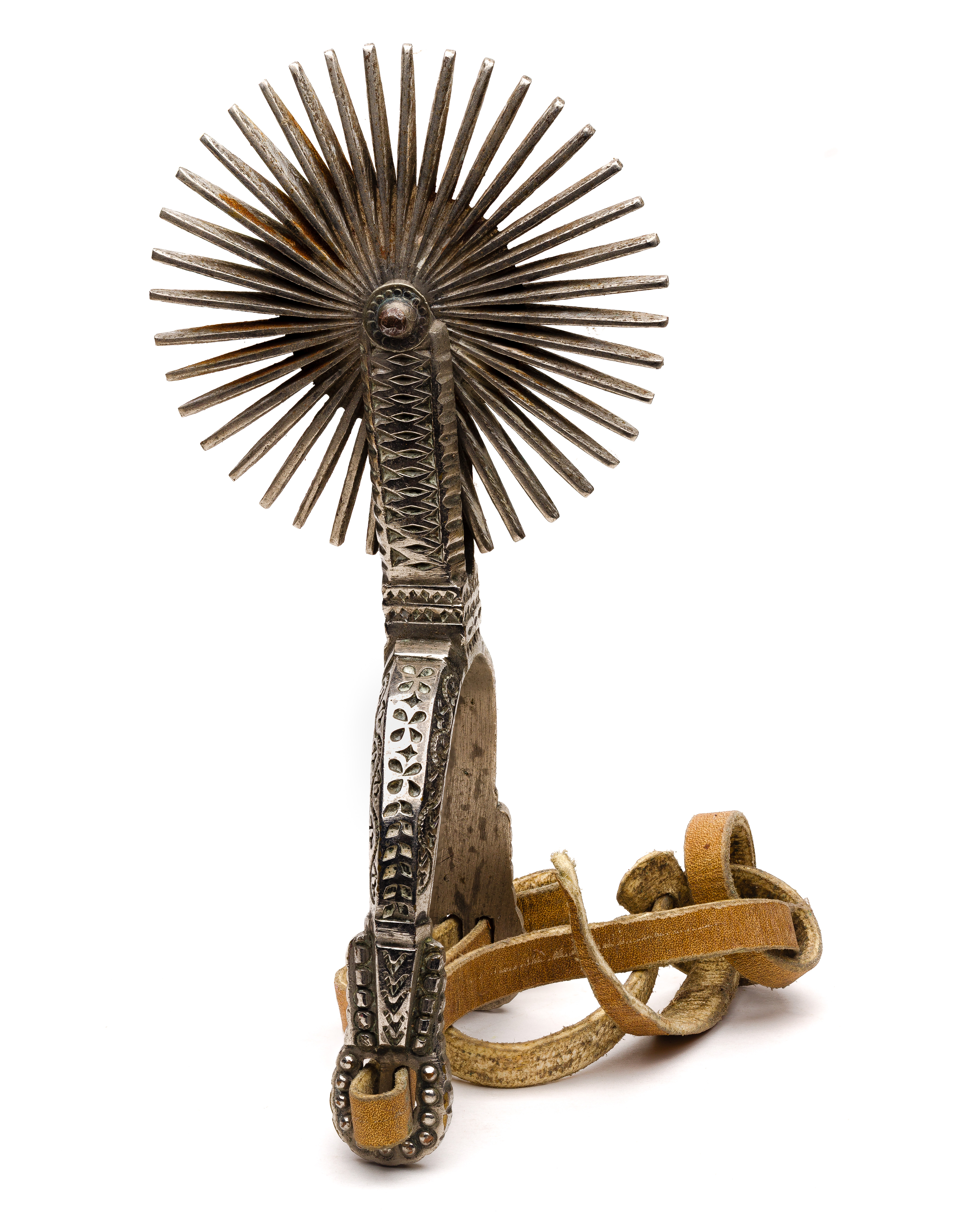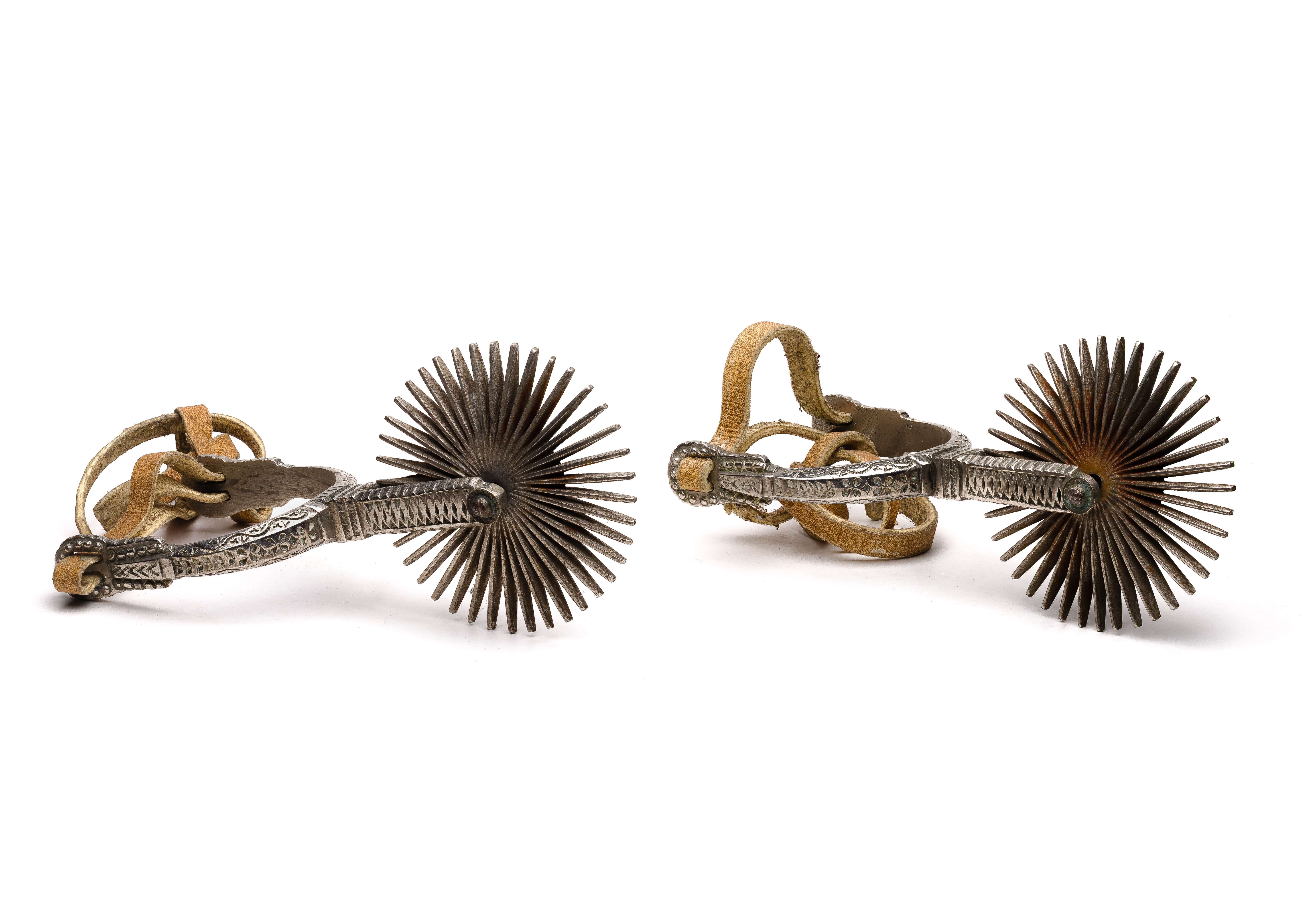 A pair having overall cast and stamped decoration, 4-inch diameter 29-point rowels and leather straps