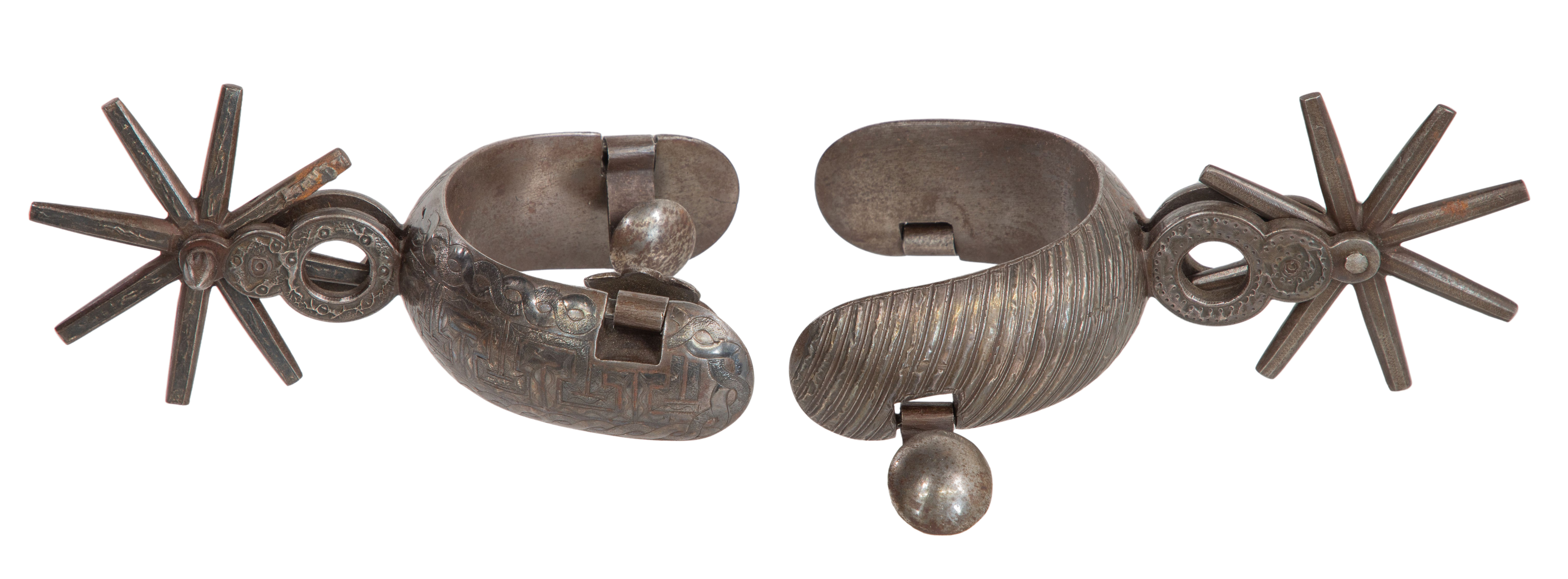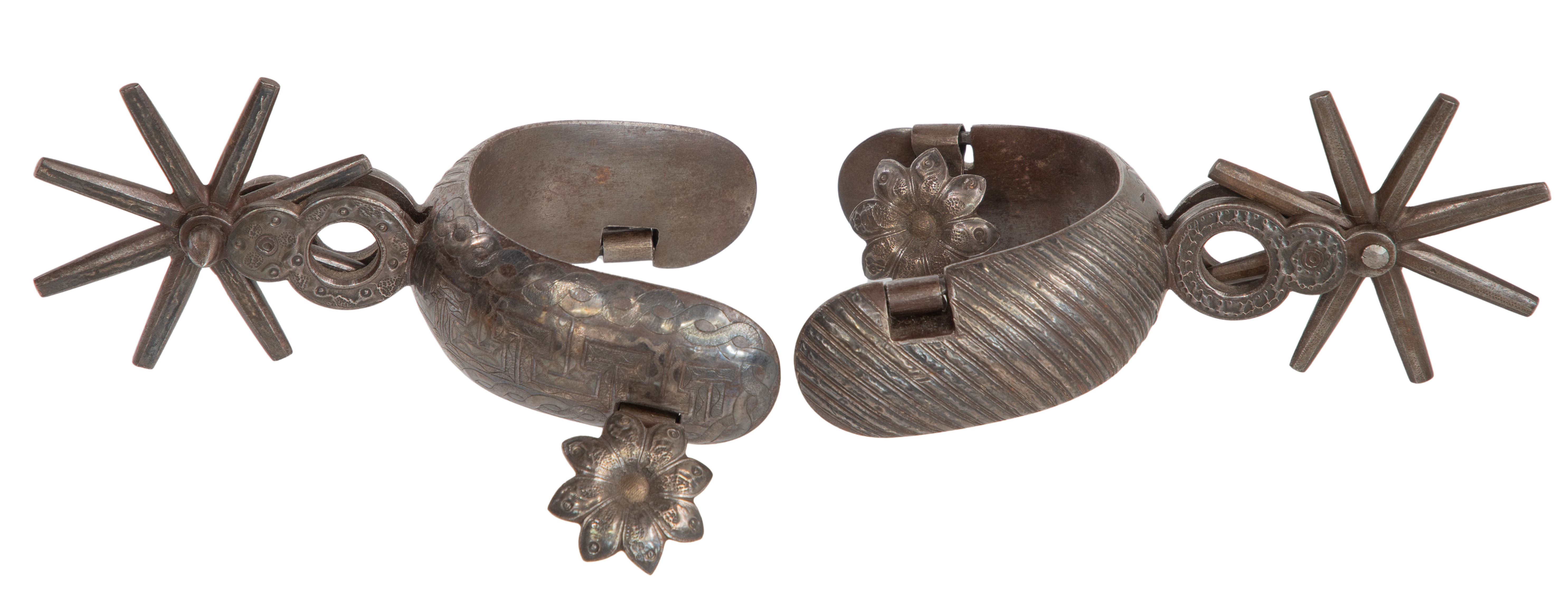 A pair of steel spurs having engraved delineation of silver overlay, floriform buttons and 8-point engraved rowels