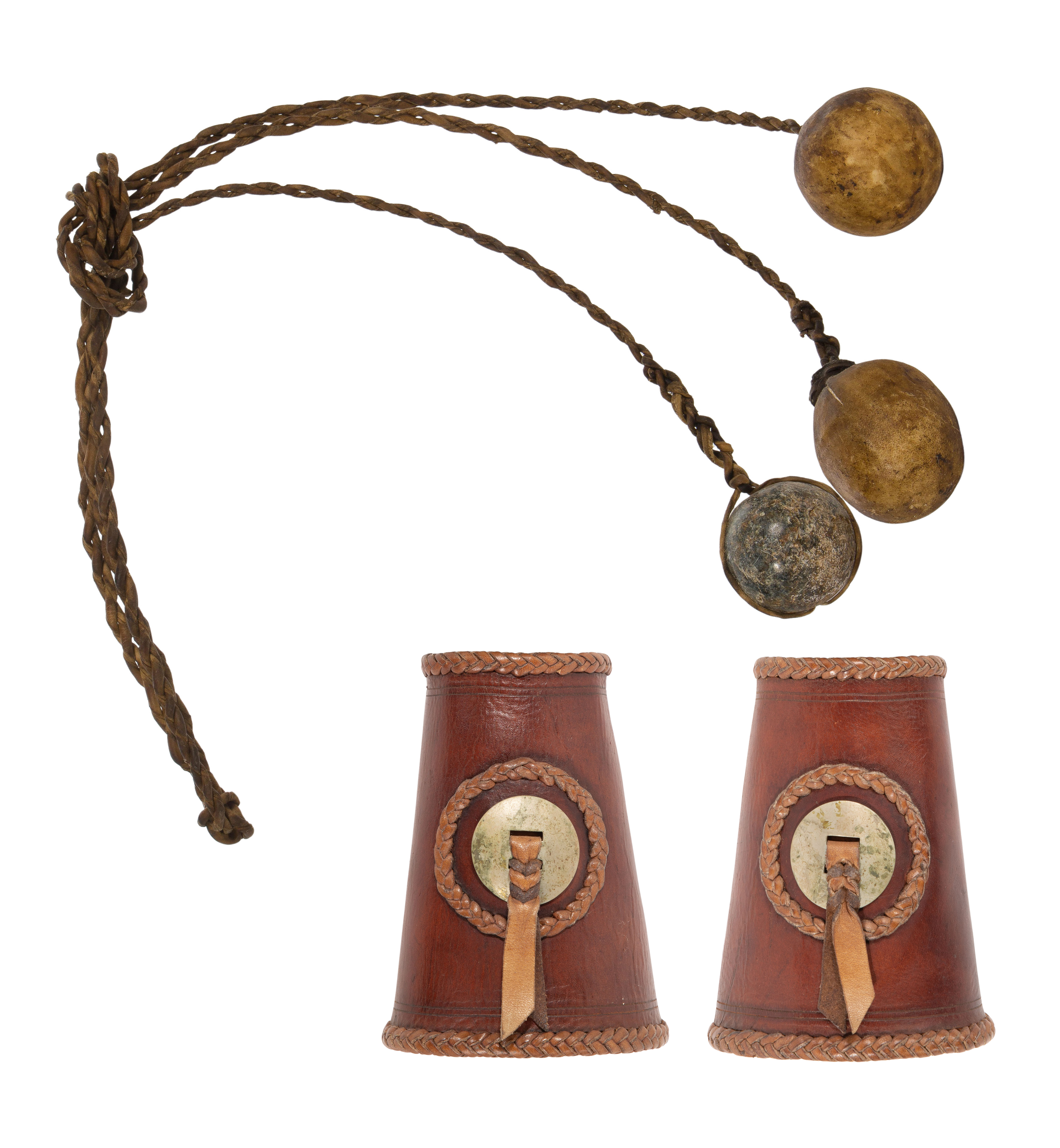 (2) total items including a pair of cuffs having conchos and braided edge trim; together with a 29-inch long Gaucho bolas lasso having two rawhide covered stones and a drilled and strap-wrapped stone on braided leather cords