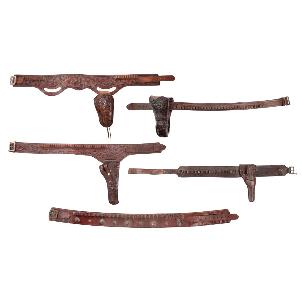 (5) items including (4) tooled leather belts with holsters from makers Lawrence, Slim Williamson and WRT as well as a money belt having conchos