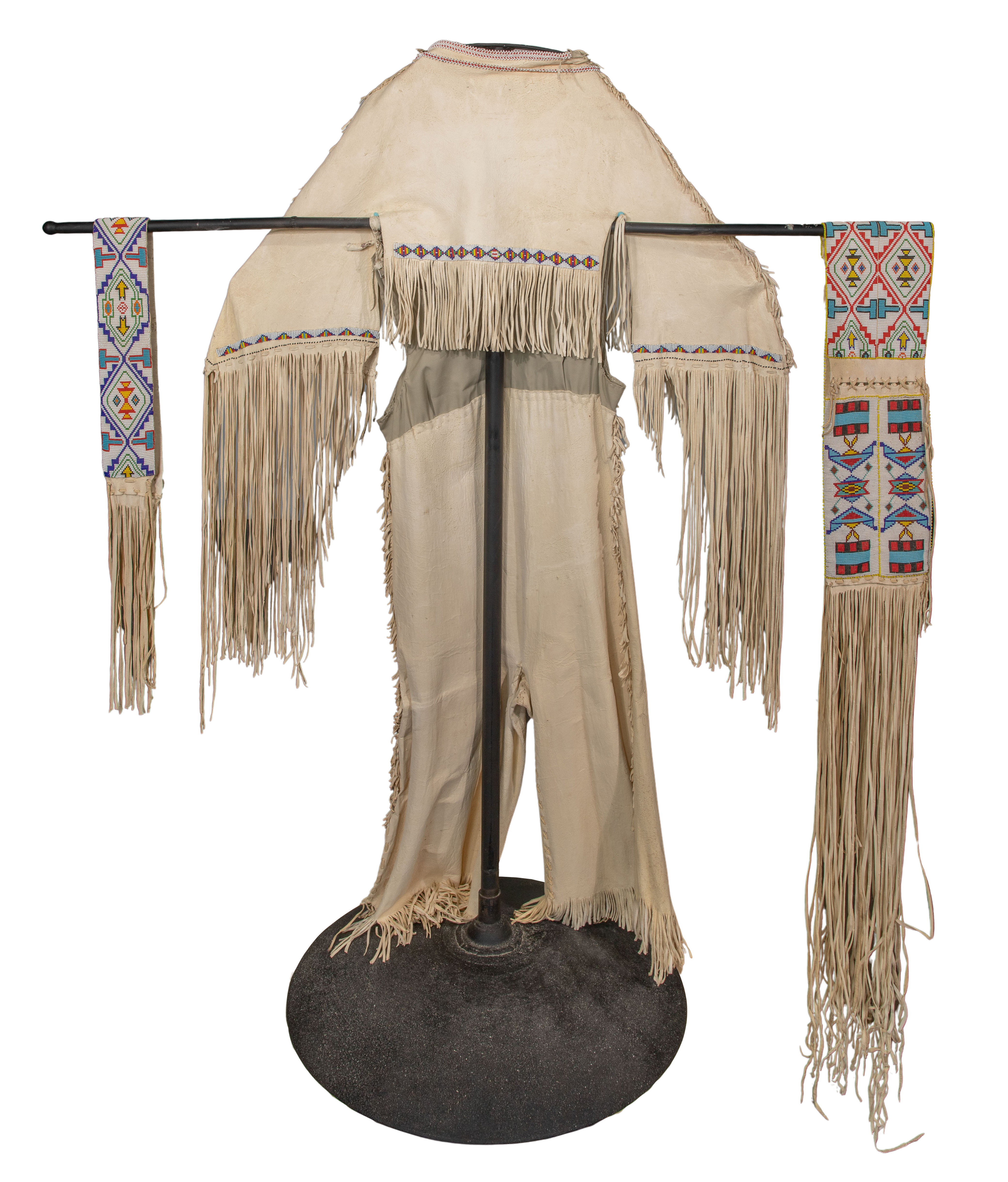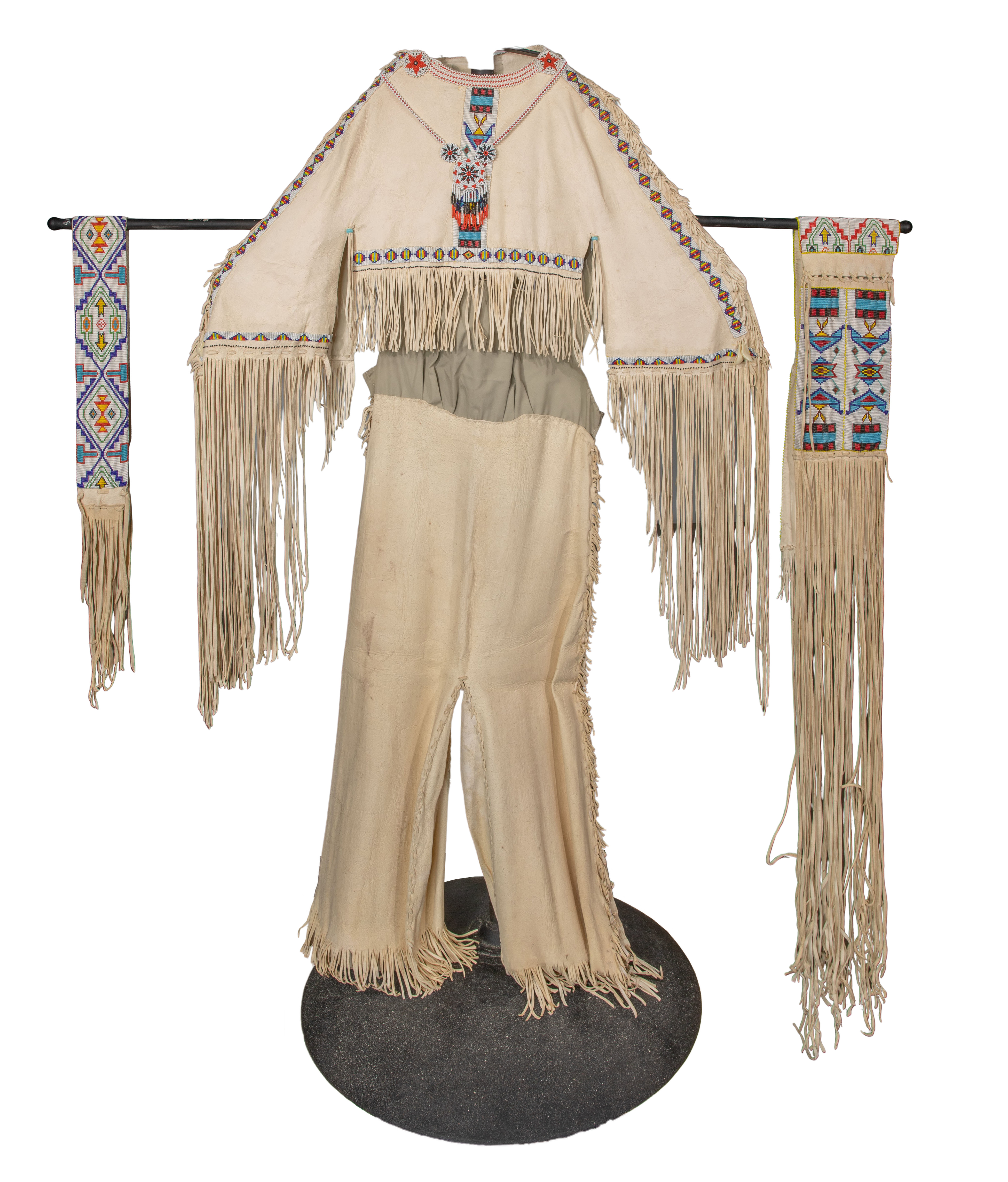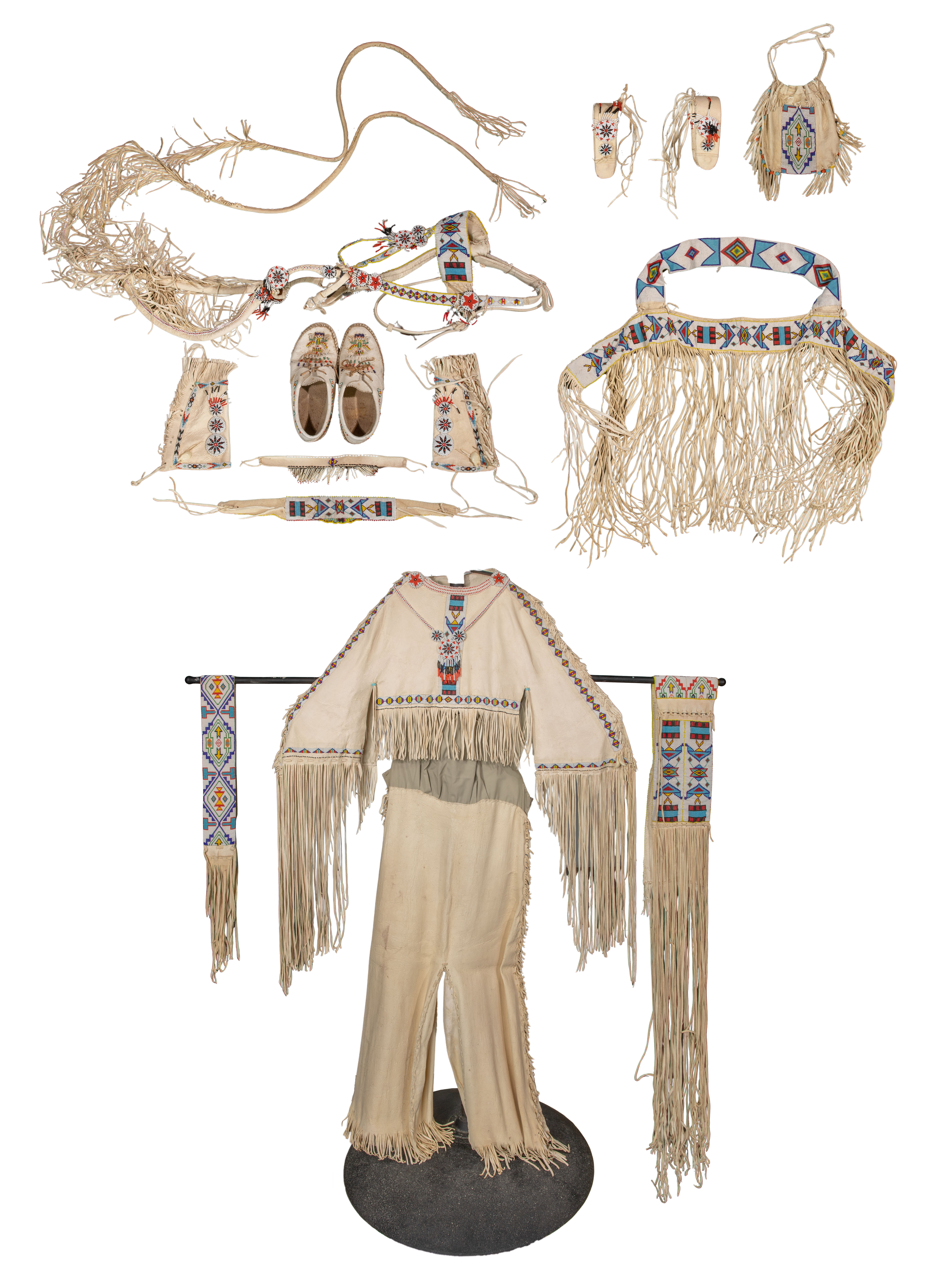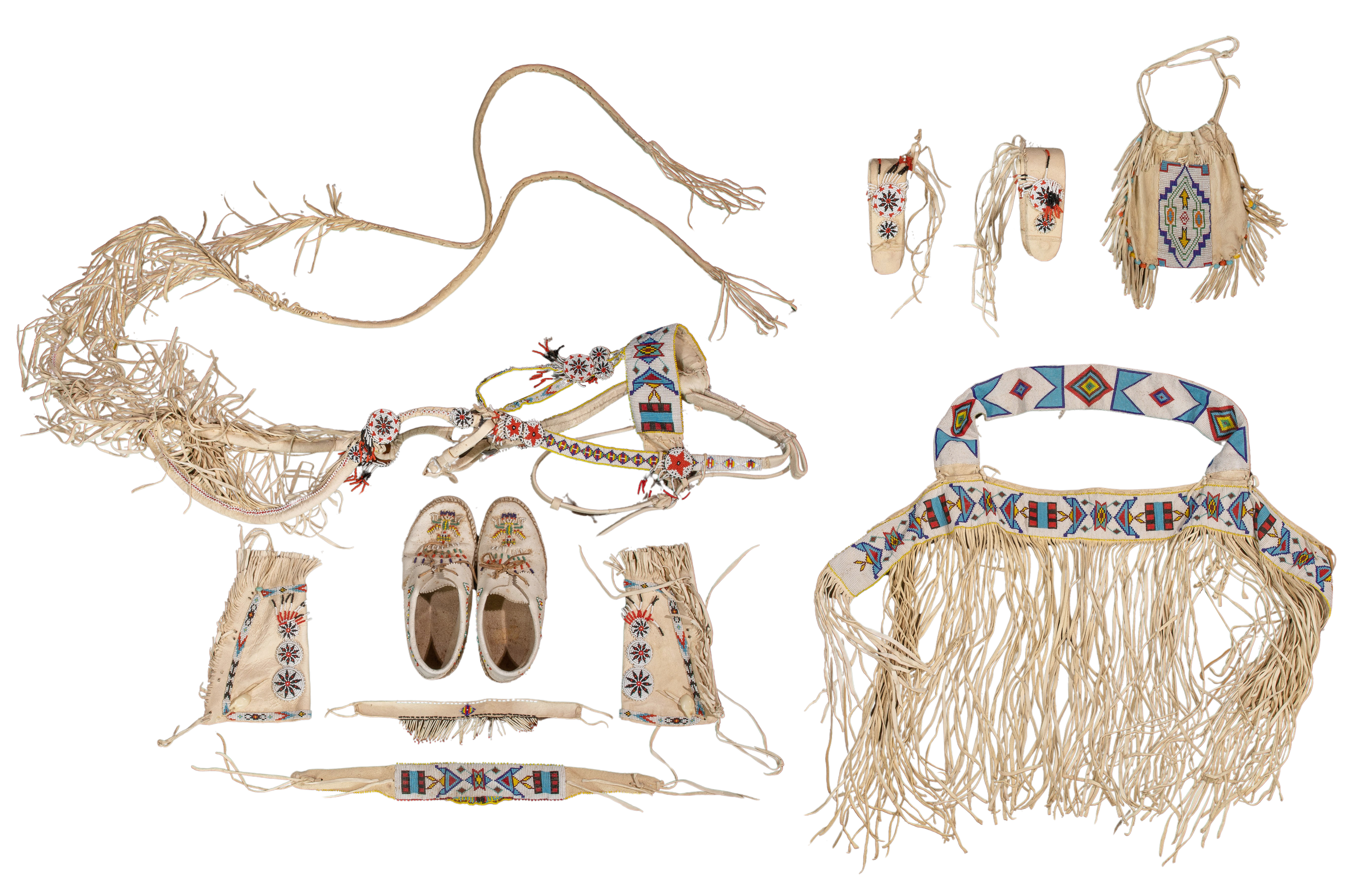 A 12-piece set of beaded buckskin including a shoulder cape / shirt, trousers, a necklace, a pair of cuffs, a pair of moccasins, a headband, an armband, a pouch, a horses neck drape, a pair of saddle drapes, a bridle and reins and a pair of stirrups
